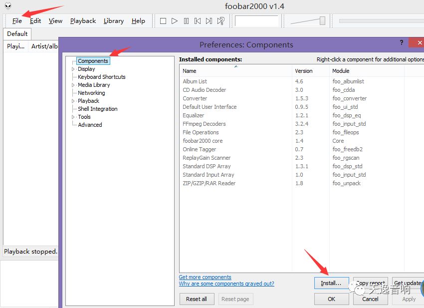 (2).下載好軟件及其插件后,點擊foobar2000的File----Preference----Components----Install,雙擊Foo_upnp,之后重啟Foobar2000,就可以使用。