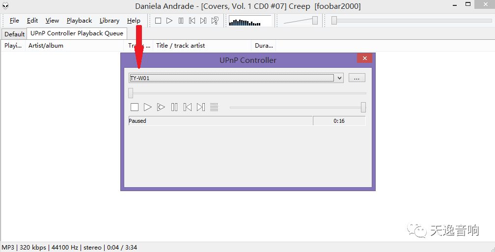 (4).點擊View----UPNP Controller,在下拉菜單中選擇設(shè)備設(shè)備天逸TY-i30/TY-W01,就可以完成Wifi推送播放的過程。Foobar2000支持無損APX、FLAC等高清音樂格式,可直接拖入播放。
