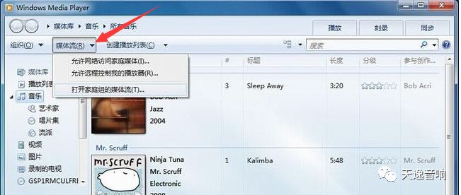 (1).選擇本地音樂打開方式為windows media player,進入圖中界面,選擇媒體流,打開家庭組的媒體流。