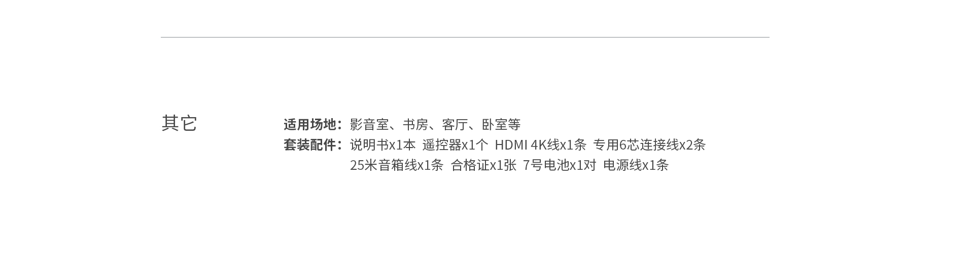 套裝配件:說明書×1本、遙控器×1個、HDMI 4K線×1條 合格證×1張、7號電池×1對、電源線×1條、主音箱連接線×1對
