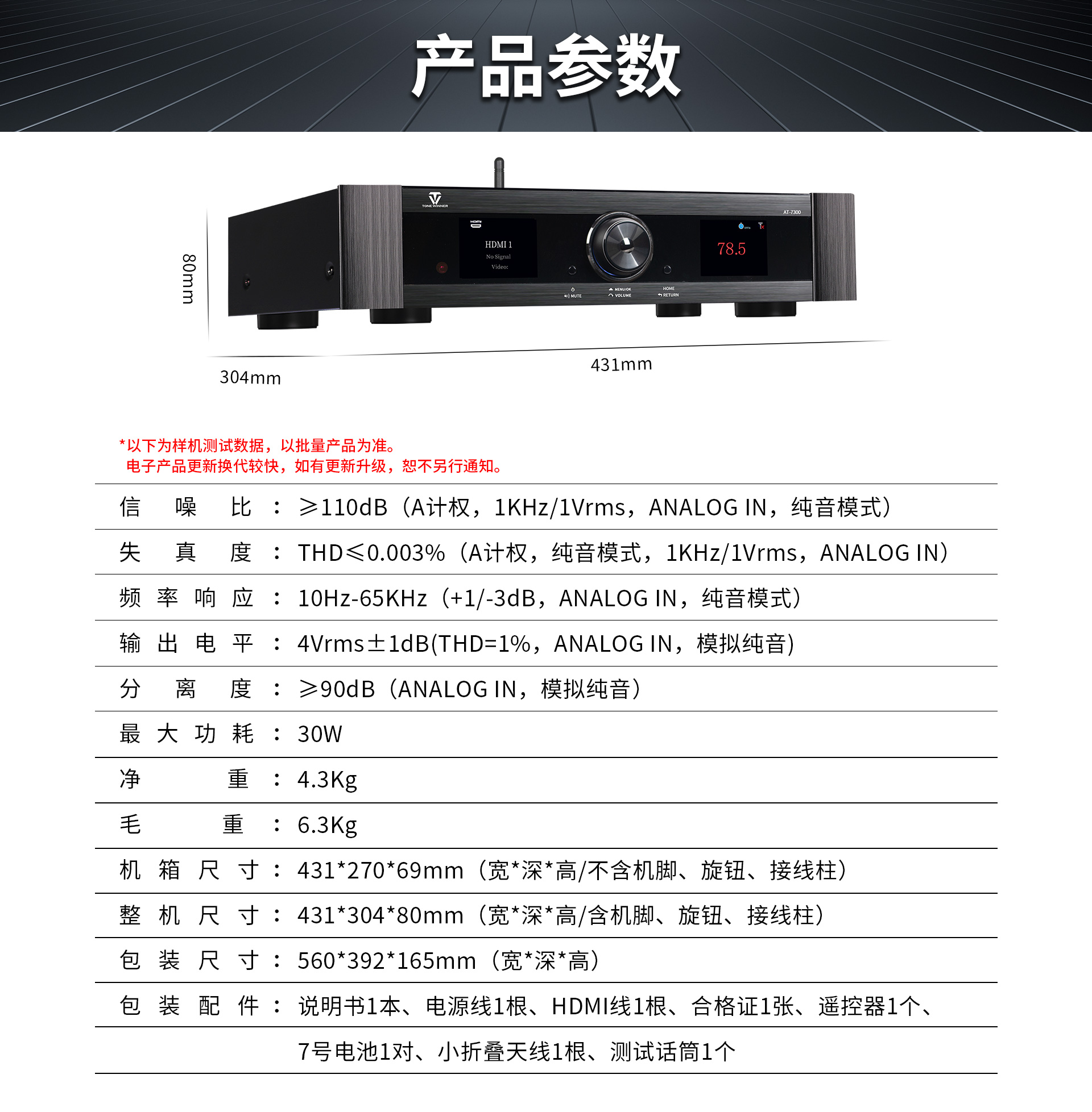 包裝配件:說明書1本、電源線1根、HDMI線1根、合格證1張、遙控器1個、 7號電池1對、小折疊天線1根、測試話筒1個 | 其他:/ |
