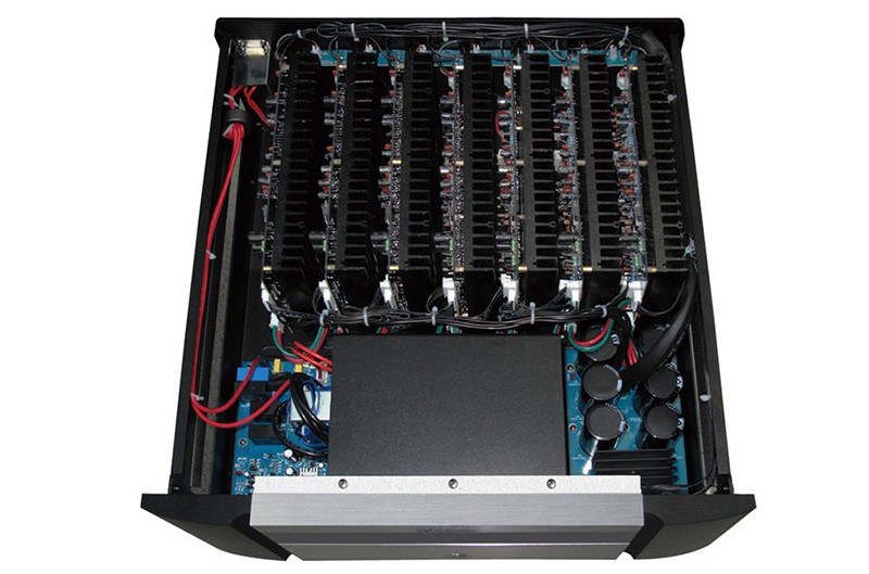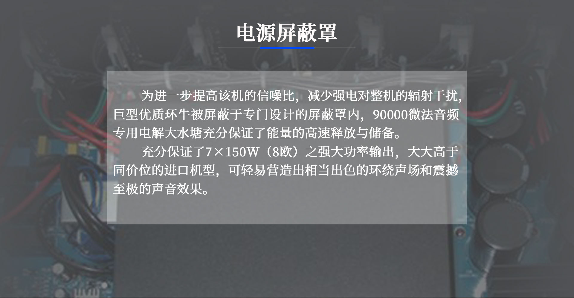 二、電路設計 該功放電路采用了全平衡、超低失真、高速HI-FI高保真功放經典電路,7聲道完全獨立,,完全按照HI-FI高保真高速功放電路的理念和工藝設計制造,并采用先進、方便的積木式的接插印制電路板結構,有利于減少各聲道的相互干擾,有利于散熱和維修,大大提高了該機的信噪比。 開蓋可見,該機的電路設計極為嚴謹,工藝整齊、走線規范,選材用料極為講究,整體結構頗有工業化大廠設計的風范。 為進一步提高該機的信噪比,減少強電對整機的輻射干擾,巨型優質環牛被屏蔽于專門設計的屏蔽罩內,90000微法音頻專用電解大水塘充分保證了能量的高速釋放與儲備。大大高于同價位的進口機型,充分保證了7×150W(8歐)之強大功率輸出。可輕易營造出相當出色的環繞聲場和震撼之極的聲音效果。