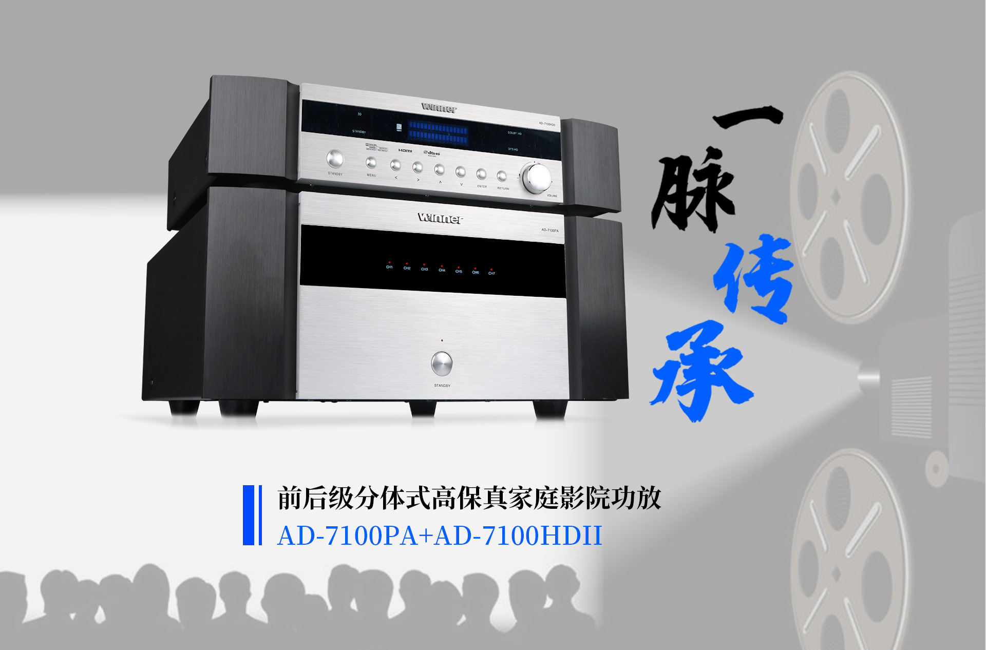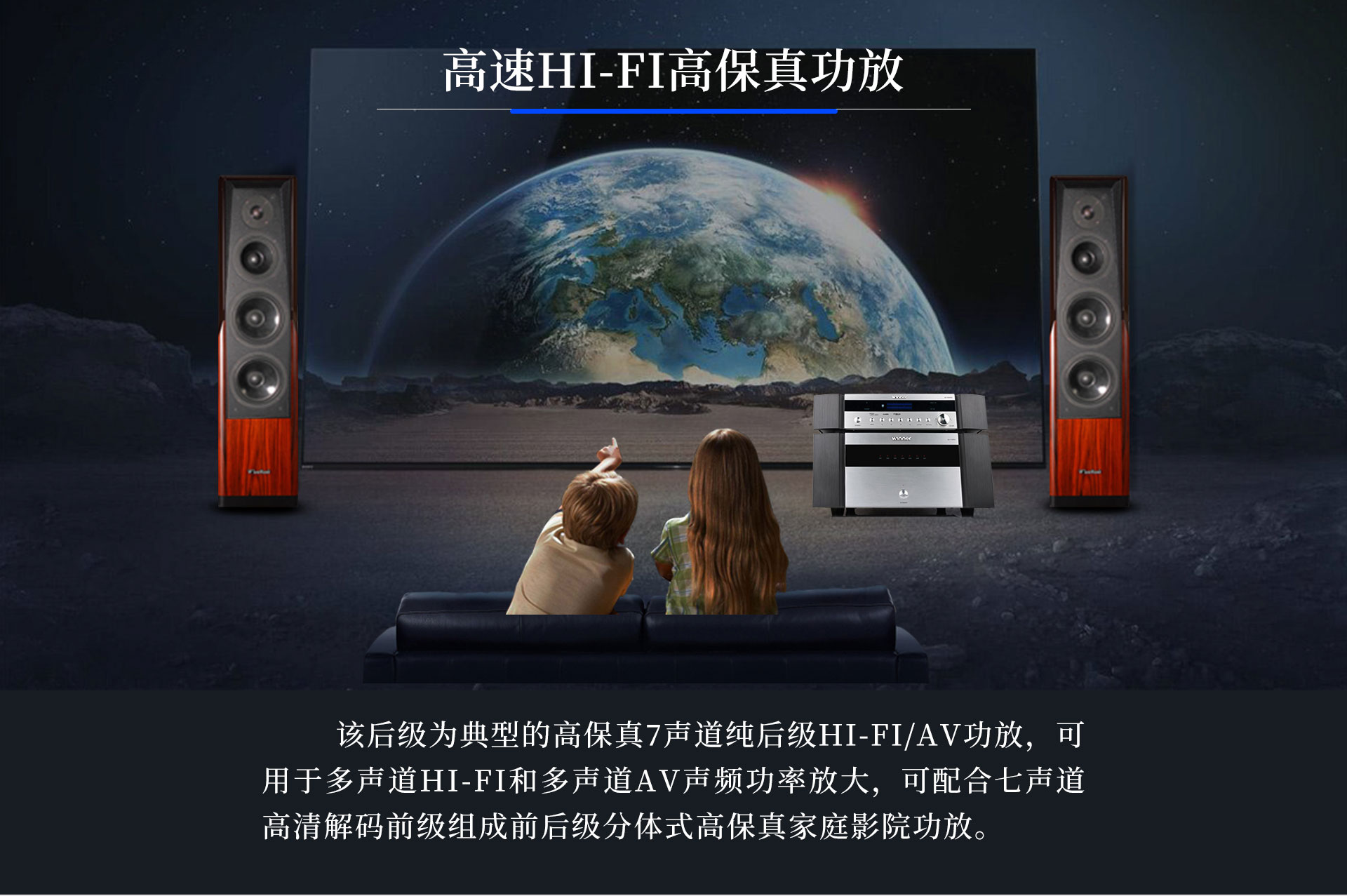 三、主要功能表述 實際使用,可以搭配我公司的 AD07100HD 7.1聲道高清解碼前級,也可以搭配AD-7100HDII、HD100、HD100E的解碼前級組成各種不同檔次的多聲道分體式家庭影院綜合功率放大器。實際聽感:該功放的音質細膩、細節豐富;音色美艷、中頻飽滿、低頻結實,大氣磅礴,看碟的效果非常過癮,極致震撼!聽純CD碟的效果也極有音樂味,是一款剛柔并重、AV/HI-FI兼容效果突出的高端多聲道純后級。 該后級為典型的高保真7聲道純后級HI-FI/AV功放,可用于多聲道HI-FI和多聲道AV聲頻功率放大,可配七聲道高清解碼前級組成前后級分體式高保真家庭影院功放。