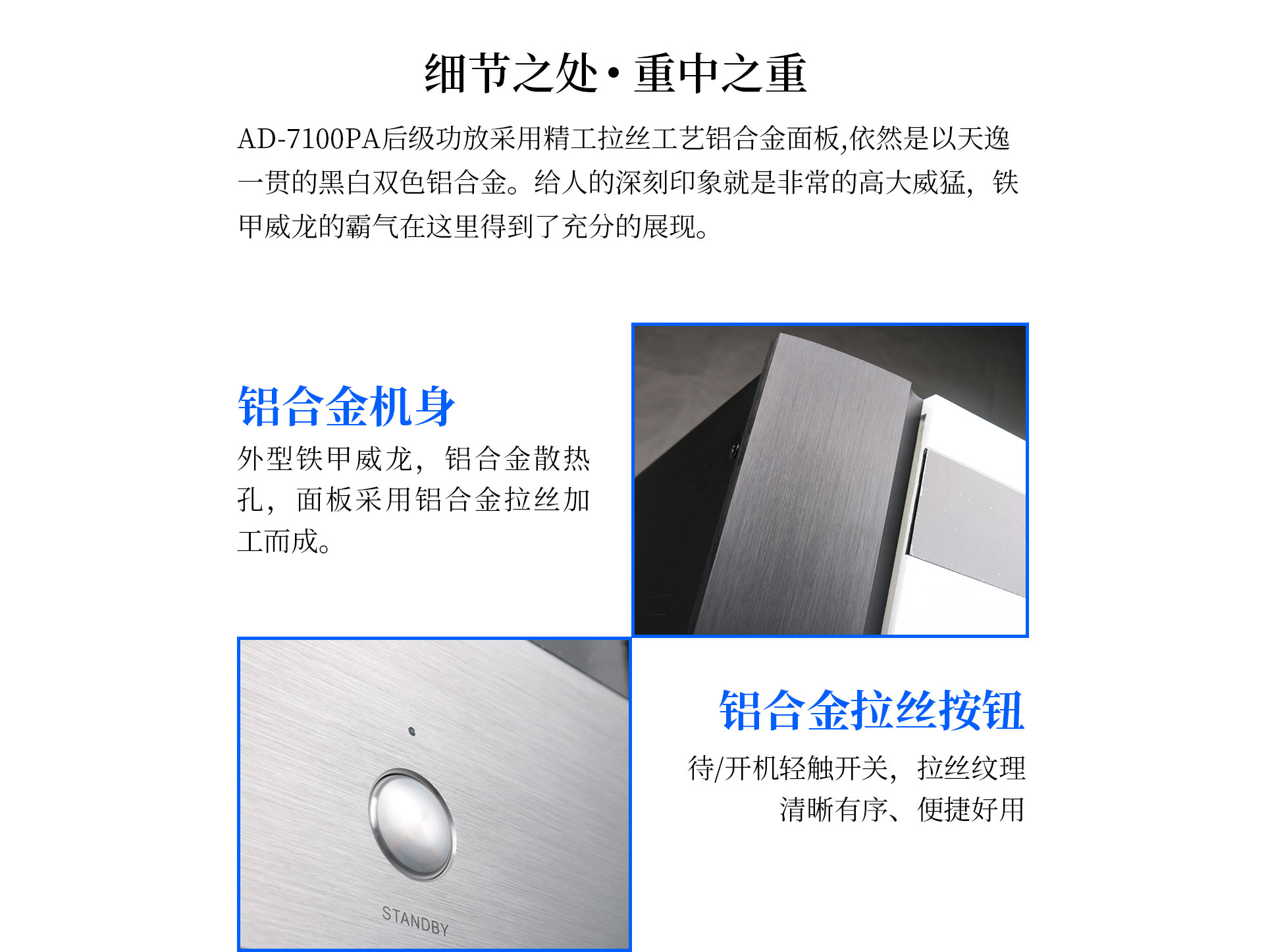 AD-7100PA高保真純后級功放概述 一、外觀特點 AD-7100PA后級功放了精工拉絲工藝鋁合金面板,依然是以天逸一貫的黑白雙色鋁合金。給人的深刻印象就是非常的高大威猛,鐵甲威龍的霸氣在這里得到了充分的展現。
