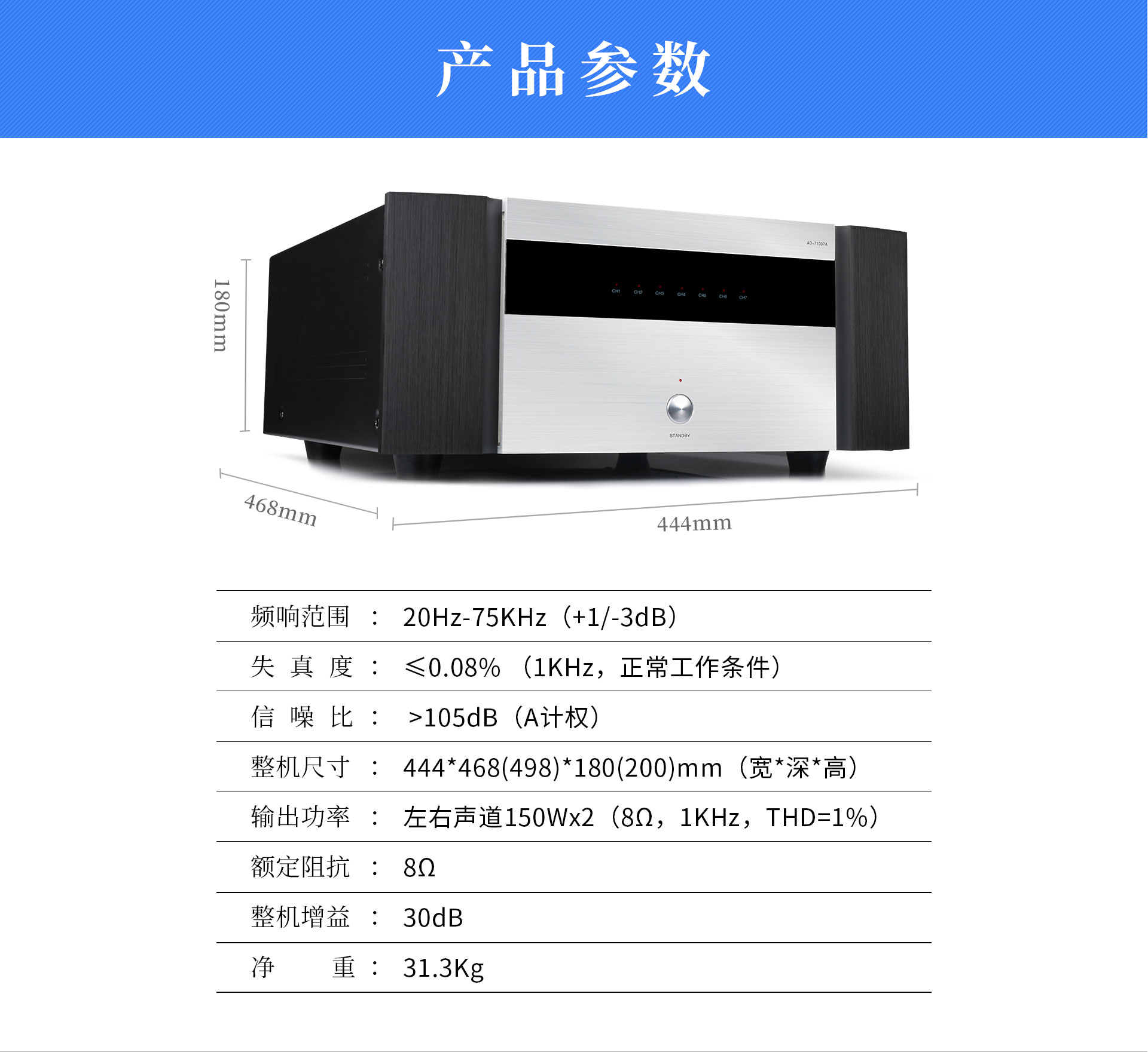 四、產品主要性能指標 產品型號:AD-7100PA 聲道數:7 信噪比:105dB(A計權) 頻響范圍:20Hz-75KHz(+1/-3dB) 每聲道輸出功率:左聲道+右聲道150W×2(8Ω,1KHz,THD=1%); 中置聲道150W(8Ω,1KHz,THD=1%) 額定阻抗:8Ω(適配阻抗4-8Ω) 分 離 度:75dB 整機增益:30dB 產品材質:鋁合金 外觀顏色:黑銀色 凈 重:31.3Kg 毛 重:35.4kg 整機尺寸:444×180(200)×468(498)mm(寬×高×深) 包裝尺寸:570×330×616mm(寬×高×深) 隨機附件:產品說明書,產品裝箱單,保修單,電源線,信號線 適用場合:客廳、定制安裝、體驗室、會所、影K試音間等高端影音間 *更多精彩介紹請點擊【經典評測】了解。