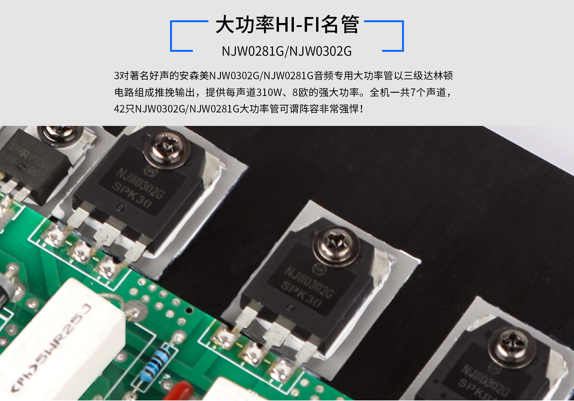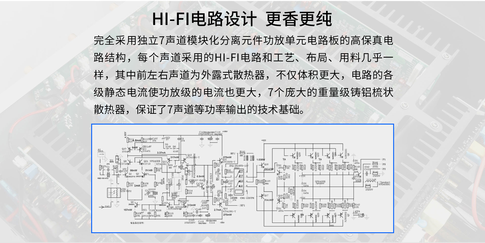 二、工藝及電路設計 完全采用獨立7聲道模塊化分離元件功放單元電路板的高保真電路結構、說得更直白一點,這就是一臺具備7個獨立聲道放大的高保真后級功放,而且每個聲道所采用的HI-FI電路和工藝、布局、用料幾乎完全一樣,7張相同的電路板,其中前左右聲道為外露式散熱器,不僅體積更大,電路的各級靜態電流尤其是功放級的電流也更大,甲類功率儲備更加的充沛!7個龐大的重量級鑄鋁梳狀散熱器,保證了7聲道等功率輸出的技術基礎。 采用非常經典且好評如潮的高保真HI-FI電路,天逸的絕大多數HI-FI功放幾乎都是采用了這個電路(譬如著名的AD-68、AD-8PA等HI-FI名機),似曾相識吧?該電路輸入部分采用了可供選擇的平衡/非平衡輸入,超低噪聲雙差分放大電路和鏡像恒流源負載,此舉可以極大的提升整機的信噪比,提升電壓放大級的電壓增益和穩定性,展寬聽閾范圍的頻響,第二級為共基電路放大及鏡像恒流源負載,目的是進一步提高電壓增益并有效改善電路放大級的線性特征,使其更加適合家庭影院的高聲壓動態大、驅動力強、轉換速率高等需要,為提高功放電路自身的穩定性和可靠性,電路末級特意設計了溫度補嘗電路及直流伺服電路并設計了適量的負反饋電路以確保該機的穩定。最后經由3對著名好聲的安森美NJW0302G/NJW0281G音頻專用大功率管以三級達林頓電路組成推挽輸出,提供每聲道300W、8歐的強大功率。全機一共7個聲道,42只NJW0302G/NJW0281G大功率管可謂陣容非常強悍! 為確保該機強大的功率輸出和極大的推動力。該機特別設計了高保真音響專用的高頻軟開關開關電源。該電源絕非普通的開關穩壓電源所能比,它著力解除了其大環路反饋,消除了調整開關脈寬會造成開關轉換速率突降所形成對功放大動態瞬間輸出供電電力不足矛盾!同時也大大減少了供電紋波、并具有良好的浮動負載驅動能力。 這種音響專用開關電源與傳統的線性電源相比,具有明顯的優勢:首先是它的體積小,重量更輕(體積和重量只有線性電源的20~30%);其次是交流轉直流的轉換效率高,且更省電(開關電源效率一般高于85%,而線性電源只有30~40%);三是自身抗干擾性強、所以更加穩定可靠,而且電壓范圍寬,受市電不穩因數的影響極小;四是我們為音響設計的開關電源其振蕩頻率高達70kHz甚至更高,已經遠遠超出人耳的聽覺范圍,即使在電路中采用極為普通的濾波電路,也不會出現交流聲,使聲音更能達到“晶瑩透剔,干凈無污染”的境界。