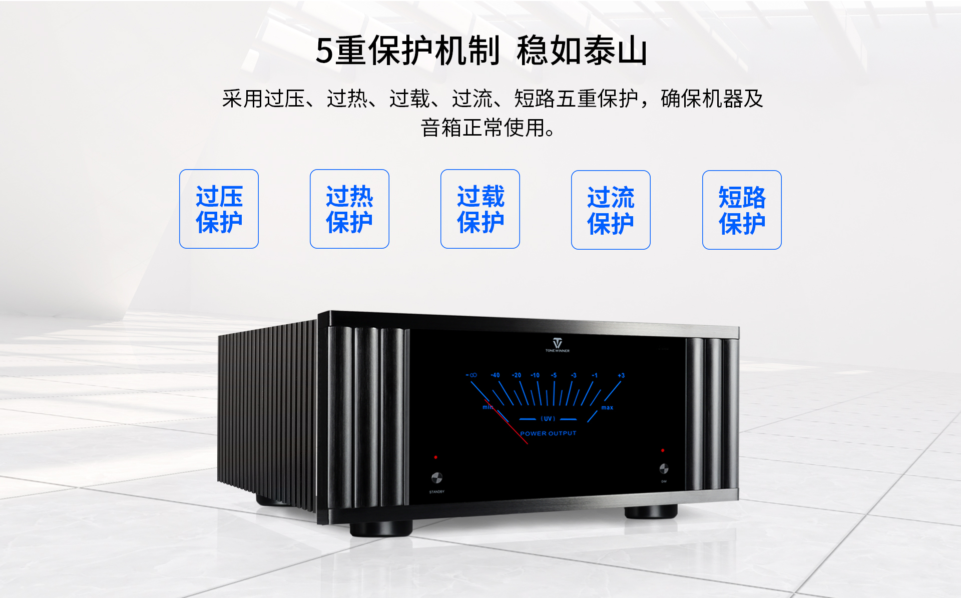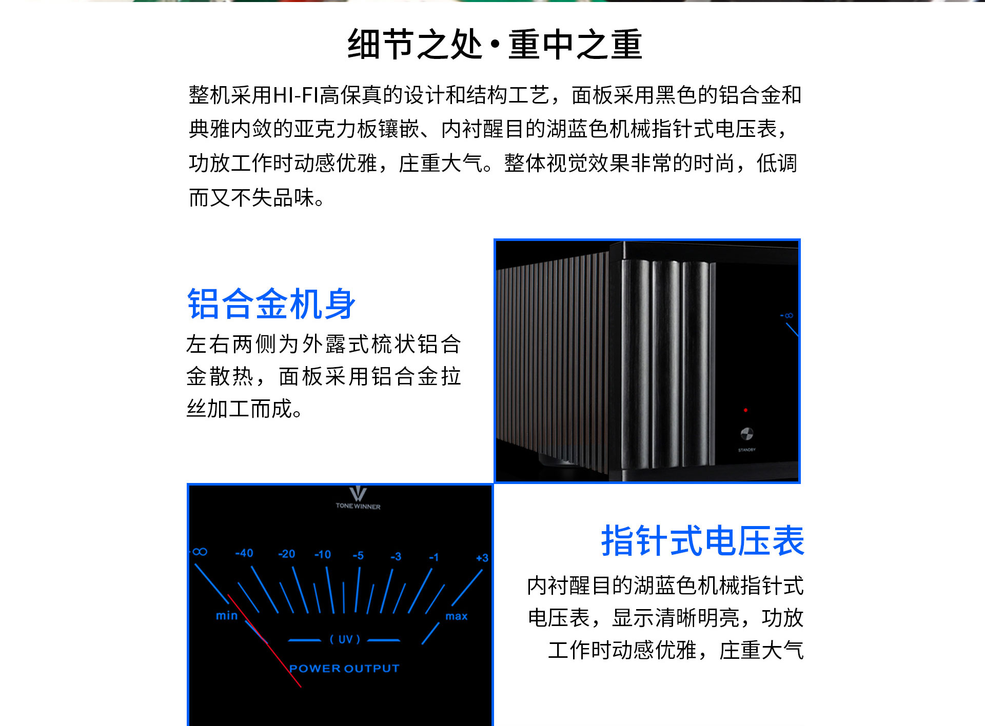 一、外觀特點 AD-7300PA+整機采用HI-FI高保真的設計和結構工藝,左右兩側為巨型外露式梳狀鋁合金散熱,上蓋板亦為鑄鋁精加工一體化百頁窗散熱結構,面板采用黑色的鋁合金和典雅內斂的亞克力板鑲嵌、內襯醒目的湖藍色機械指針式電壓表,功放工作時動感優雅,莊重大氣。整體視覺效果非常的時尚而又不失品味。