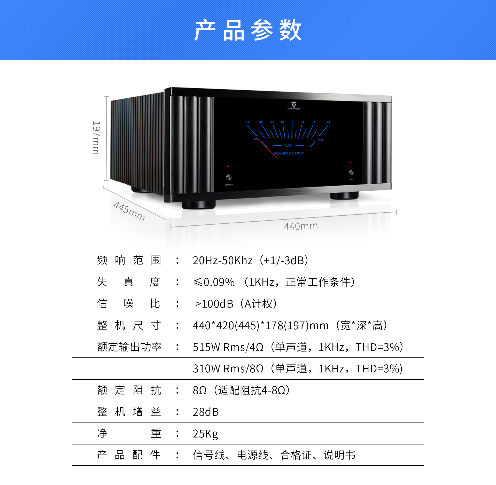 | 額定阻抗:8Ω(適配阻抗4-8Ω) | 每聲道輸出功率:515W RMS(4Ω,THD=3%,1kHz)310W RMS(8Ω,THD=3%,1kHz) |