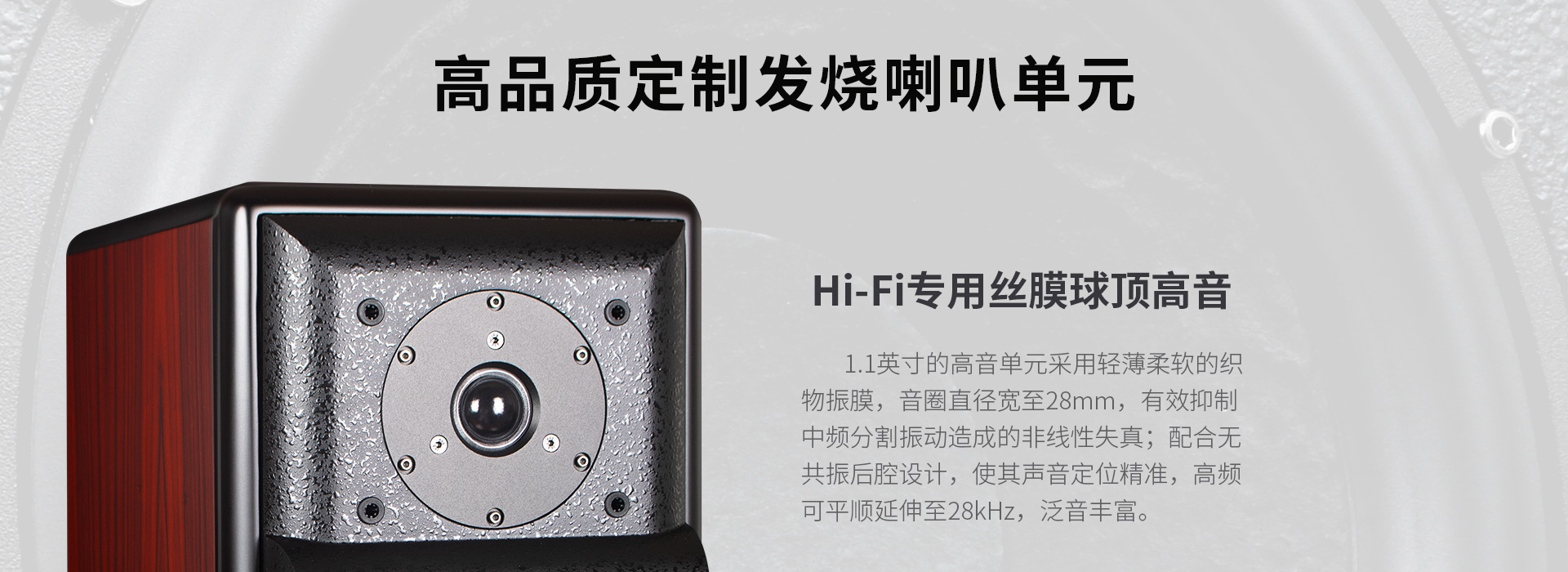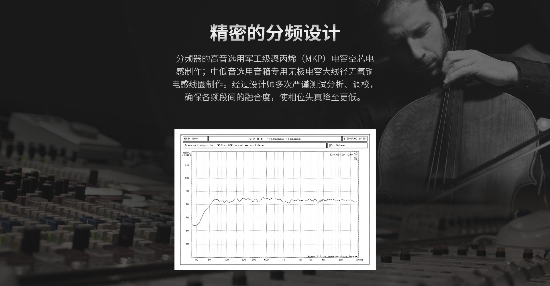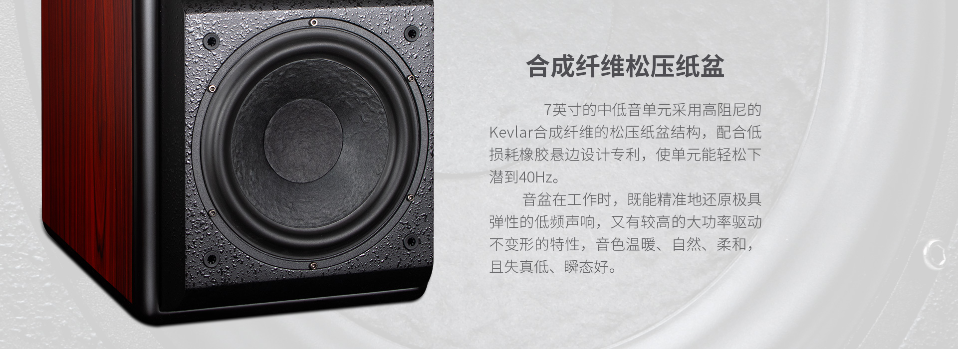 二、設計特點 1、1.1英寸的高音單元采用輕薄柔軟的織物振膜,音圈直徑寬至28mm,有效抑制中頻分割振動造成的非線性失真;配合無共振后腔設計,使其聲音定位精準,高頻可平順延伸至28kHz,泛音豐富。 2、7英寸的中低音單元采用高阻尼的Kevlar合成纖維的松壓紙盆結構,配合低損耗橡膠懸邊設計專利,使單元能輕松下潛到40Hz。 3、精密的分頻設計:分頻器的高音選用軍工級聚丙烯(MKP)電容空芯電感制作;中低音選用音箱專用無極電容大線徑無氧銅電感線圈制作。經過設計師多次嚴謹測試分析、調校,確保各頻段間的融合度,使相位失真降至更低。 4、后置倒相孔設計,能拓寬低頻下潛與量感。 5、無氧銅鍍金雙接線柱,使電信號降損到更低。