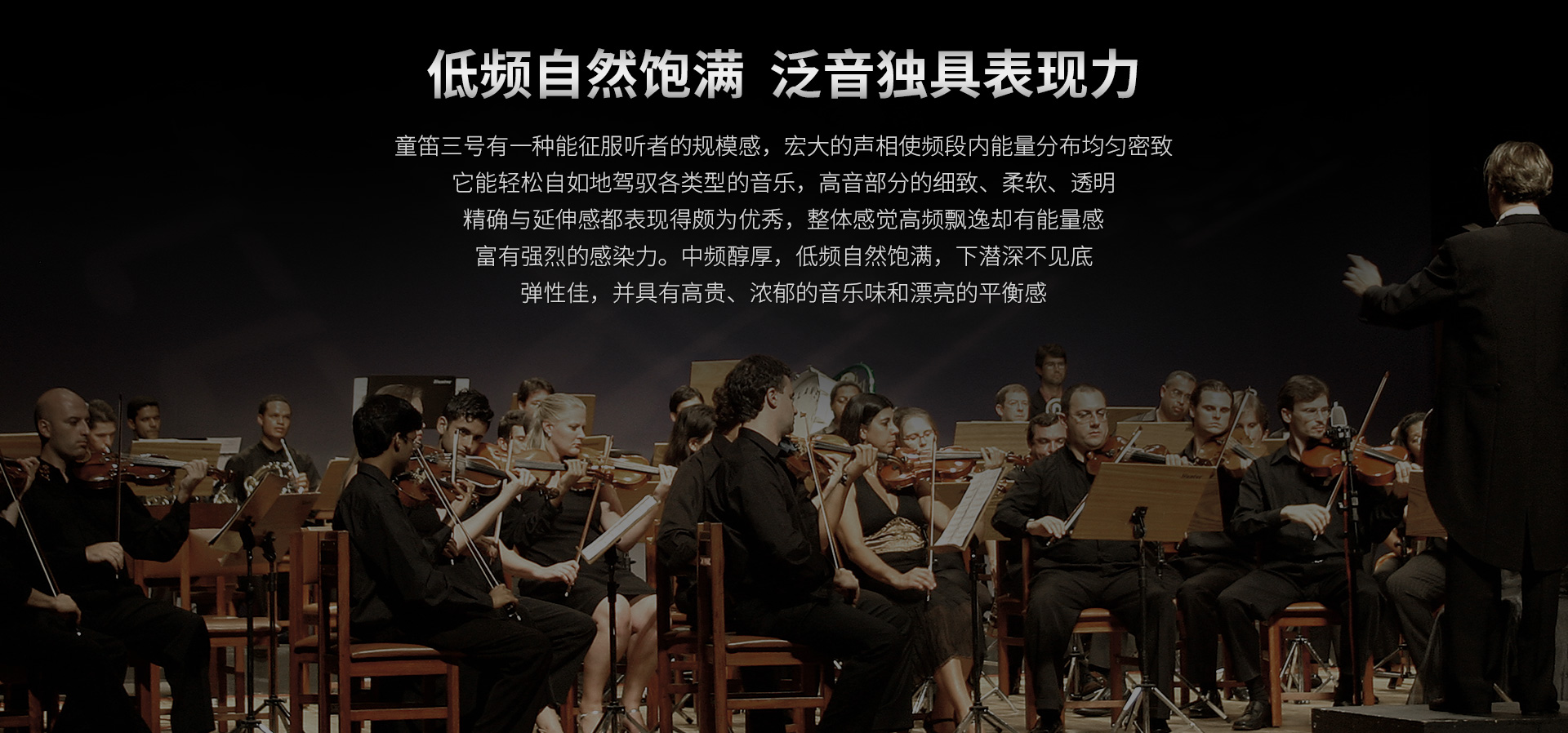 三、聲音特色 童笛三號有一種能征服聽者的規模感,宏大的聲相使頻段內能量分布均勻密致它能輕松自如地駕馭各類型的音樂,高音部分的細致、柔軟、透明精確與延伸感都表現得頗為優秀,整體感覺高頻飄逸卻有能量感富有強烈的感染力。中頻醇厚,低頻自然飽滿,下潛深不見底彈性佳,并具有高貴、濃郁的音樂味和漂亮的平衡感。