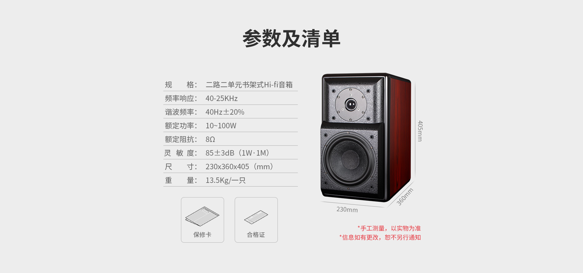 四、性能參數 規格:二路二單元書架式倒相音箱