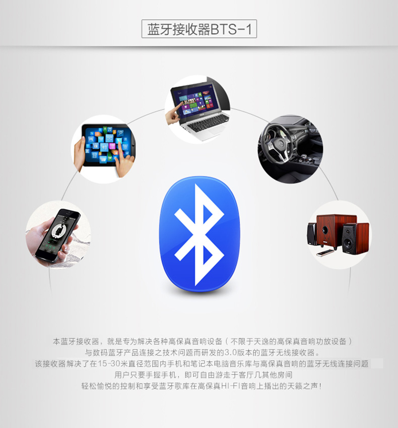 一、產品介紹 本藍牙接收器,就是專門為解決各種高保真音響設備(不限于天逸的高保真音響功放設備)與數碼藍牙產品連接之技術問題而研發的3.0版本的藍牙無線接收器。該接收器極好的解決了在15—30米直徑范圍內手機和筆記本電腦音樂庫與高保真音響的藍牙無線連接問題,用戶只要手握手機,即可自由游走于客廳及其他房間,輕松愉悅的控制和享受藍牙歌庫在高保真HI-FI音響上播出的天籟之聲! 作為高保真音響生產企業,深知高保真音樂音響在傳輸數碼的過程中有一個必須要解決的問題就是數據量,作為CD唱片的數據流通常是以16位、44.1kHz的動態范圍為96dB為基準的,HDCD和SACD的數據量根式大的驚人,通常會達到24位、192kHz、動態范圍可以達到120dB!這樣大的數據量對于大多數無線應用包括藍牙技術來說,是不切實際的。為此必須對這些數據流進行必須的動態無損壓縮!為此,我們在高度成熟的藍牙傳輸技術中,引入了美國CSR aptx高保真藍牙立體聲專利技術, apt-X技術正是為了用于專業音頻與廣播領域的一個實時數字音頻數據壓縮系統,可將線性音頻樣本壓縮到原來的1/4,音質無明顯下降且延遲很低。該技術可使其音頻聲音效果達到CD音質。很大的提高了藍牙連接中優越的立體聲音頻音質音色,并且其完整的音頻頻率帶寬與高保真性能相符。解決了音頻編碼低延遲技術延遲小,并解決了“唇形同步”等等問題。采用aptx高保真藍牙立體聲專利技術,需要購買美國CSR aptx專利技術,成本不菲,但它所帶來的好處卻是明顯的和有效的。
