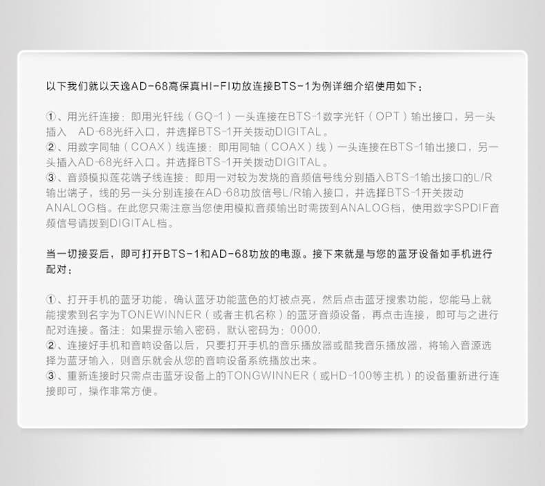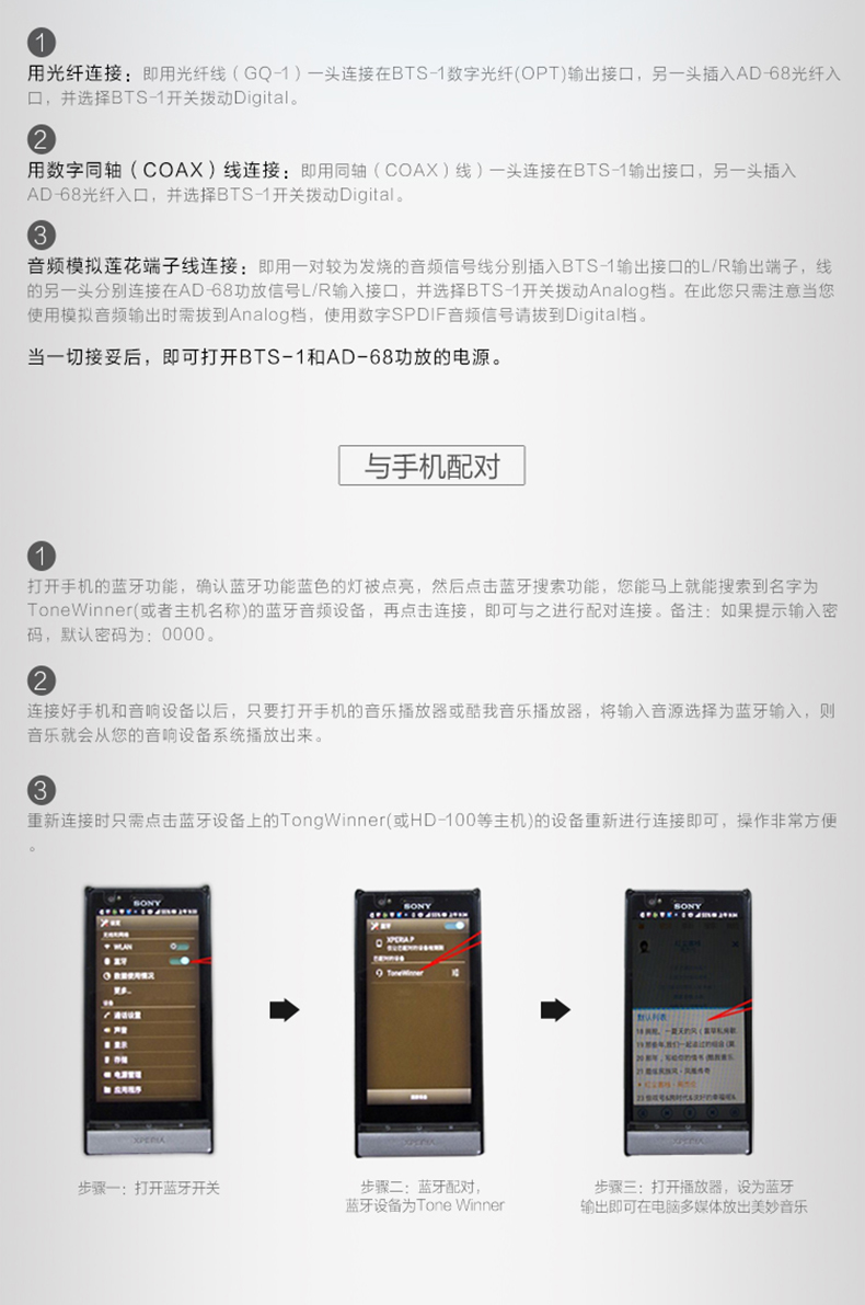 三、 使用介紹 為方便音響發燒友連接自己的高保真音響設備,該藍牙無線接收器為提供LINE OUT(模擬L/R音頻)、數字同軸(COAX)、數字光纖(OPT)等3中輸出接口,并在該設備底部設有模擬/數字輸出切換開關:當選擇開關撥動到Analog時:僅模擬L/R音頻有輸出;當撥到Digital時:僅數字SPDIF音頻有輸出,即光纖、同軸有信號輸出。 操作使用都非常方便,以下我們就以天逸AD-68高保真HI-FI功放連接BTS-1為例詳細介紹使用如下: 1. 用光纖連接:即用光纖線(GQ-1)一頭連接在BTS-1數字光纖(OPT)輸出接口,另一頭插入AD-68光纖入口,并選擇BTS-1開關撥動Digital。 2. 用數字同軸(COAX)線連接:即用同軸(COAX)線)一頭連接在BTS-1輸出接口,另一頭插入AD-68光纖入口,并選擇BTS-1開關撥動Digital。 3. 音頻模擬蓮花端子線連接:即用一對較為發燒的音頻信號線分別插入BTS-1輸出接口的L/R輸出端子,線的另一頭分別連接在AD-68功放信號L/R輸入接口,并選擇BTS-1開關撥動Analog檔。在此您只需注意當您使用模擬音頻輸出時需拔到Analog檔,使用數字SPDIF音頻信號請拔到Digital檔。 4. 接下來就是與您的藍牙設備如手機進行配對: 打開手機的藍牙功能,確認藍牙功能藍色的燈被點亮,然后點擊藍牙搜索功能,您能馬上就能搜索到名字為ToneWinner(或者主機名稱)的藍牙音頻設備,再點擊連接,即可與之進行配對連接。備注:如果提示輸入密碼,默認密碼為:0000。 連接好手機和音響設備以后,只要打開手機的音樂播放器或酷我音樂播放器,將輸入音源選擇為藍牙輸入,則音樂就會從您的音響設備系統播放出來。 重新連接時只需點擊藍牙設備上的TongWinner(或HD-100等主機)的設備重新進行連接即可,操作非常方便。