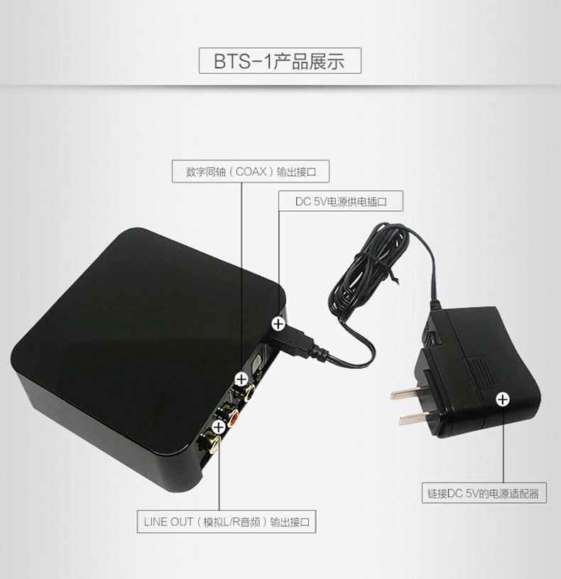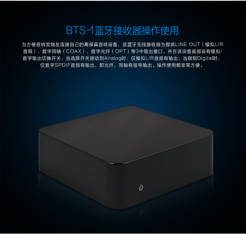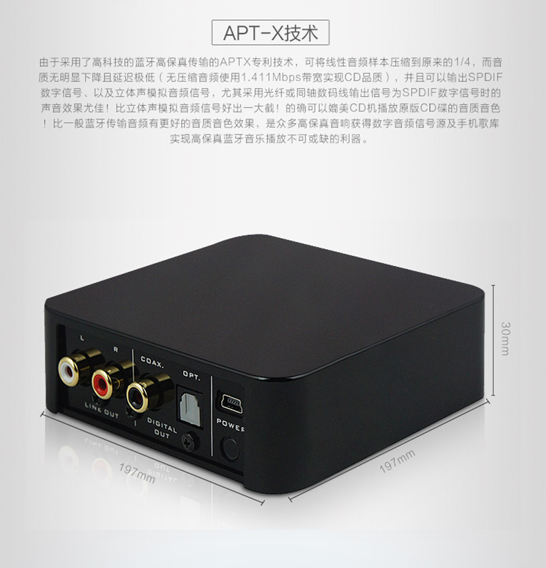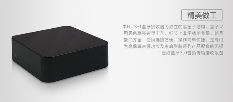 二、外觀特點 本BTS-1藍牙接收器為獨立的黑匣子結構,盒子采用黑色高亮鑄塑工藝,細節上非常精美養眼。信號接口齊全,使用連接方便,操作簡單快捷,是專門為高保真音頻功放及家庭影院系列產品配套的無損壓縮藍牙3.0音頻傳輸接收設備,由于采用了高科技的藍牙高保真傳輸的APTX專利技術,可將線性音頻樣本壓縮到原來的1/4,而音質無明顯下降且延遲低(無壓縮音頻使用1.411Mbps帶寬實現CD品質),并且可以輸出SPDIF數字信號、以及立體聲模擬音頻信號,尤其采用光纖或同軸數碼線輸出信號為SPDIF數字信號時的聲音效果尤佳!比立體聲模擬音頻信號好出一大截!的確可以媲美CD機播放原版CD碟的音質音色!比一般藍牙傳輸音頻有更好的音質音色效果,是眾多高保真音響獲得數字音頻信號源及手機歌庫實現高保真藍牙音樂播放不可或缺的利器。