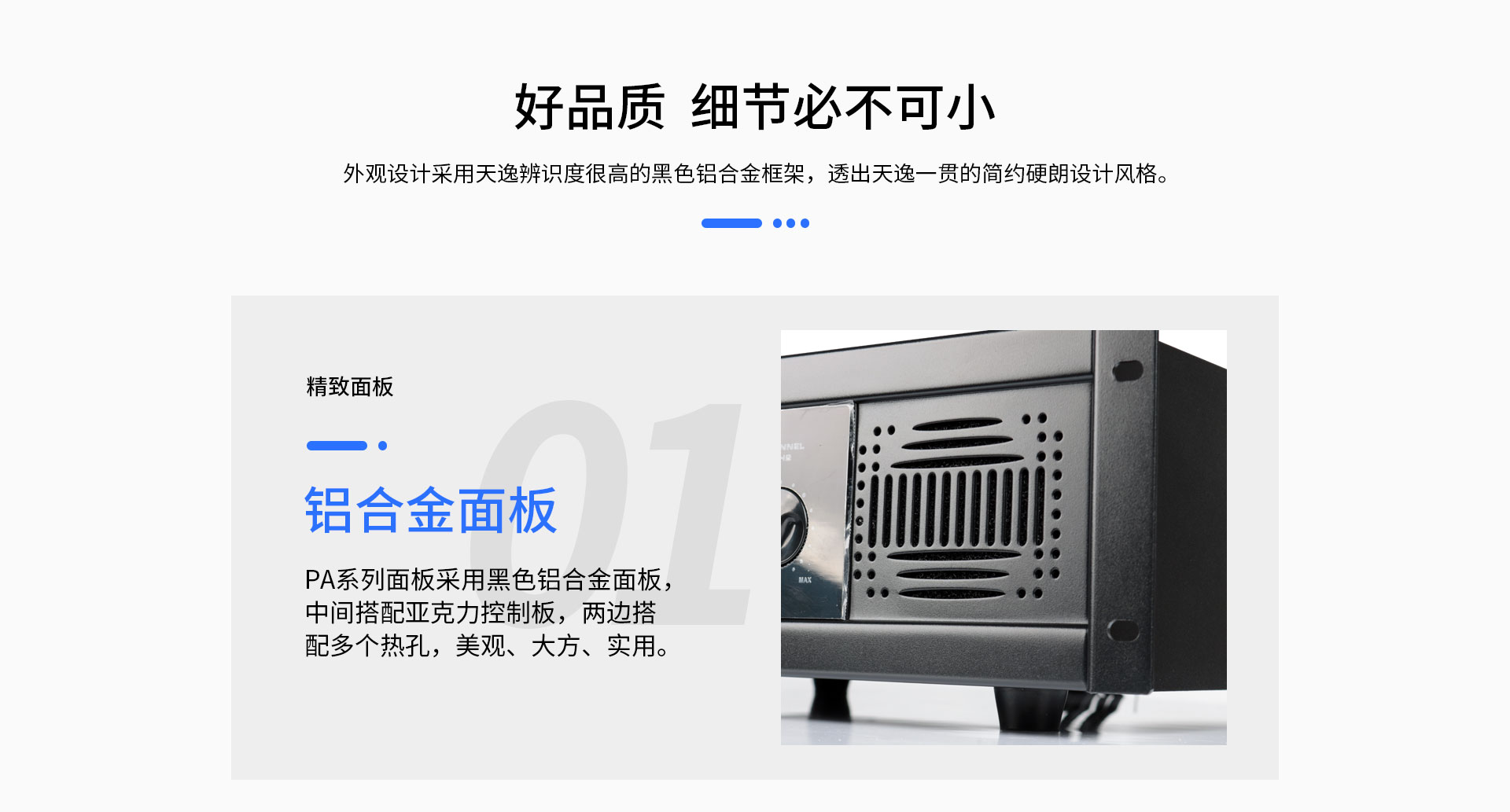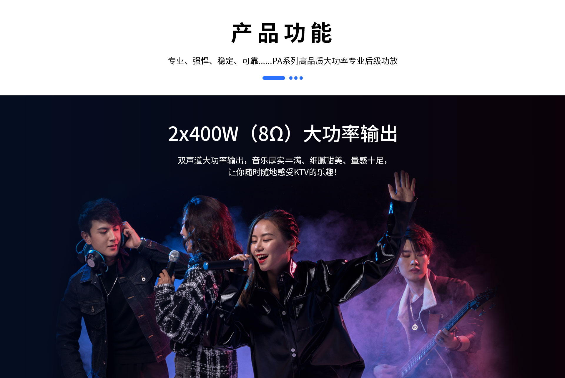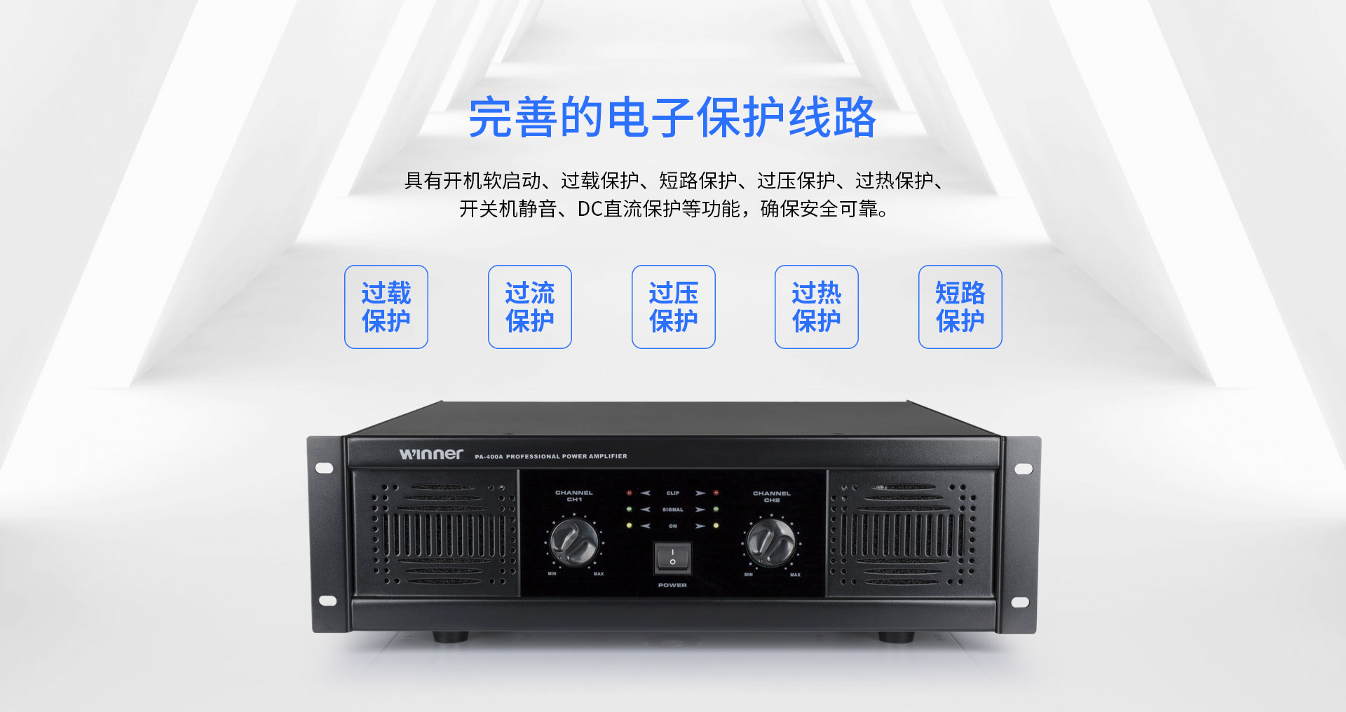 天逸PA-400A是專為商用KTV包房研發的專業聲頻功率放大器,本機設計以專業功放之高功率、大電流、長期穩定工作的要求為標準,力求達到最高的性能指標。
