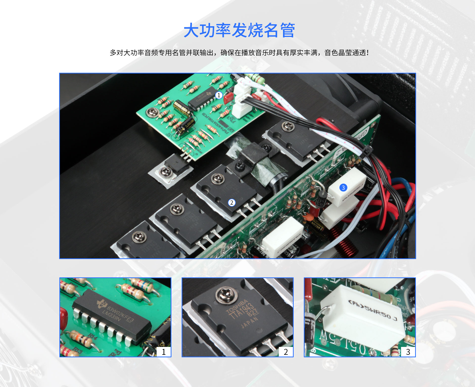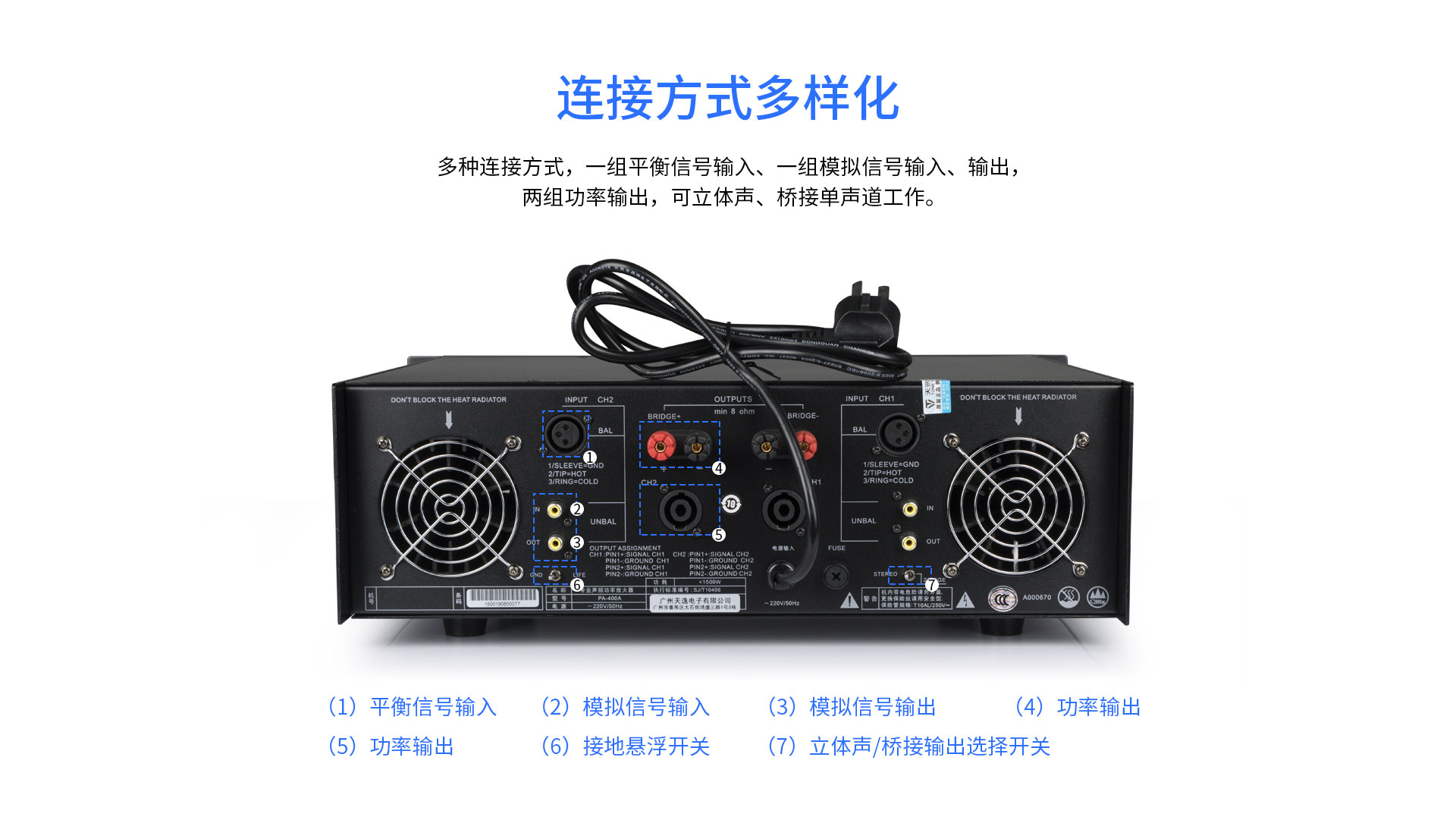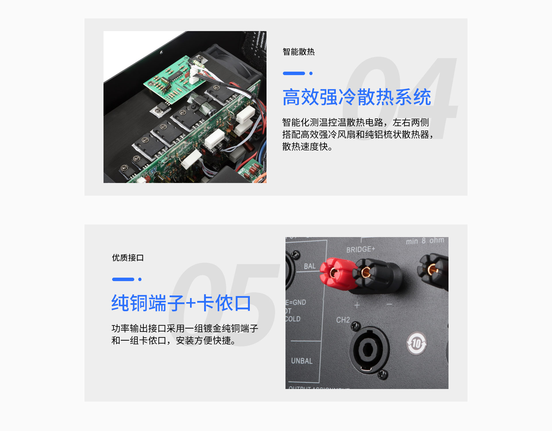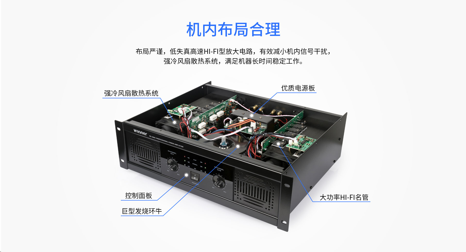 一、整體特點 1.純黑色的箱體,堅固耐用的機殼、合理的內部結構。 2.DC直流電子保護線路,音體聲、橋接單聲道工作方式。 3.大型環形電源變壓器、大容量濾波電容。 3.多對日產大功率高頻率Hi-Fi名管并聯輸出,高效強冷風扇通道式散熱系統。