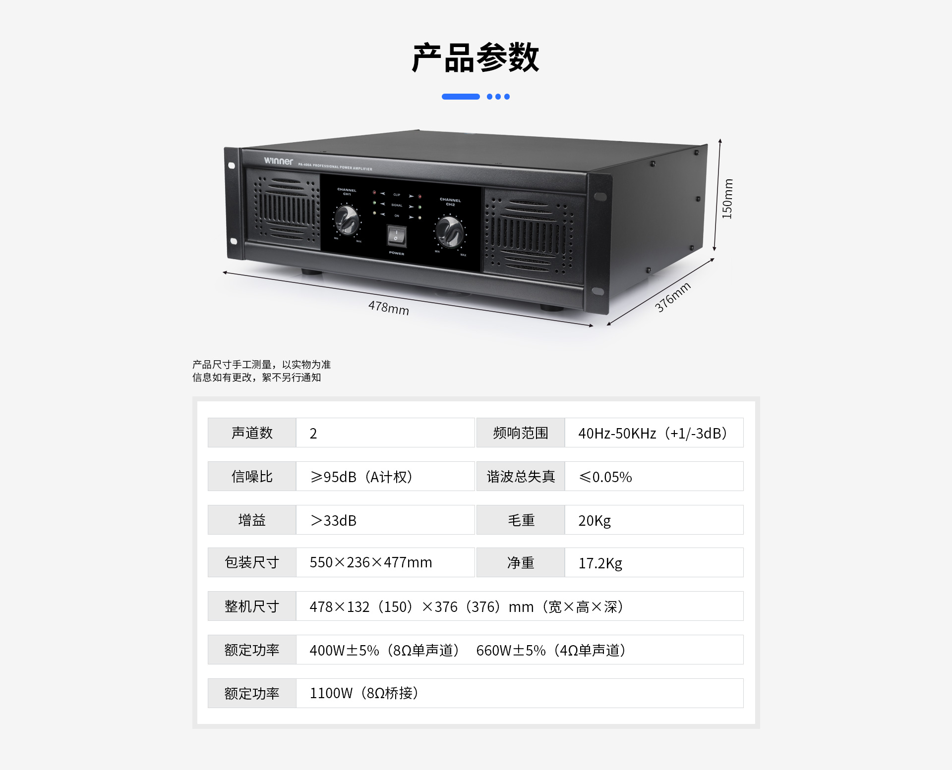 三、產品參數 產品型號:PA-400A 聲 道 數:2 產品材質:鋁合金 外觀顏色:黑色 信噪比:≥95DB(A計權) 輸入靈敏度:1V 輸入阻抗:平衡:20KΩ 非平衡:25KΩ 增益:>33dB 頻響范圍:40Hz-50KHz(+1/-3dB) 總諧波失真:≤0.05%(1KHz,正常工作條件) 額定功率:額定功率:400W±5%(8Ω單聲道) 660W±5%(4Ω單聲道)1100W(8Ω橋接) 額定阻抗:8Ω(適配阻抗4-8Ω) 凈重:17.2Kg 毛重:20Kg 整機尺寸:478×132(150)×376(376)mm(寬×高×深) 包裝尺寸:570×268×505mm(寬×高×深) 適用場合:KTV、酒吧、迪廳、清吧、戶外擴聲、舞臺音響、租賃、酒店、多媒體會議室、娛樂活動中心、接待室等擴聲 隨機附件:產品說明書,產品電源