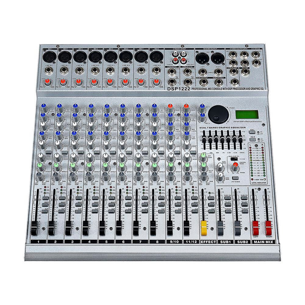 DSP1222調音臺功能概述 一、主要特征1、 8路話筒輸入,4路(2組)立體聲輸入,帶48V幻像電源 2、輸入高中低3段均衡,中頻可掃頻 3、兩個輔助輸出,輔助AUX1可以選擇推子前推子后信號,輔助AUX2為推子后信號 4、輸入每路帶主輸出MAIN,編組SUB, 監聽PFL開關, 方便選擇每路帶信號指示燈,監聽PFL指示燈和峰值指示燈 5、內置24-bitDSP數字效果, 32種效果,效果佳,可與專業效果器媲美 6、效果模式帶液晶顯示屏,顯示直觀,操作方便 7、兩主輸出,帶平衡和非平衡輸出口,兩個推子獨立控制,60mm進口推子 8、真正的兩編組輸出,兩個推子獨立控制,帶編組開關,編組信號可以疊加到主輸出 9、立體聲監聽輸出,可以耳機監聽,也可以外接音箱監聽 10、兩組立體聲輔助返回,方便外接設備輸出七段均衡,+/-12dB, 帶直通和均衡開關,方便選擇 11、外置大功率電源,提升信噪比 12、標準雙12段光柱電平表,精確指示電平大小,帶撥動選擇開關,可以選擇指示主輸出,編組輸出,推子前三種信號 13、獨特的外觀設計,SMT表面貼片工藝,性能可靠 14、帶錄音輸出和錄音回放輸入