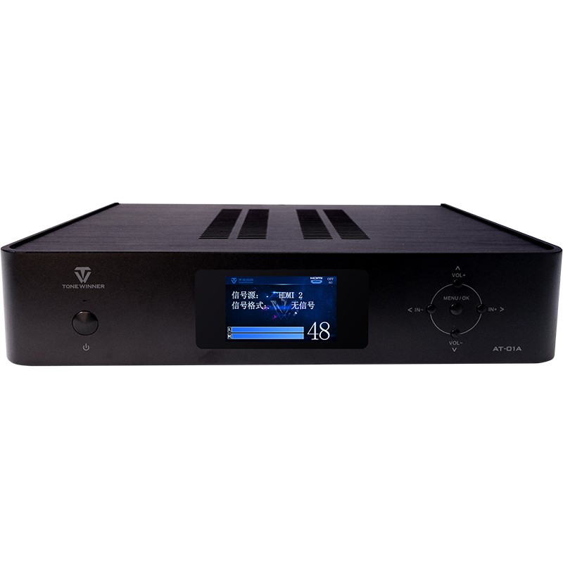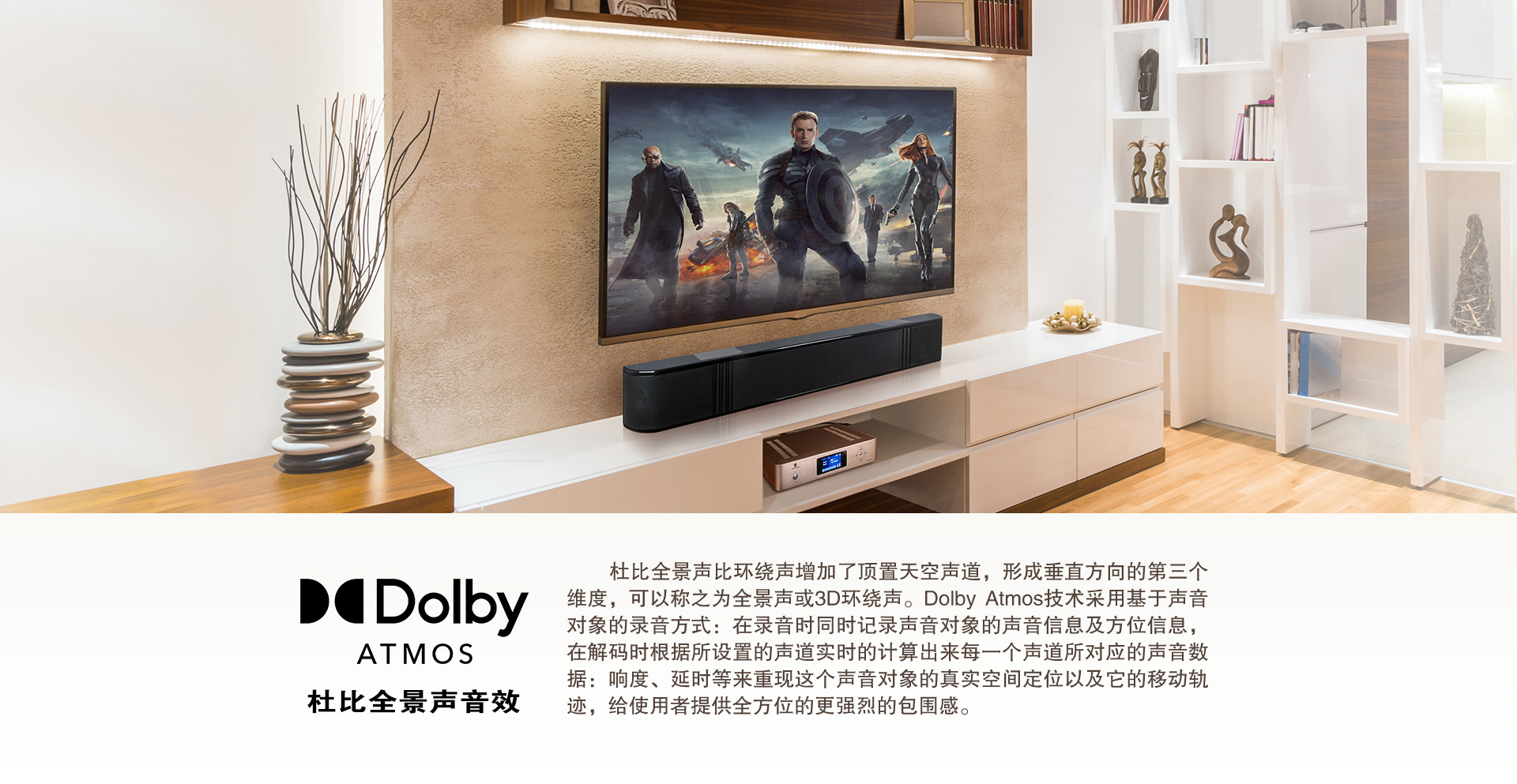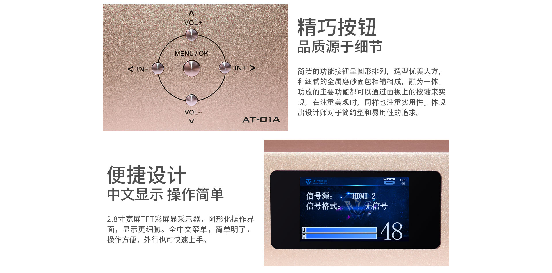 一、外觀特點 悅享一號全景聲影院音響采用了音頻解碼功放AT-01A搭配無源聲條AT-01S的分體式設計方案,整體外觀的簡潔明快。AT-01A采用了鋁合金機箱,金屬拉絲的背板,亞光處理的金屬按鍵,并使用陽極氧化工藝處理表面,造型風格簡潔大方,加工工藝精細,并有多種顏色可選。AT-01S聲條采用亮光油漆,造型也是簡潔大方時尚的風格,一體化的面罩,掛、放兩宜的安裝方式,融入家居更加和諧。悅享一號全景聲影院音響系統的造型風格給人的感覺是高端大氣、工藝精細,簡潔、時尚,同時又很好的兼顧了使用方便與聲音效果。