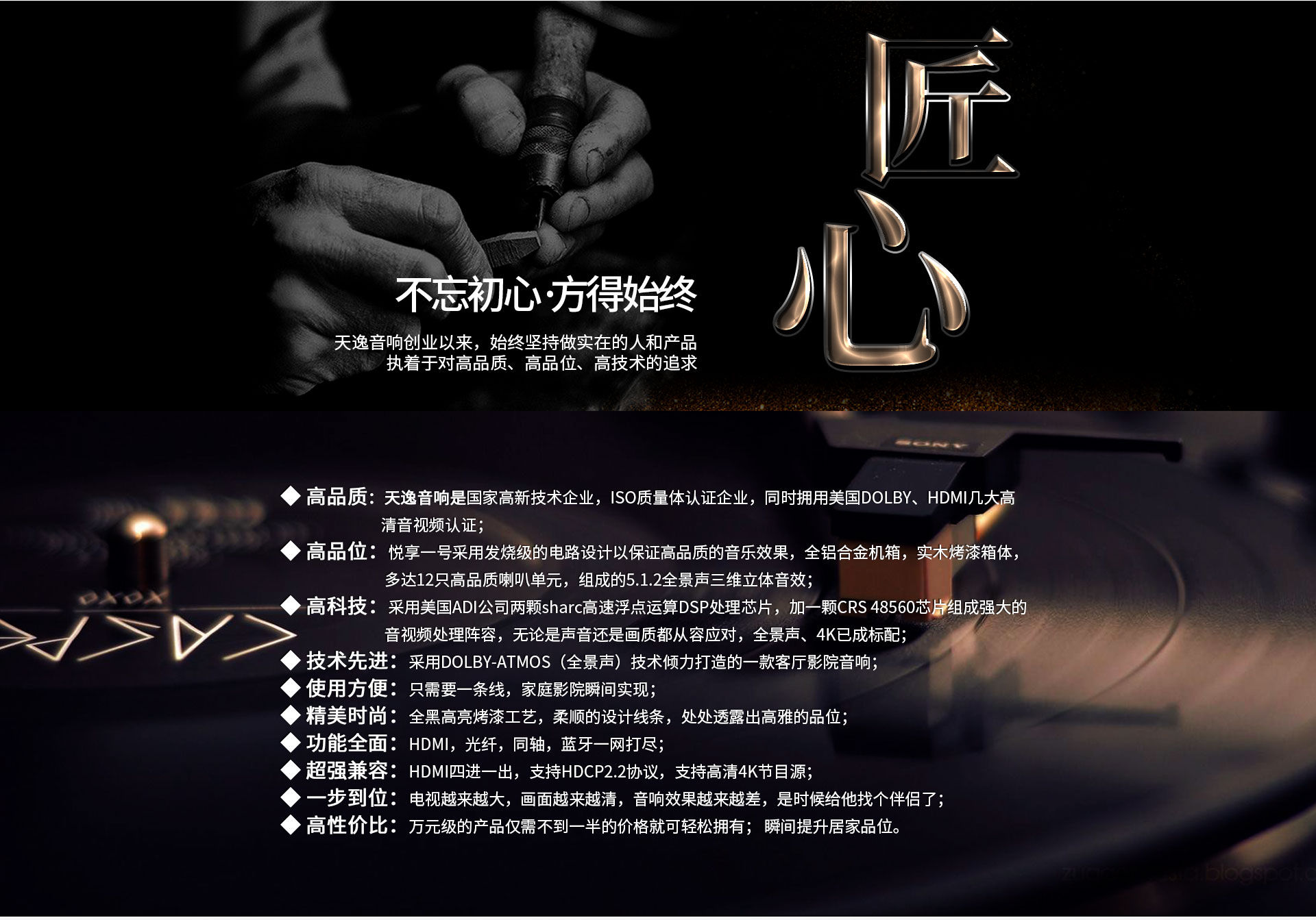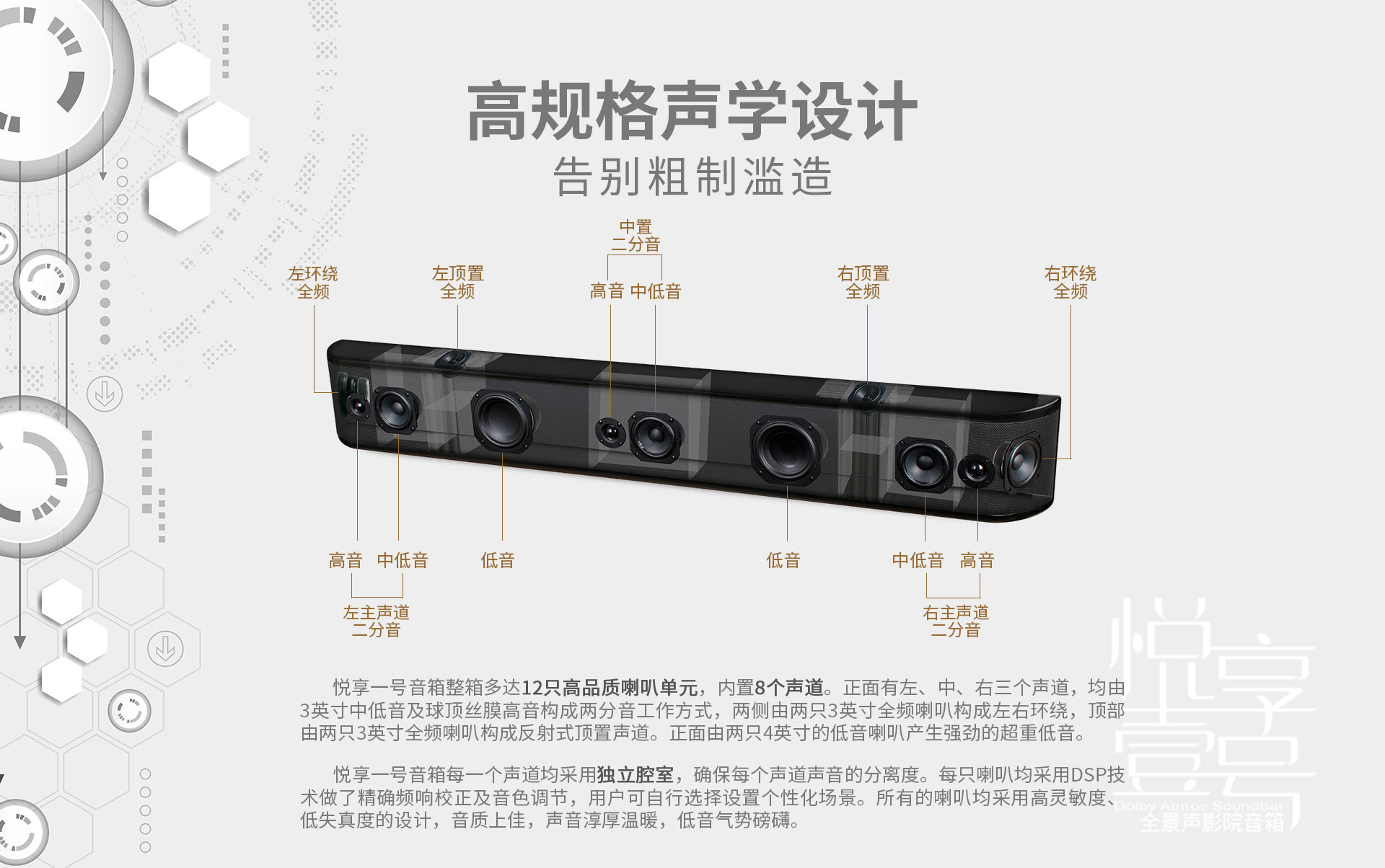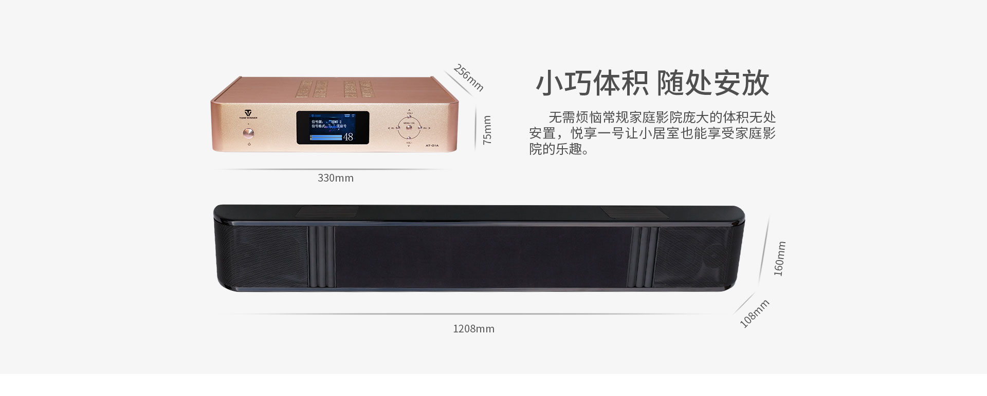 四、聲音特性 AT-01S的每一個聲道均采用獨立腔室,確保了每個聲道聲音的分離度。所有的喇叭均采用高靈敏度、低失真度的設計,音質一流,聲音淳厚溫暖,低音氣勢磅礴。 聽音樂時悅享一號又會給你極強的音樂感染力,它的高音清晰順滑,中音淳厚溫暖,低音厚重有力、氣勢宏大。聲場層次分明定位清晰、聲音細節豐富又不毛糙,無論是看電影還是聽音樂,悅享一號都能給你一流的視聽享受。