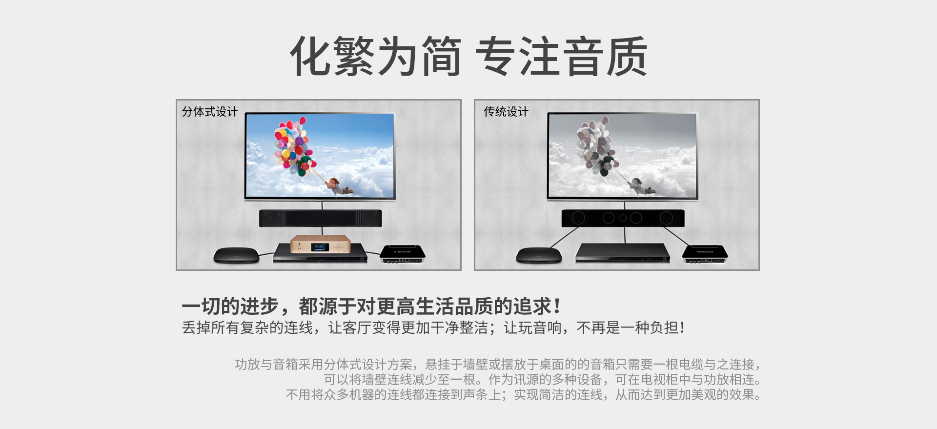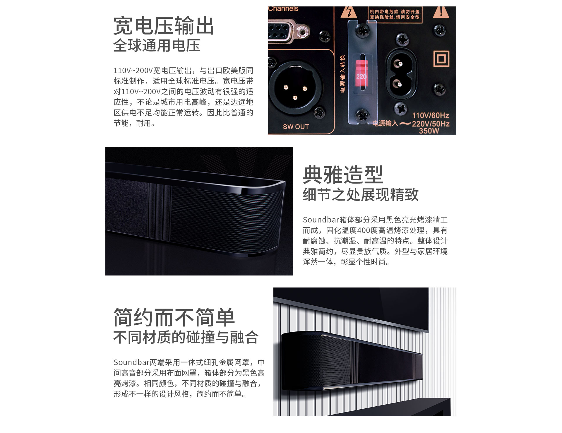 三、主要功能表述 精巧按鈕,品質源于細節:面板按鍵極少,五個精致圓形按鍵成環形排列,簡潔自然!功放的主要功能可以通過精巧的按鈕操控來實現。按鈕與簡潔洗練的面板融為一體,體現出設計師對于簡約型和易用性的追求。 便捷設計中文顯示,操作簡單:2.8寸寬屏TFT彩屏顯采示器,圖形化操作界面,顯示更細膩。全中文菜單,簡單明了,操作方便外行也可快速上手。 單線纜連接,告別雜亂無章: 功放與音箱單線纜連接。只需一根多芯無氧銅銅線,就可以與音箱連接,無需與傳統的家庭影院般的復雜走線,將連線縮減到一根,告別雜亂連線,即可還您干凈整潔的家居環境。 精巧遙控,輕松愜意一手掌:配備小巧精致的紅外接收遙控。純黑色細膩拉絲工藝,柔軟靈敏的橡膠按鈕,觸感細膩,手感極佳。可長距離,大范圍接收信號,反應迅速,使用方便。 簡約而不簡單,不同材質的碰撞與融合:Soundbar兩端采用一體式細孔金屬網罩,中間高音部分采用布面網罩,箱體部分為黑色高亮烤漆。相同顏色,不同材質的碰撞與融合,形成不一樣的設計風格,簡約而不簡單。
