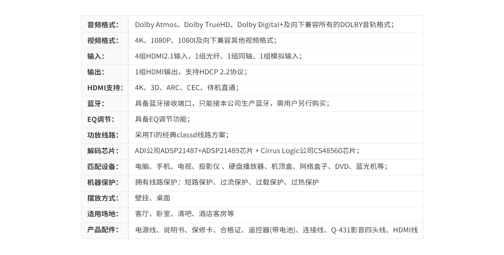 產品配件:電源線、說明書、保修卡、合格證、遙控器(帶電池)、連接線、Q-431影音四頭線、HDMI線