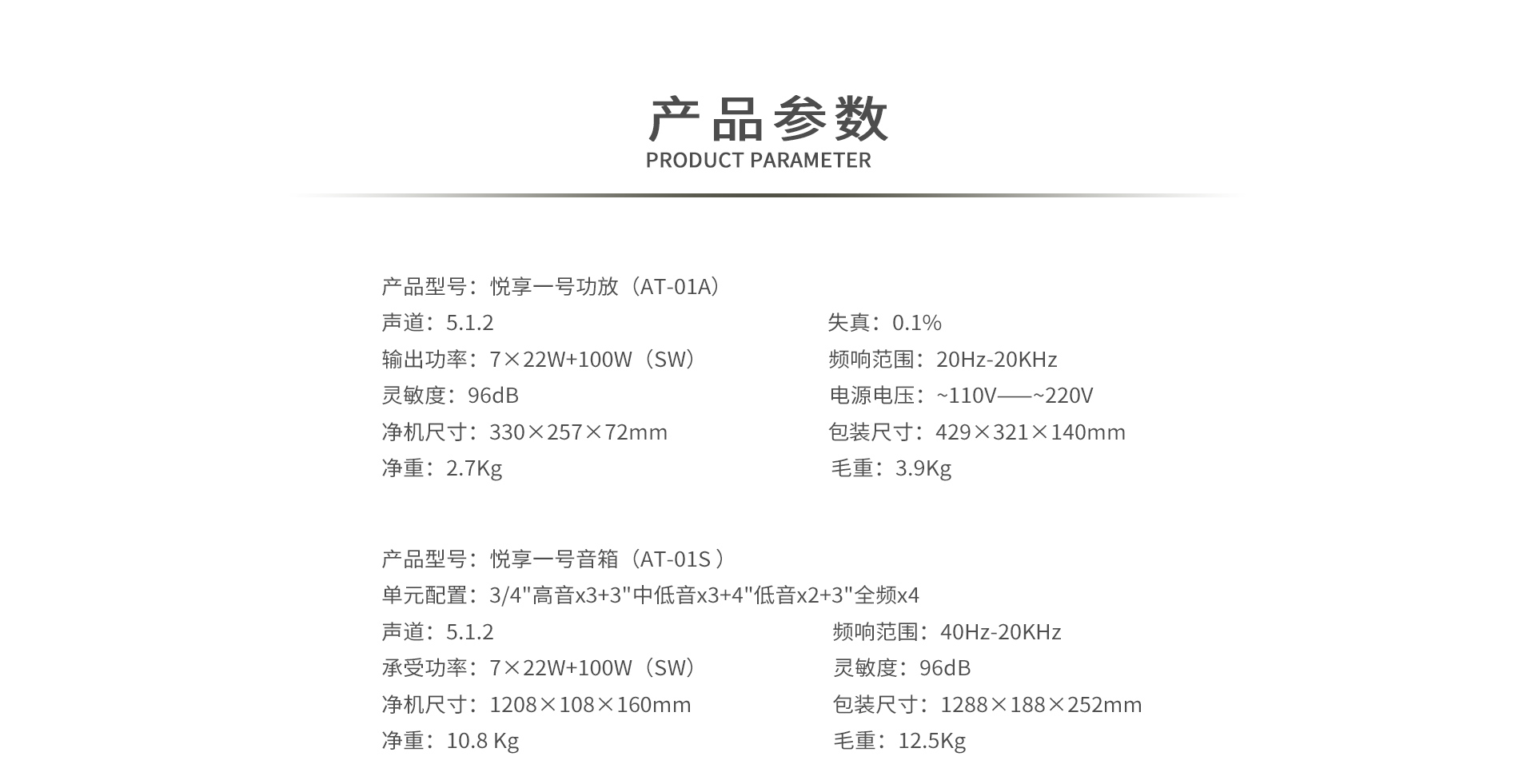 五、產品主要性能指標 產品型號:悅享一號功放(AT-01A) 聲 道 數:5.1.2 失真:≥0.1% 輸出功率:7×22W+88W(SW) 靈敏度:≥90dB 電源電壓:~110V-~220V 凈機尺寸:330×257×72mm(寬×深×高) 包裝尺寸:436×328×154mm(寬×深×高) 凈重:2.7kg 毛重:3.9kg 產品型號:悅享一號音箱(AT-01S) 單元配置:3/4"高音x3+3"中低音x3+4"低音x2+3"全頻x4 聲道:5.1.2 頻響范圍:40Hz-20kHz 承受功率:7*22W+88W(SW) 整機尺寸:1208×108×160mm 包裝尺寸:1288×188×252mm 凈重:10.8kg 毛重:12.5kg