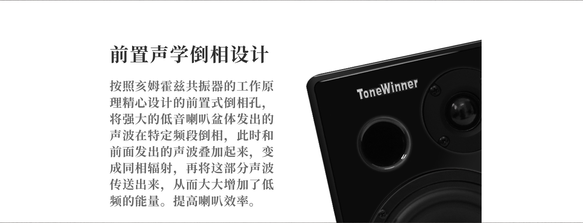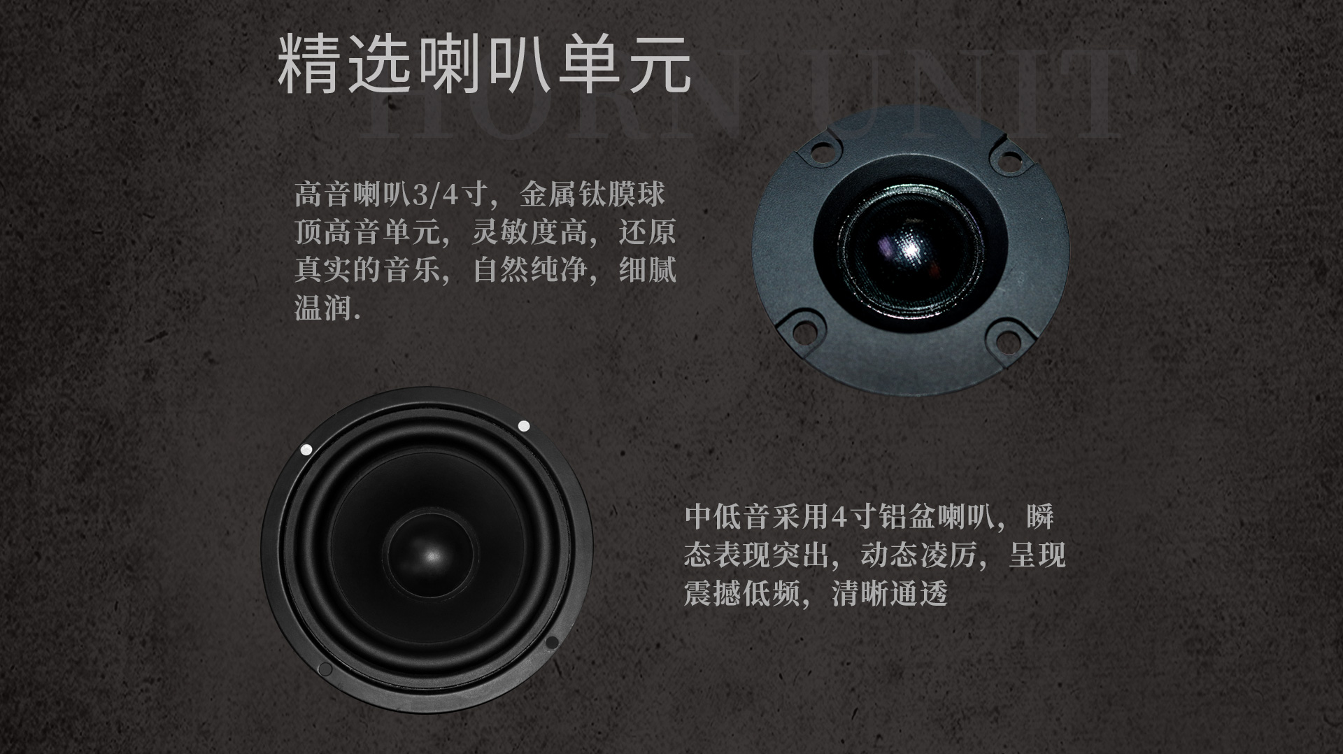 精選喇叭單元: 高音喇叭3/4寸,金屬鈦膜球頂高音單元,靈敏度高,還原真實的音樂,自然純凈,細膩溫潤。 中低銀音采用4寸鋁盆喇叭,瞬態表現突出,動態凌厲,呈現震撼低頻,清晰通透。 置聲學導向設計: 按照亥姆霍茲共振器的工作原理精心設計的前置式導向孔,將強達的低音喇叭盆體發出的聲波在特定頻段倒相,時期和前面發出的聲波疊加起來,變成同相輻射,再將這部分聲波傳送出來,從而大大增加了低頻的能量。提高喇叭效率。
