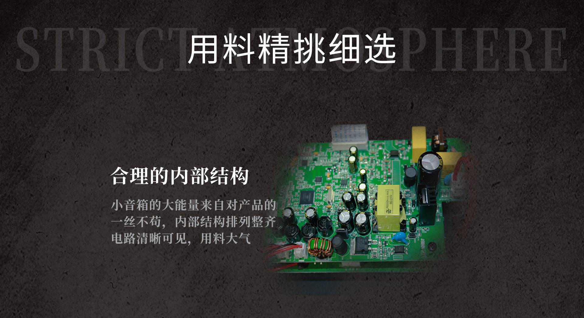 二、電路及用料設計 電源部分采用高效的串聯諧振式穩壓開關電源,能耗低,效率高。節能環保。 利用LC串聯諧振回路或并聯諧振回路組成的諧振式開關電源已成為開關電源的熱點,目前,具有穩壓功能的諧振式開關電源在國外的開發速度快,已有大量諧振式開關電源進人商品市場。其最大優點是振蕩波形為等幅或衰減的正弦波,大大減小了輸出紋波。動態損耗減小,可提高效率,或提高工作頻率以減小體積和重量。其次是減少了快速關斷主回路電流所引起的射頻干擾. 精準數字轉換芯片:機內大規模的DSP數字揚聲器處理技術,具有真正意義上的立體聲電子分頻功率放大器,通過DSP數字對喇叭做優化,聲音曲線更平坦,使音箱在全頻范圍內發出的聲音平滑流暢,細膩純美,具有豐滿明晰的音頻解析力。