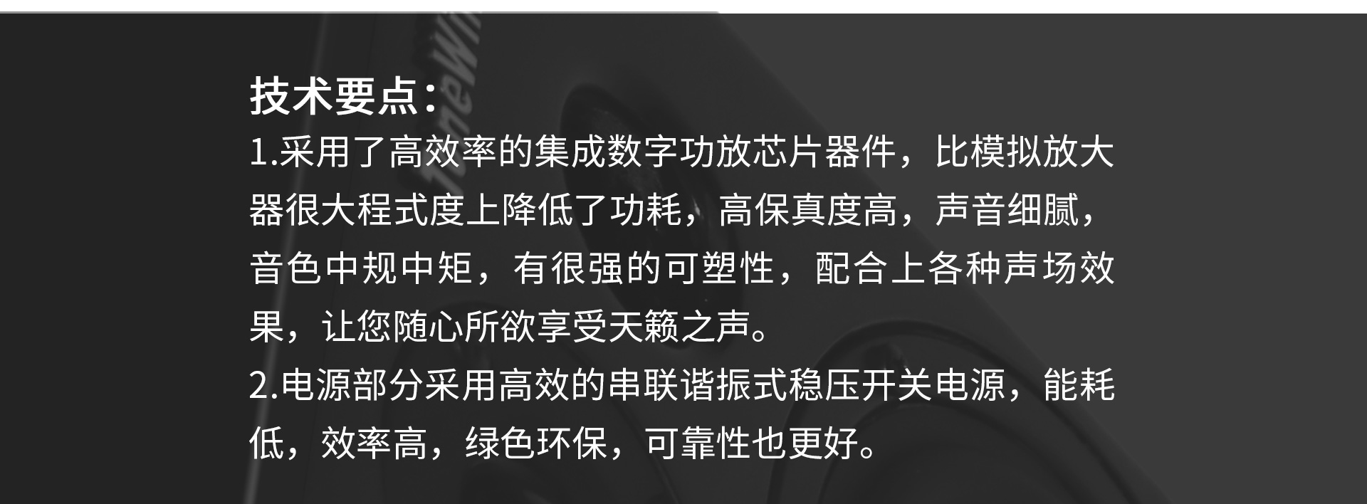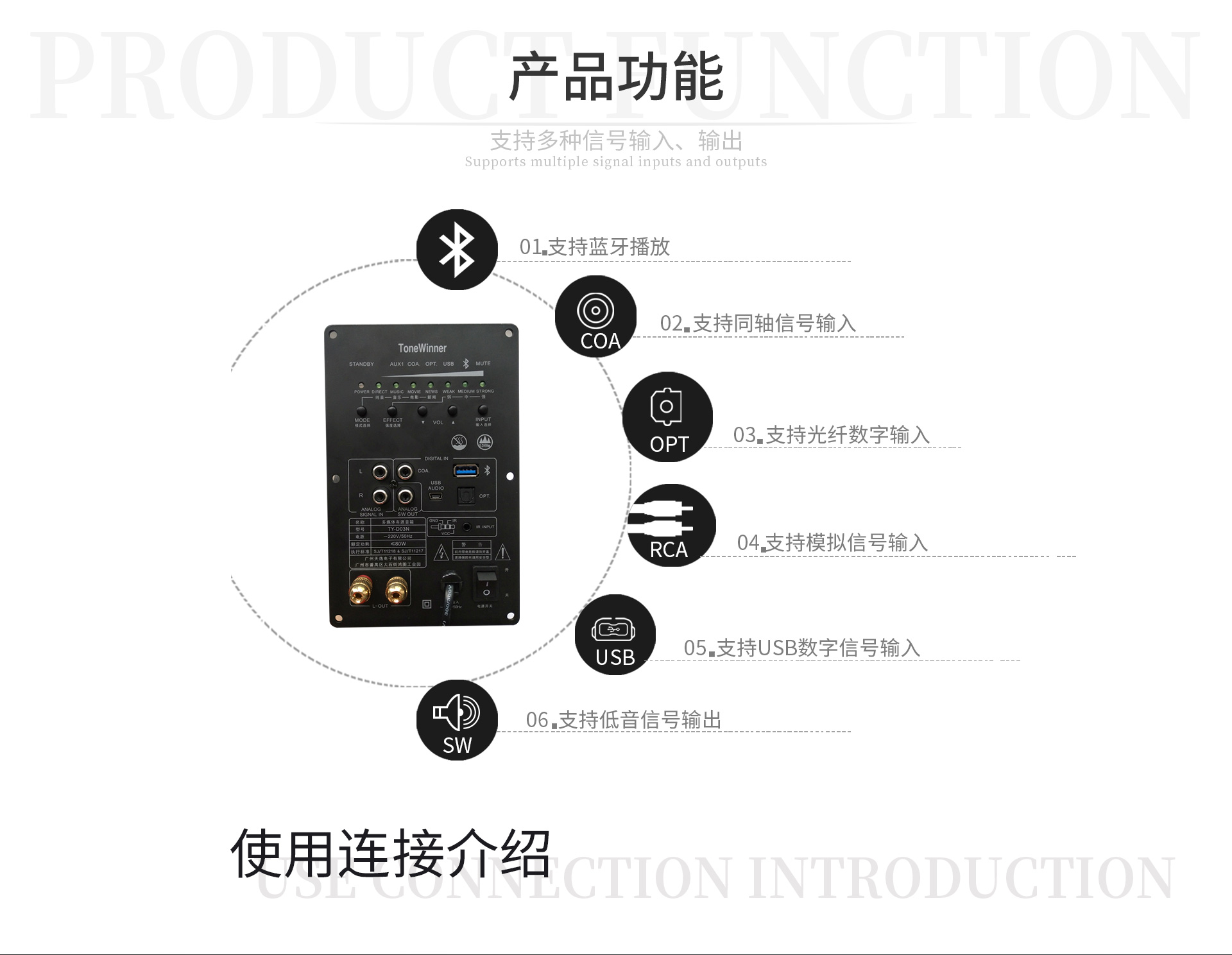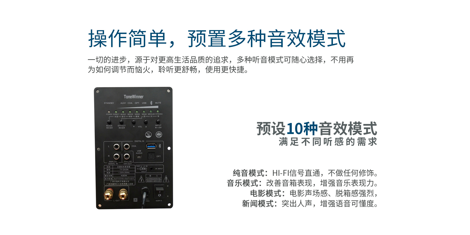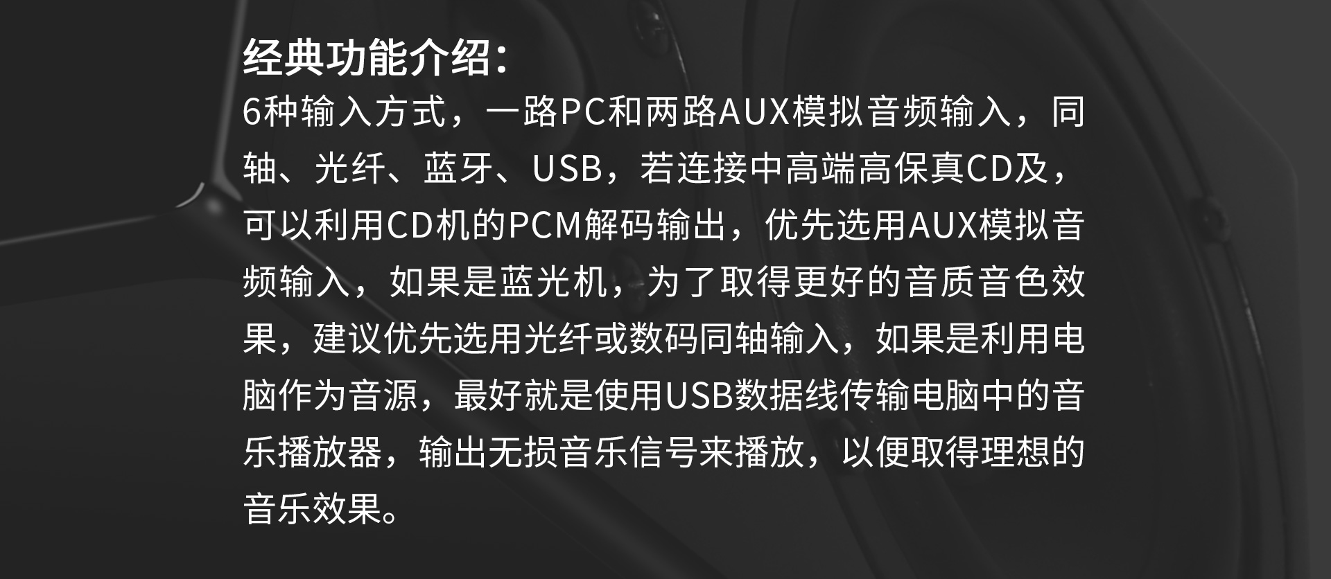 三、主要功能表述 支持多種電視及音響設備,輕松聽您想聽 。同時支持藍牙、光纖、同軸、USB、一路數字音頻信輸入號兩路模擬信號輸入接口,一機多能。能與多種音源設備配套使用,支持手機、播放器、CD、DVD、電腦音頻,功能強大,使用方便。 操作簡單,預置多種音效模式,切換自如。一切的進步,源于對更高生活品質的追求,多種聽音模式可隨心選擇,更有強中弱三種強度選擇一鍵切換,不再為如何調節音效而惱火,聆聽更舒暢!使用更快捷! 給您不一樣聽音驚喜。小體積,大能量。聲音洪亮,音質醇厚,令人驚訝!電影聲場感震撼,脫箱感強烈。 近場聆聽的不二之選、針對小空間聲學環境的悉心調校,能夠近距離聆聽到更多的細節,精準的聲場定位高水平的還原音質。使在小空間內享受音樂的舒適度更加顯露出來。