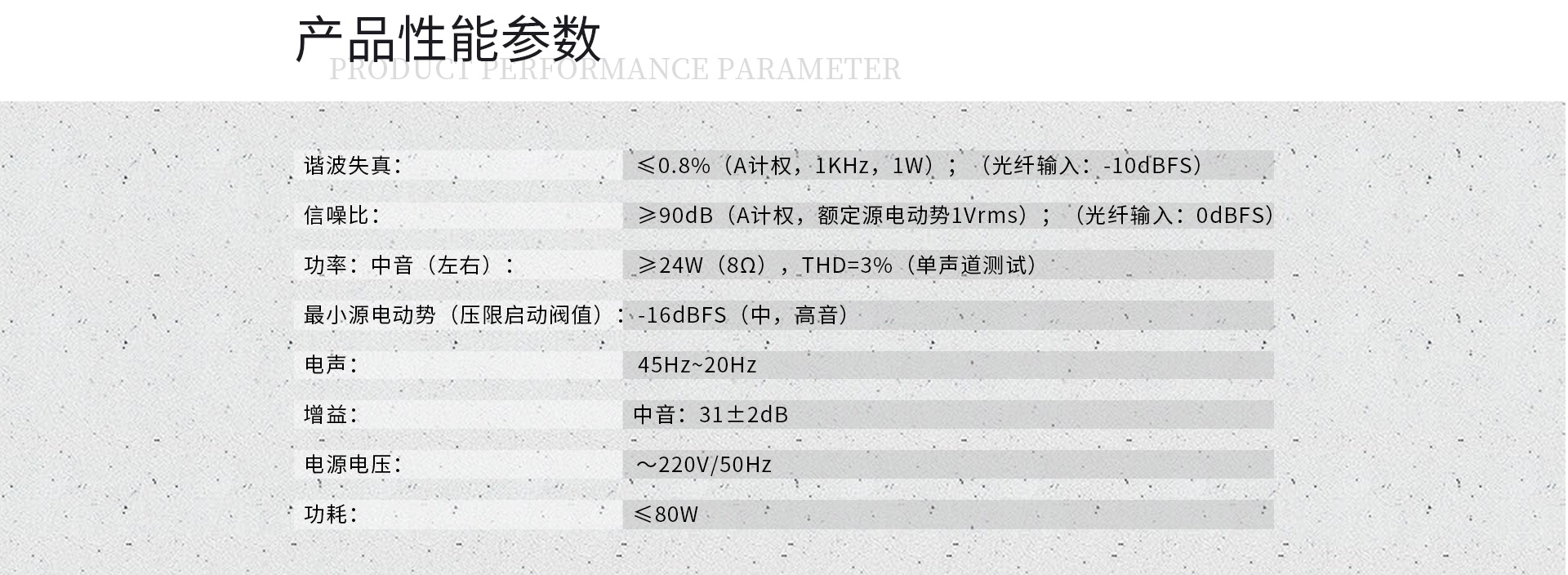 諧波失真:≤0.8%(A計權,1KHz,1w);(光纖輸入:-10dBFS) | 信噪比:≥90dB(A計權,額定源電動勢1Vrms);(光纖輸入:0dBFS) | ||