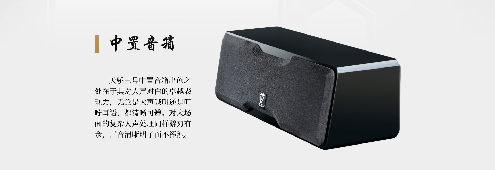 型號:天驕三號中置音箱 喇叭單元:1"x1+4"x2 頻率響應:70Hz-20KHz 功率:90W 額定阻抗:4Ω 靈敏度:85dB(1W·1M) 凈機尺寸:450x144x160mm 凈重:4.4Kg/只