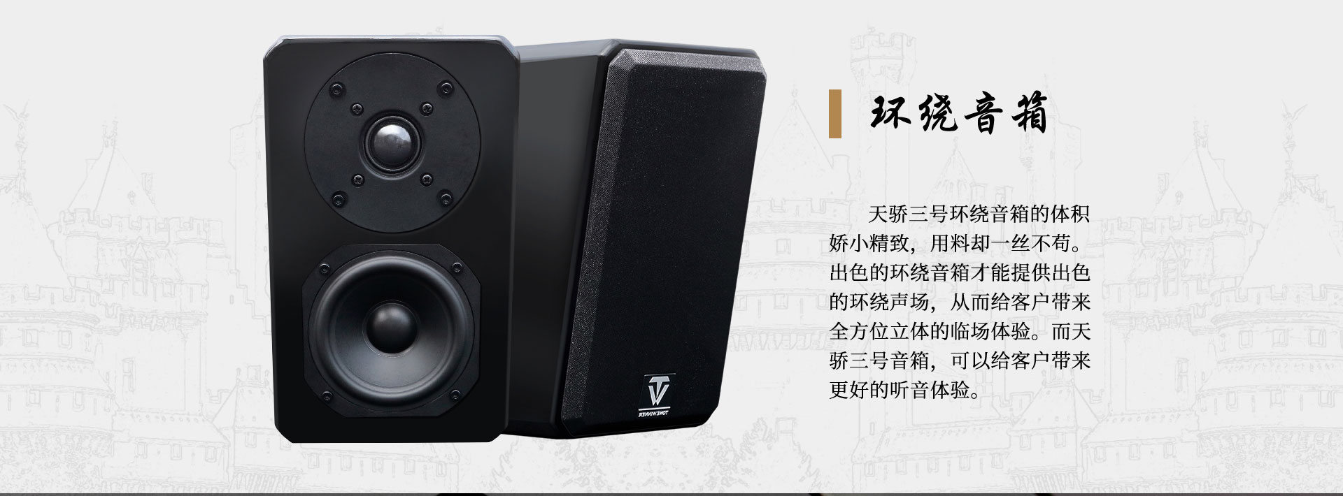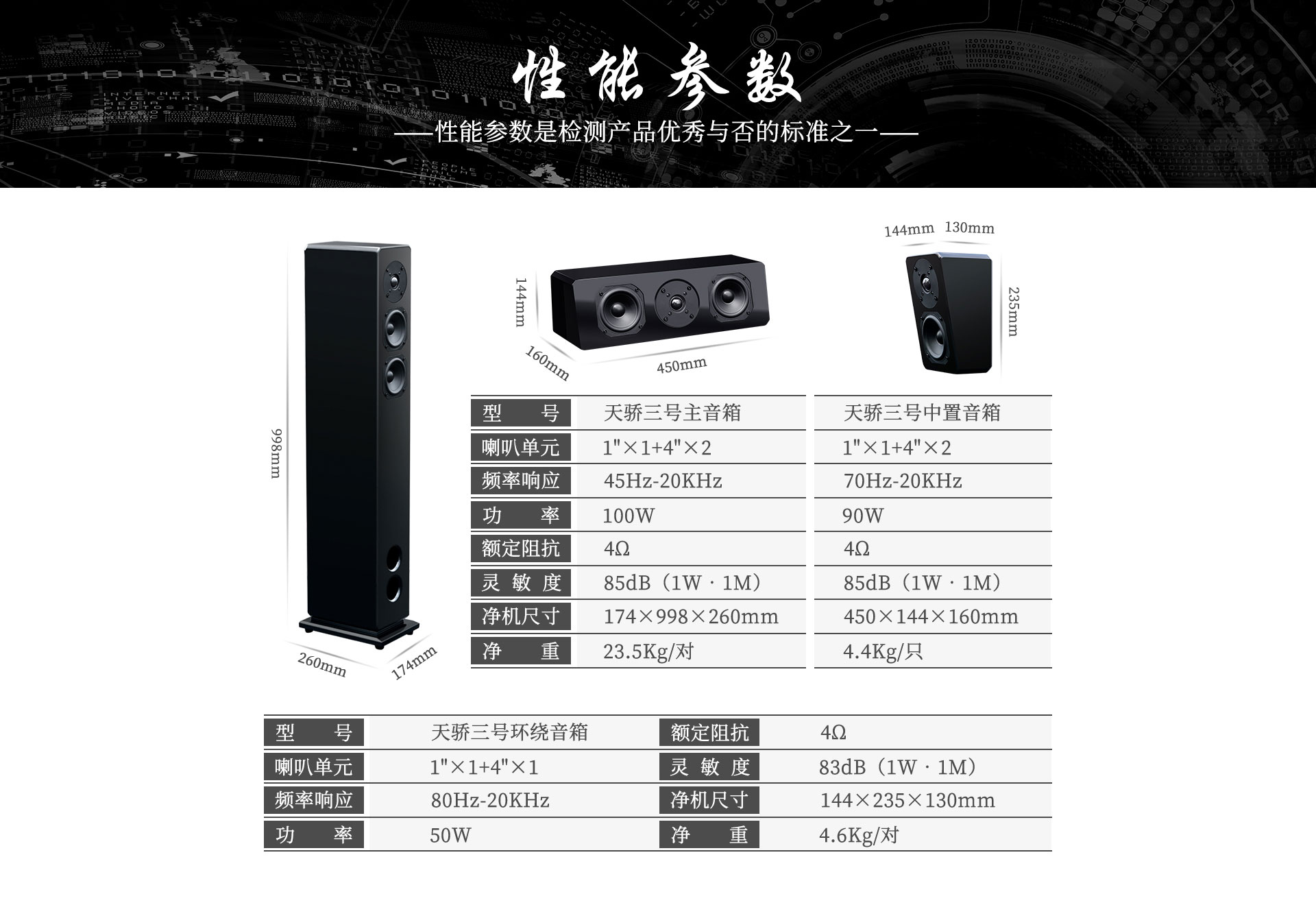 型號:天驕三號環繞音箱 喇叭單元:1"x1+4"x1 頻率響應:80Hz-20KHz 功率:50W 額定阻抗:4Ω 靈敏度:83dB(1W·1M) 凈機尺寸:144x235x130mm 凈重:4.6Kg/對 |