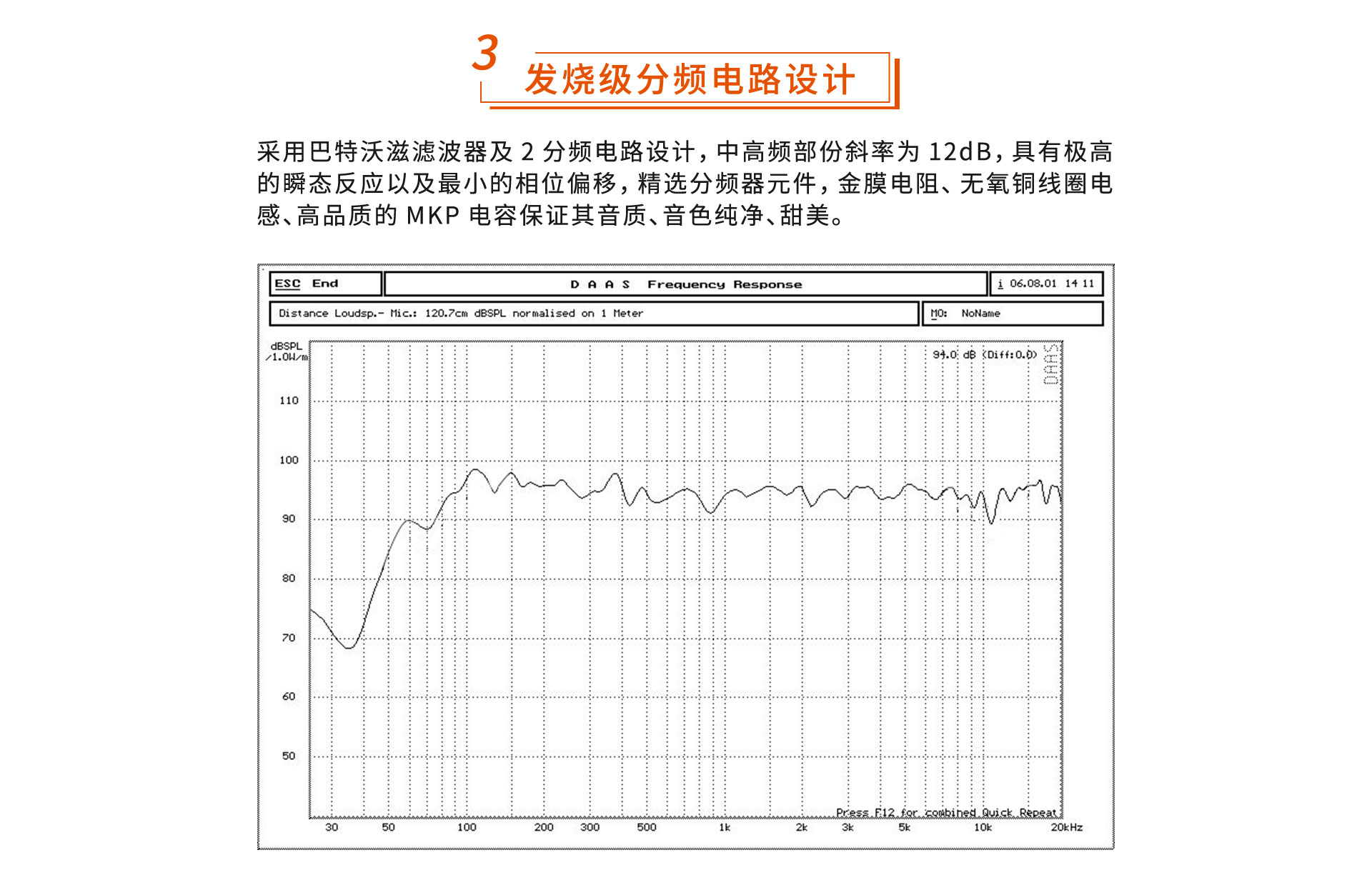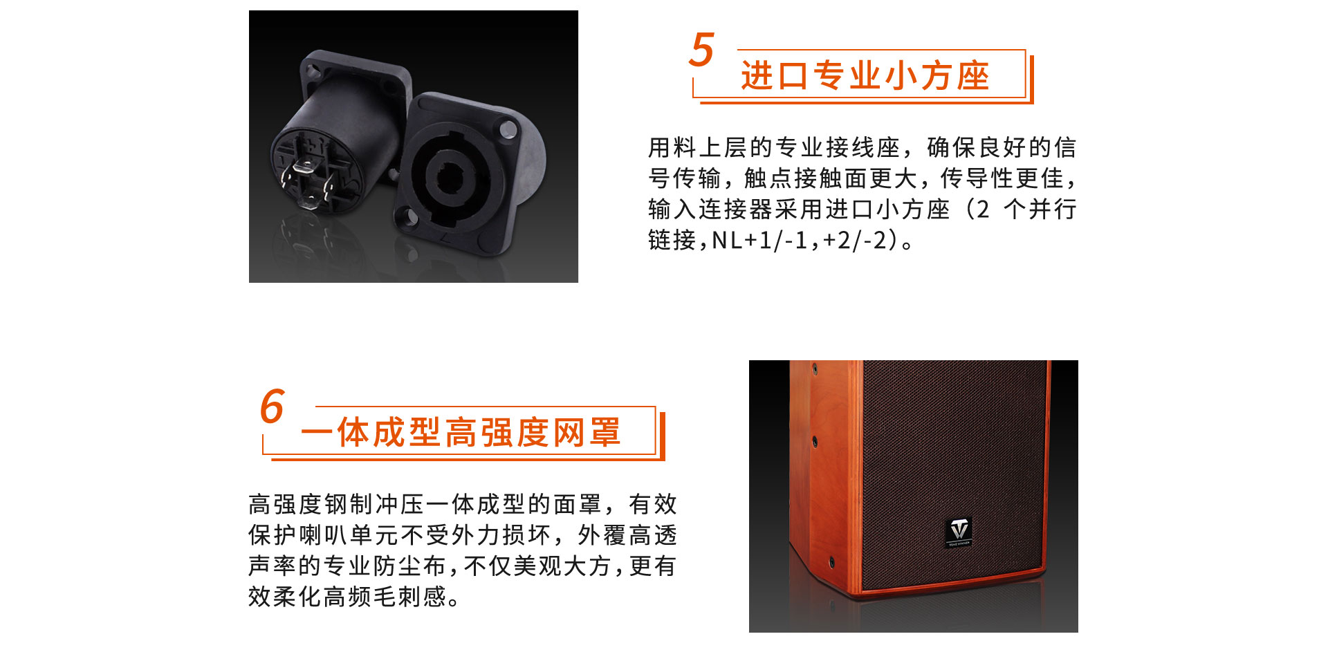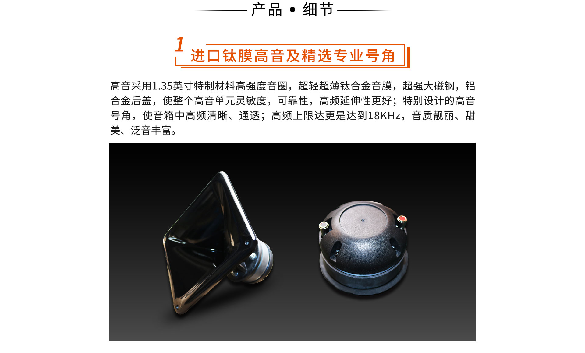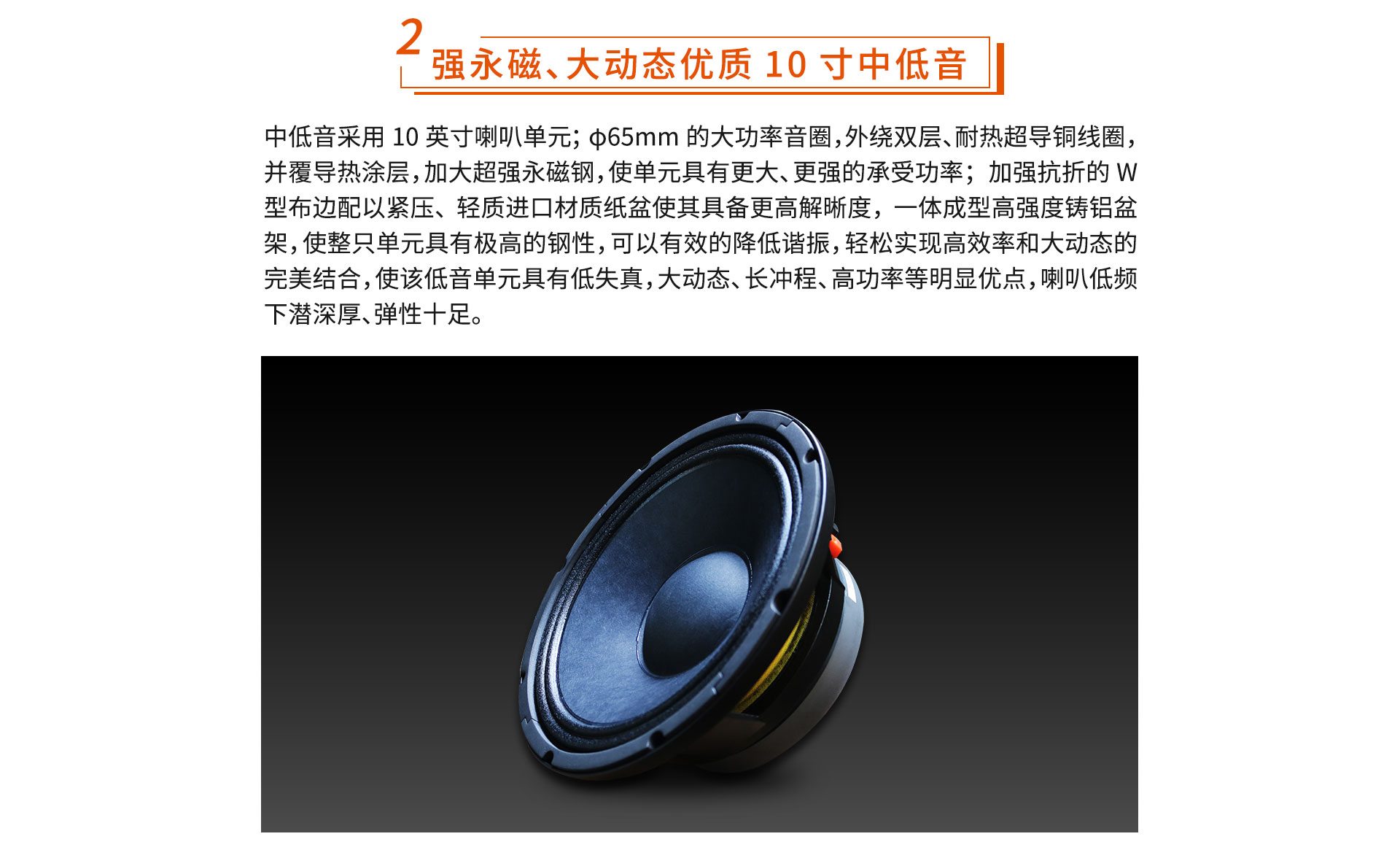 二、主要功能表述 兩分頻兩單元多功能專業全頻音箱; 1.35英寸超輕薄鈦合金音膜驅動器; 10英寸大動態專業低音單元; 采用巴特沃滋濾波器及2分頻電路設計,精選高品質MKP電容及無氧銅線圈電感; 精確的后倒相設計,整箱低頻瞬態良好,聲音的質感明晰、音色溫暖醇厚,高頻延伸自然、細膩、泛音豐富。