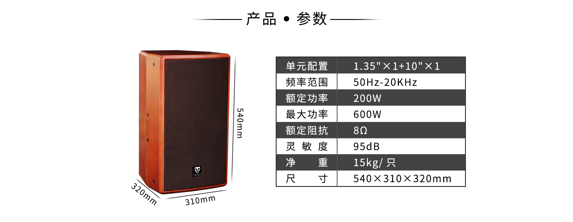 三、產品主要性能指標 單元配置:1.35"×1+10"×1 頻率范圍:50Hz-20KHz 靈敏度:95dB 額定阻抗:8Ω 額定功率:200W 最大功率:600W 凈重:15Kg/只 箱體尺寸:540×310×320mm
