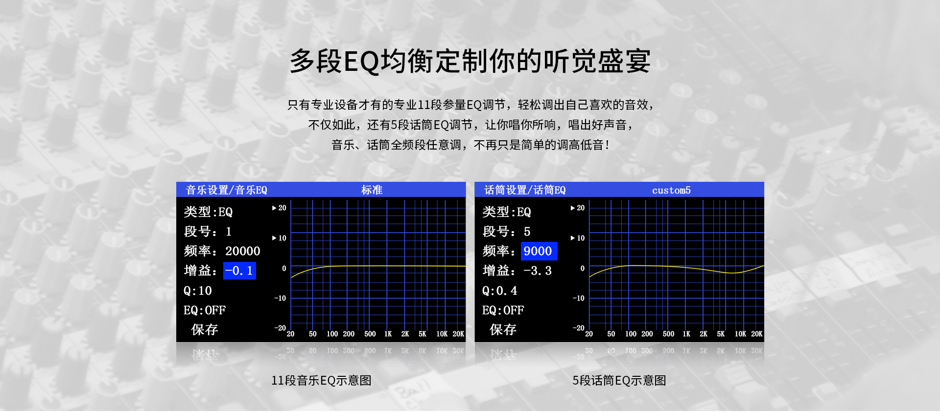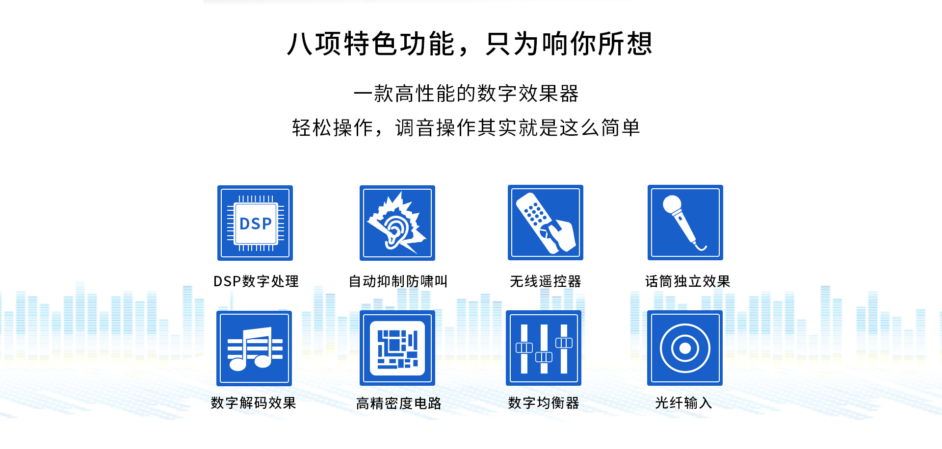 產品性能參數: 諧波失真:音樂:≤0.03%(A計權) 話筒:≤0.1%(A計權)