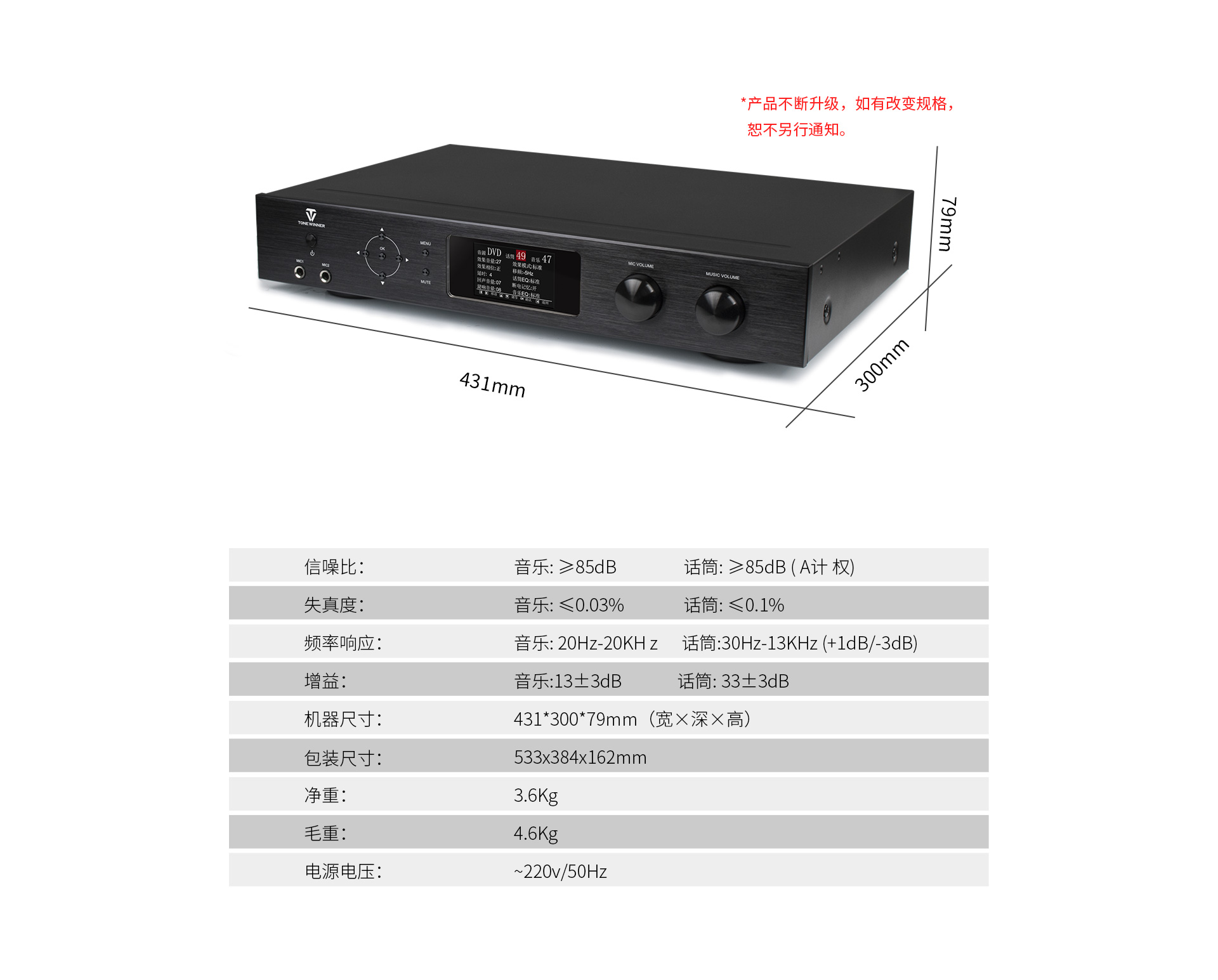 性 噪 比:音樂:≥85dB(A計權) 話筒:≥85dB(A計權) 頻 響:音樂:20Hz~20KHz(+1dB/-3dB) 話筒:30Hz~13KHz(+1dB/-3dB) 增 益:音樂:13±3dB 話筒:33±3dB 凈 重:3.6Kg 毛 重:4.6Kg 整機尺寸:444x401(436)x88(107)mm寬×深×高 包裝尺寸:539x164x390mm寬×高×深