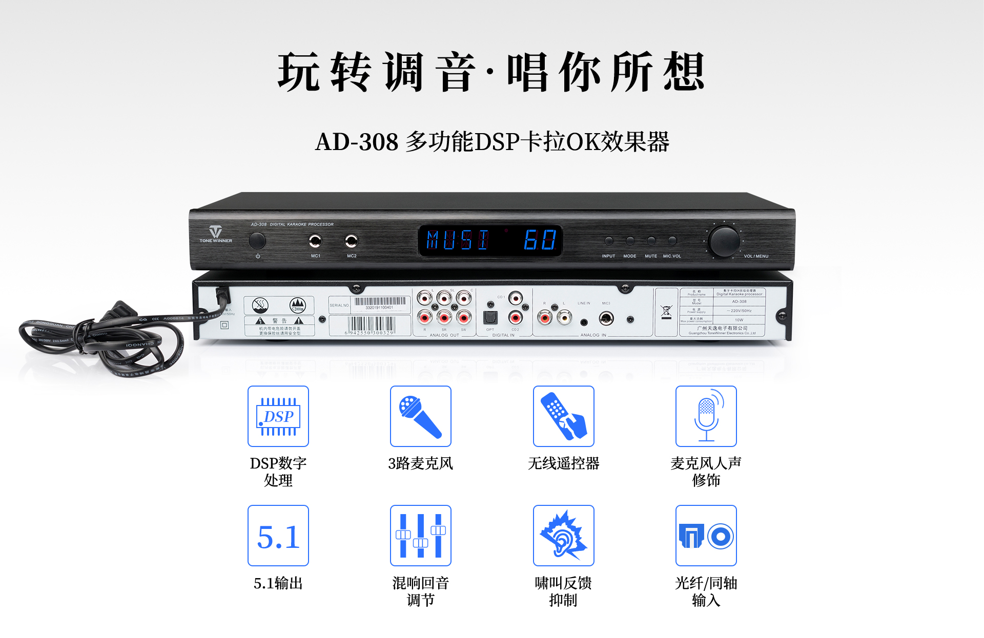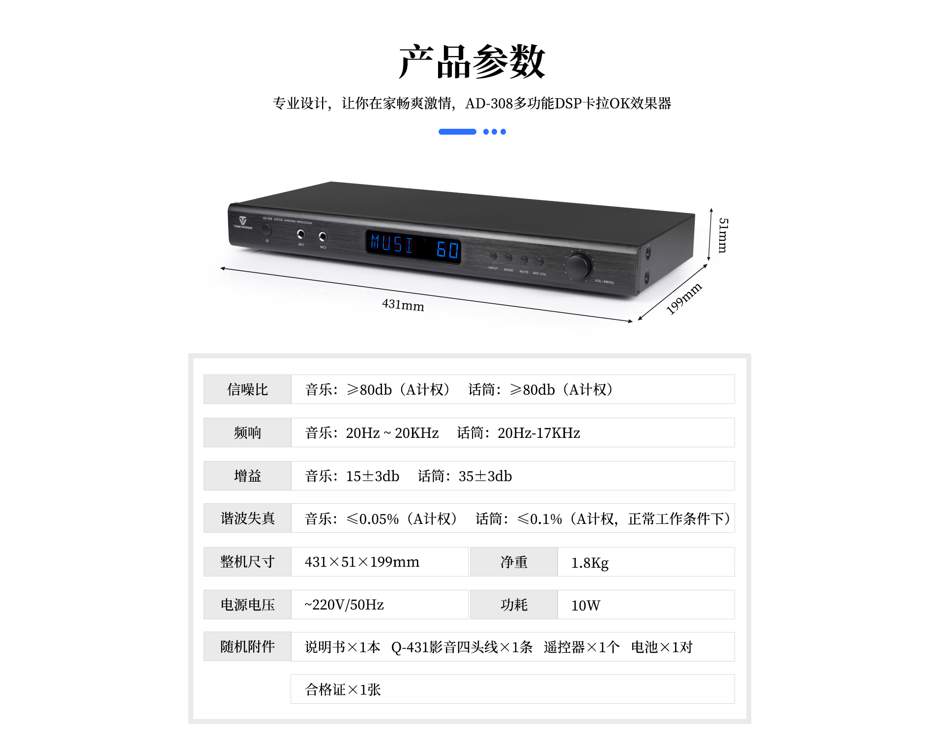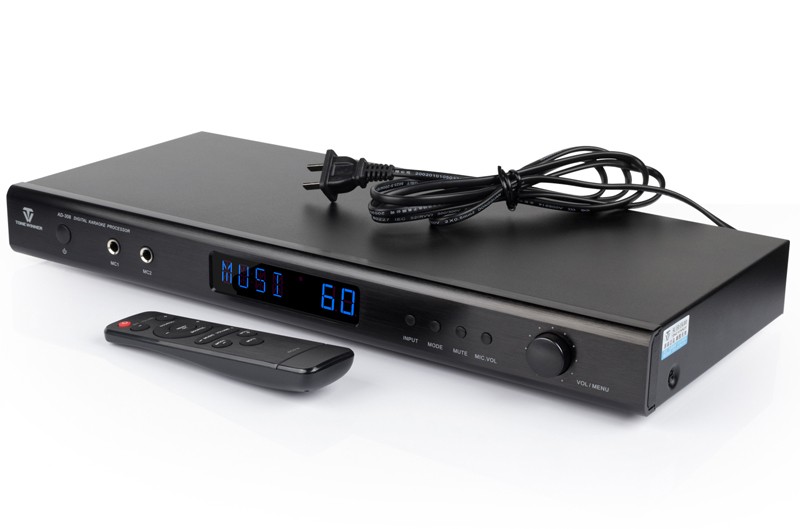 一、產品介紹 AD-308是天逸近年推出的一款高性能、多功能卡拉OK效果器,采用專業級DSP數字處理,內置高反饋抑制模塊,9級數字防嘯叫,讓音質更純凈,演唱更輕松。支持3.5mm、模擬、同軸和光纖等音源輸入,5.1卡拉OK輸出接口。更專業的設計,滿足你的個性化需求,“將KTV搬回家。” 二、功能介紹 1、專業DSP卡拉OK算法,多種話筒音效調節。 2、9級數字防嘯叫,音質更純凈。 3、支持3.5mm、模擬、同軸和光纖等音源輸入。 4、多功能紅外遙控器。 5、支持3路話筒輸入(2組有線,1組無線) 三、產品性能參數 信噪比:音樂:≥80db (A計權);話筒::≥80db (A計權) 頻響:音樂: 20Hz—20KHz;話筒: 20Hz-17KHz 增益:音樂: 15士3db 話筒: 35土3db 諧波失真:音樂:≤0.05% (A計權);話筒: ≤0.1% (A計權,正常工作條件下) 整機尺寸:431X51X199 mm 凈重:1.8Kg 電源電壓:~220V/50Hz 功耗:10W 隨機附件:說明書X1本Q-431影音四頭線X1條 遙控器X1個 電池X1對 合格證X1張 |
