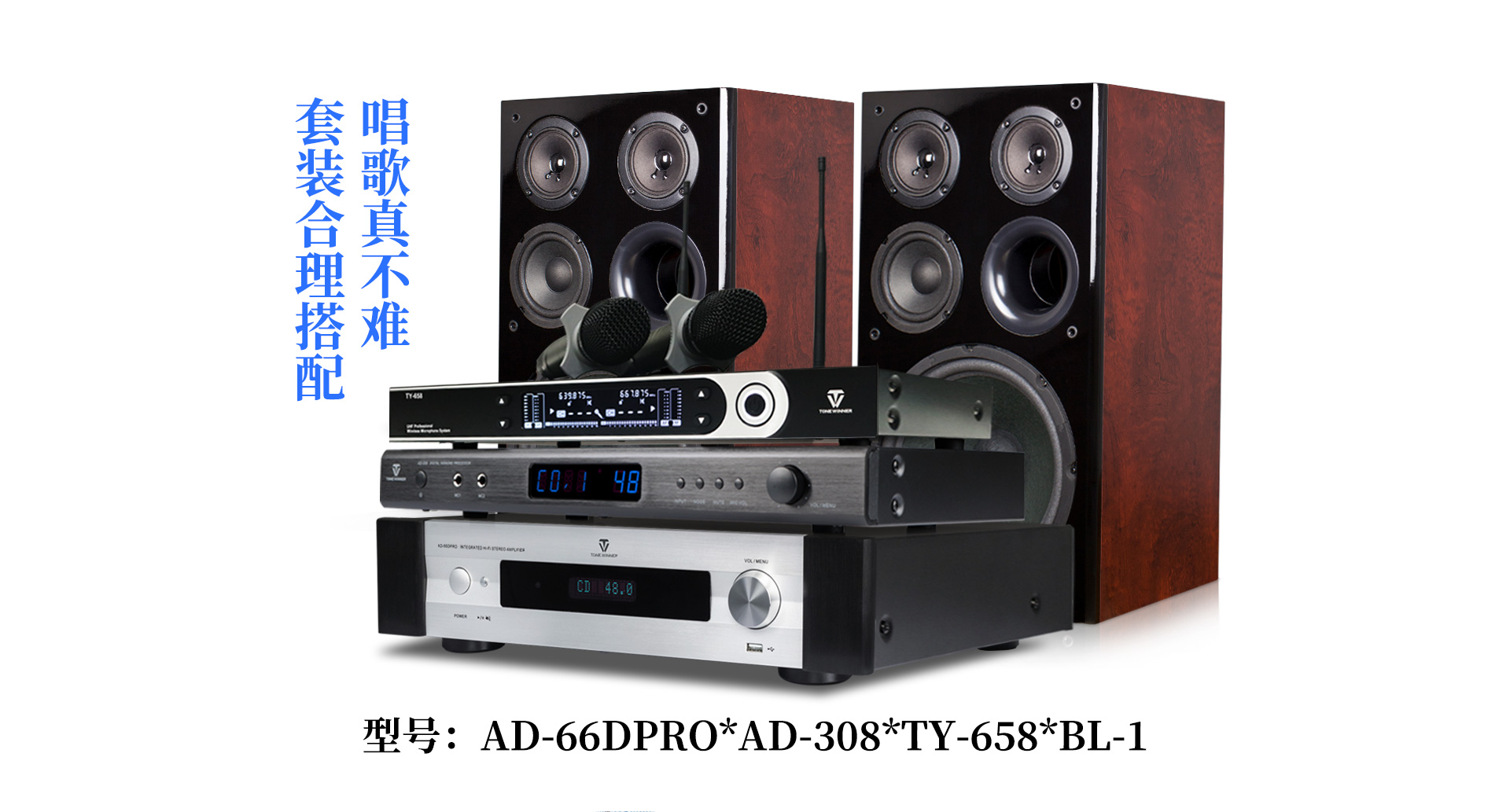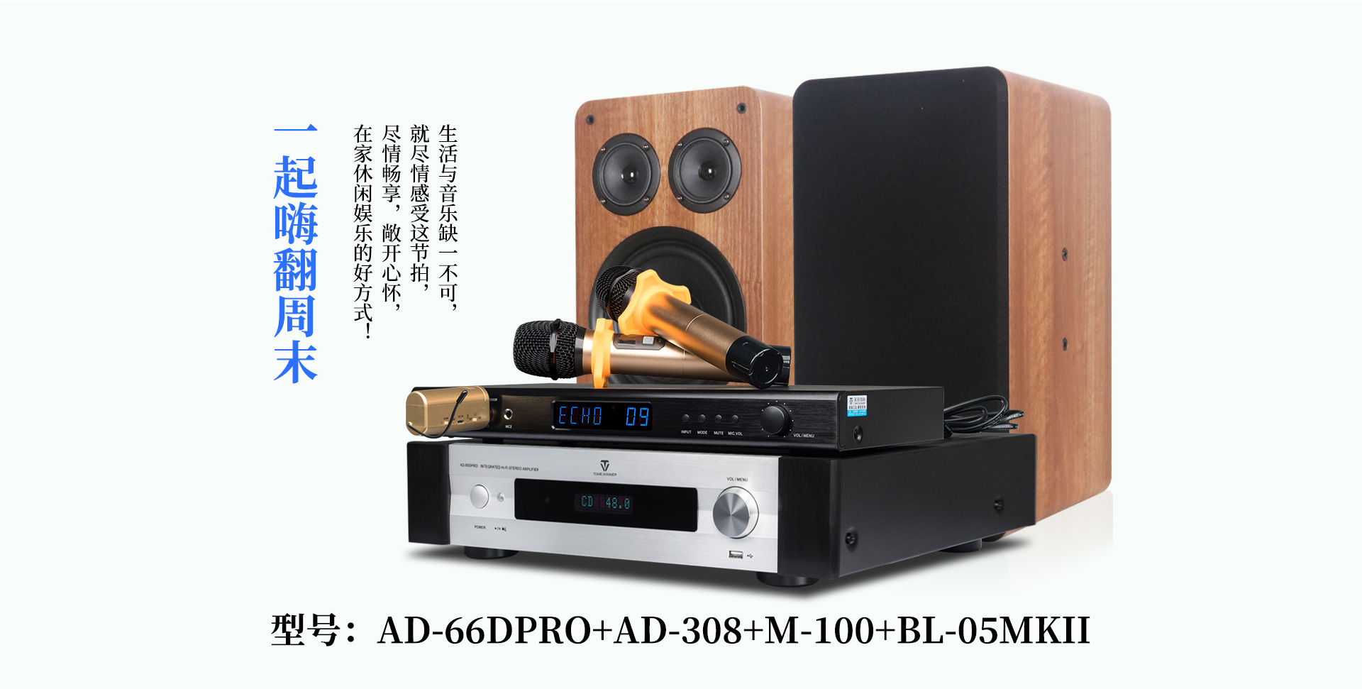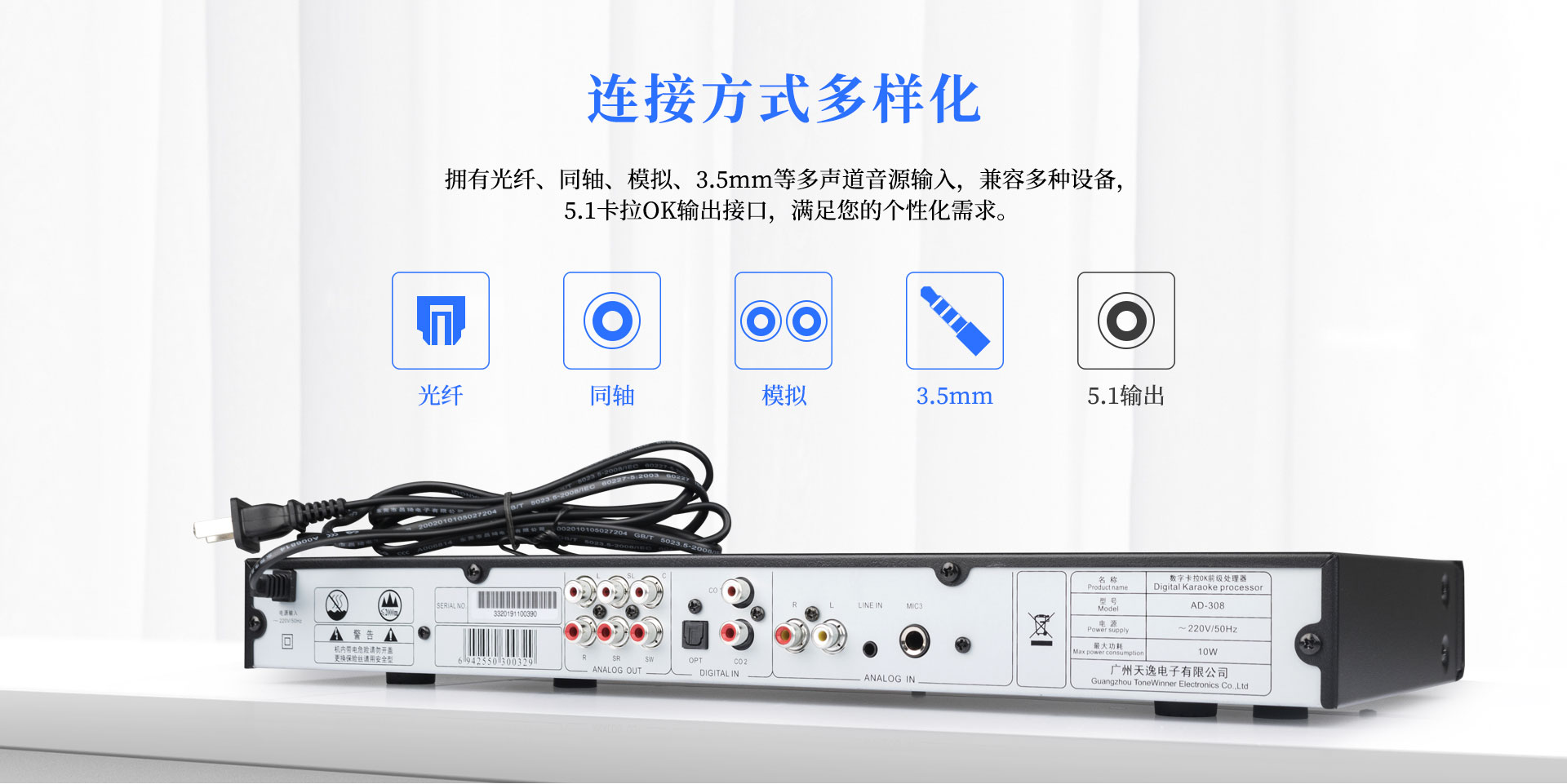 一、產品介紹 AD-308是天逸近年推出的一款高性能、多功能卡拉OK效果器,采用專業級DSP數字處理,內置高反饋抑制模塊,9級數字防嘯叫,讓音質更純凈,演唱更輕松。支持3.5mm、模擬、同軸和光纖等音源輸入,5.1卡拉OK輸出接口。更專業的設計,滿足你的個性化需求,“將KTV搬回家。” 二、功能介紹 1、專業DSP卡拉OK算法,多種話筒音效調節。 2、9級數字防嘯叫,音質更純凈。 3、支持3.5mm、模擬、同軸和光纖等音源輸入。 4、多功能紅外遙控器。 5、支持3路話筒輸入(2組有線,1組無線) 三、產品性能參數 信噪比:音樂:≥80db (A計權);話筒::≥80db (A計權) 頻響:音樂: 20Hz—20KHz;話筒: 20Hz-17KHz 增益:音樂: 15士3db 話筒: 35土3db 諧波失真:音樂:≤0.05% (A計權);話筒: ≤0.1% (A計權,正常工作條件下) 整機尺寸:431X51X199 mm 凈重:1.8Kg 電源電壓:~220V/50Hz 功耗:10W 隨機附件:說明書X1本Q-431影音四頭線X1條 遙控器X1個 電池X1對 合格證X1張 |