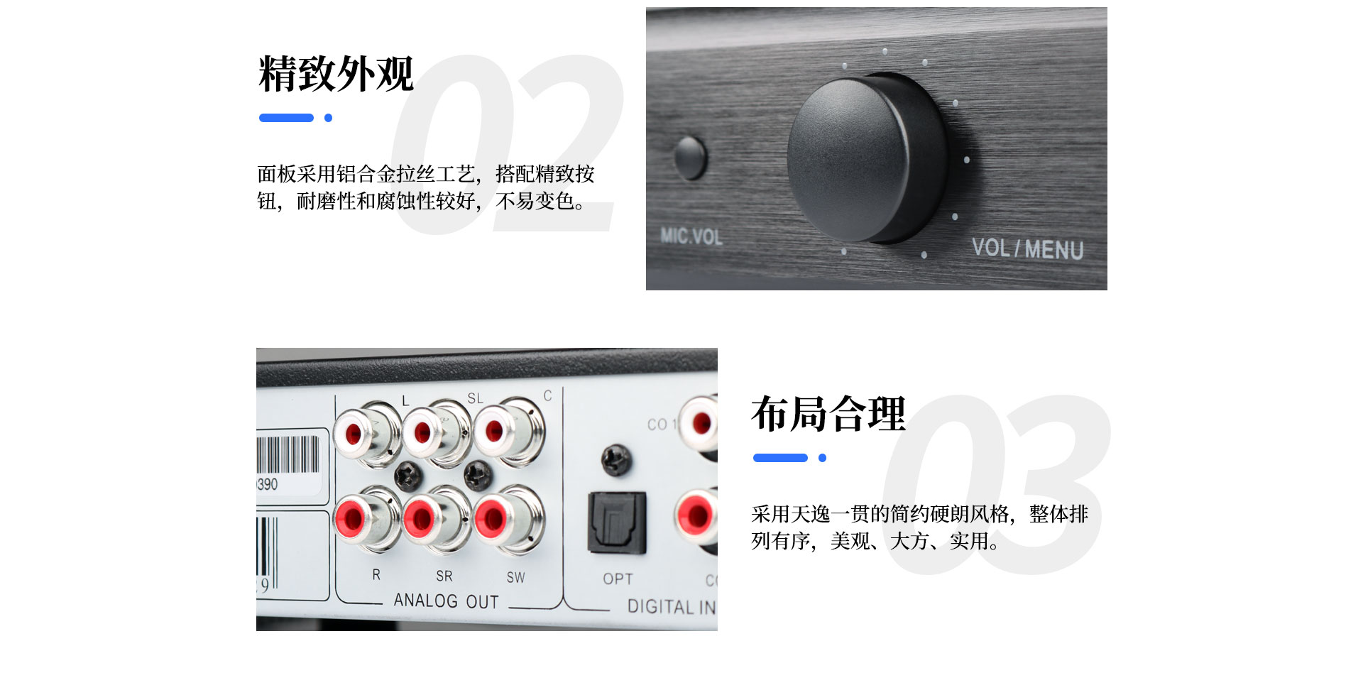 失真度:音樂:≤ 0.05%(A計權); 話筒:≤ 0.1%(A計權,正常工作條件下) | 頻 響:音樂:20Hz~20KHz;話筒:20Hz~17KHz |