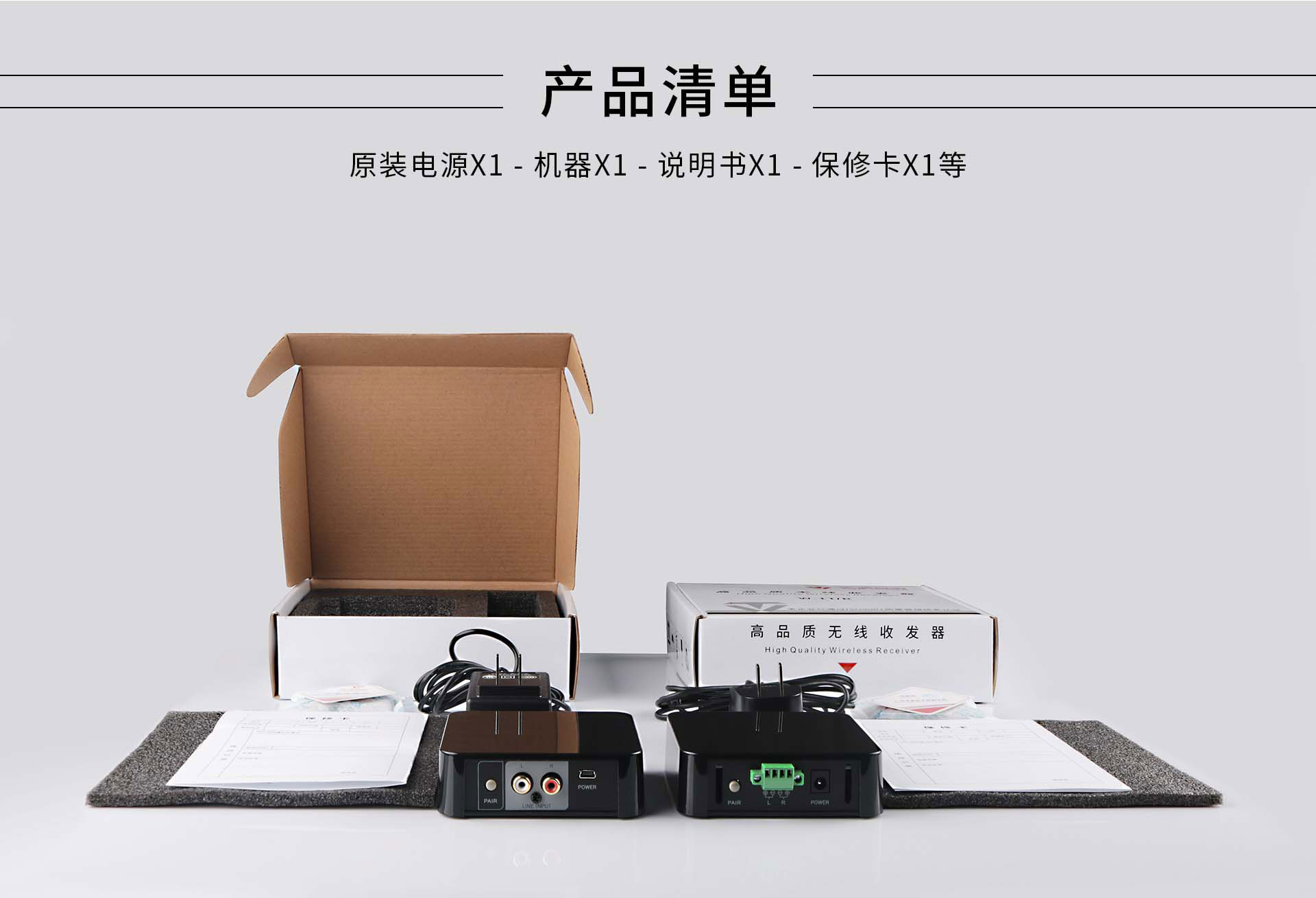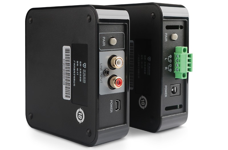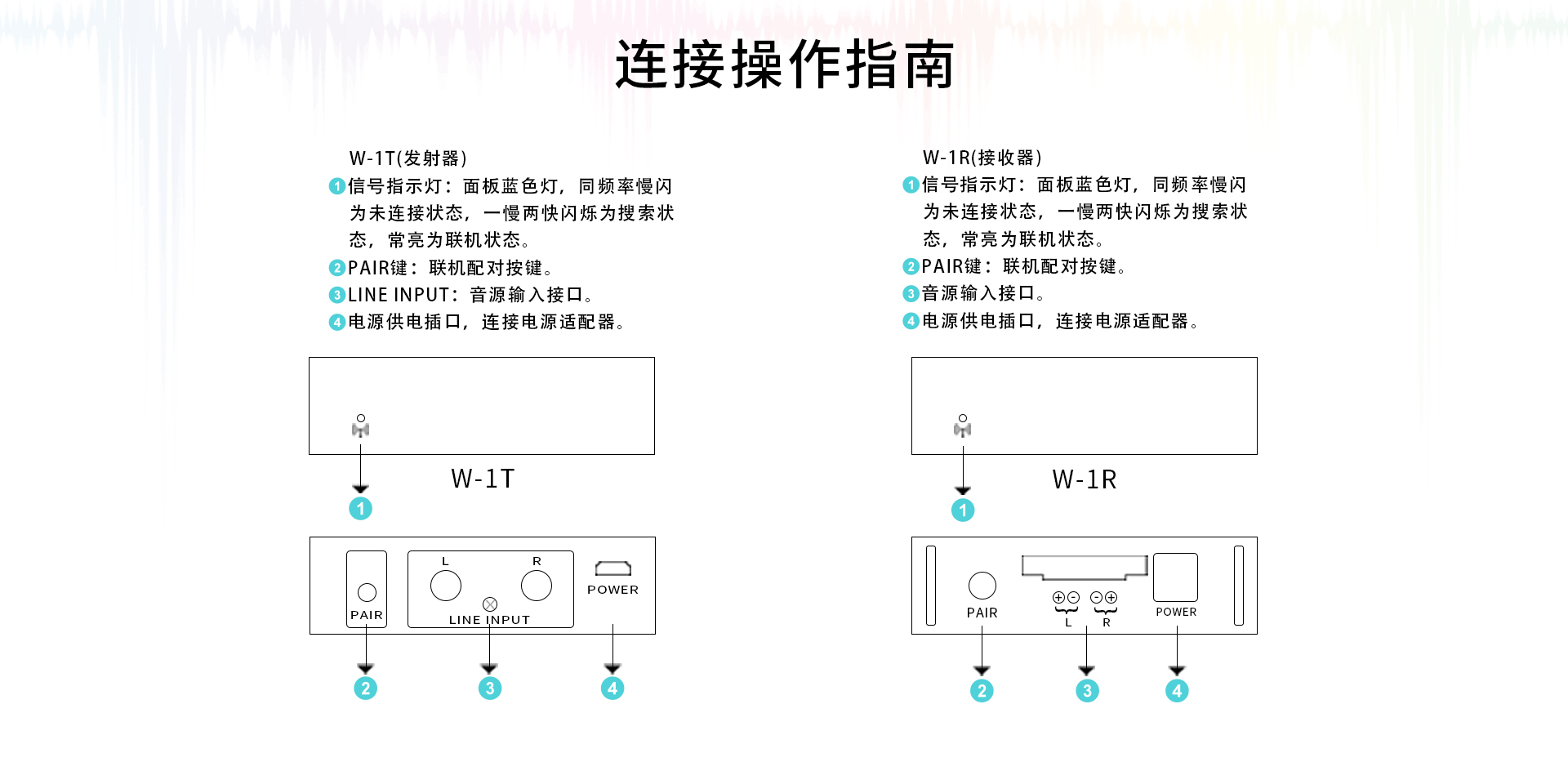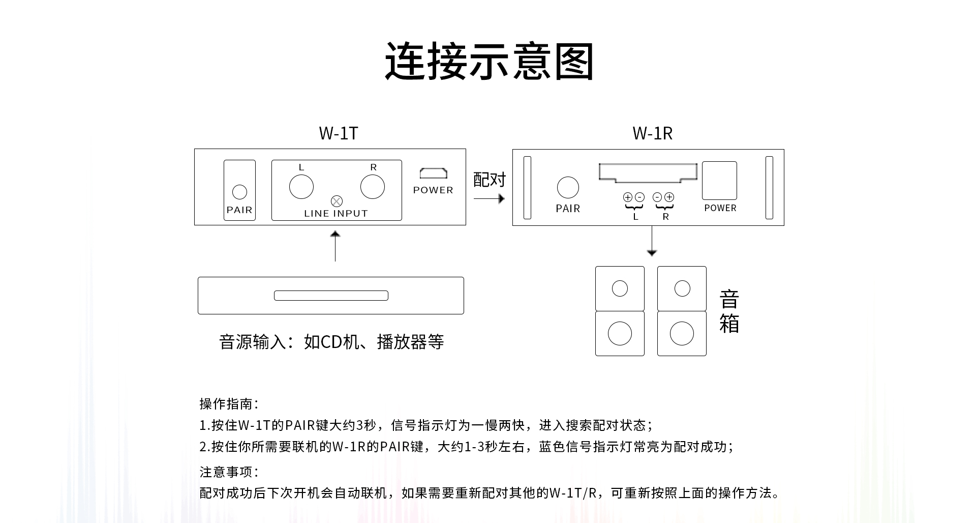 三、使用方法 W-1T提供LINE OUT(模擬L/R音頻)輸出,W-1R采用專業(yè)鳳尾接口,操作使用都非常方便,具體使用方法如下: 1.將W-1T與功放、CD機(jī)的信號(hào)輸出端口相連,將W-1R與音箱相連接; 2.長(zhǎng)按W-1T的PAIR鍵幾秒,藍(lán)色信號(hào)燈開始一慢兩快閃爍時(shí),進(jìn)入配對(duì)模式; 3.長(zhǎng)按W-1R的PAIR鍵幾秒,藍(lán)色指示燈常亮起時(shí),表示配對(duì)成功; 4.將收發(fā)器接通電源,即可投入使用。 收發(fā)器配對(duì)成功后,下次使用將自動(dòng)進(jìn)入配對(duì)狀態(tài),非常方便。 W-1R可接受兩個(gè)信號(hào),即可以連接兩個(gè)音箱。