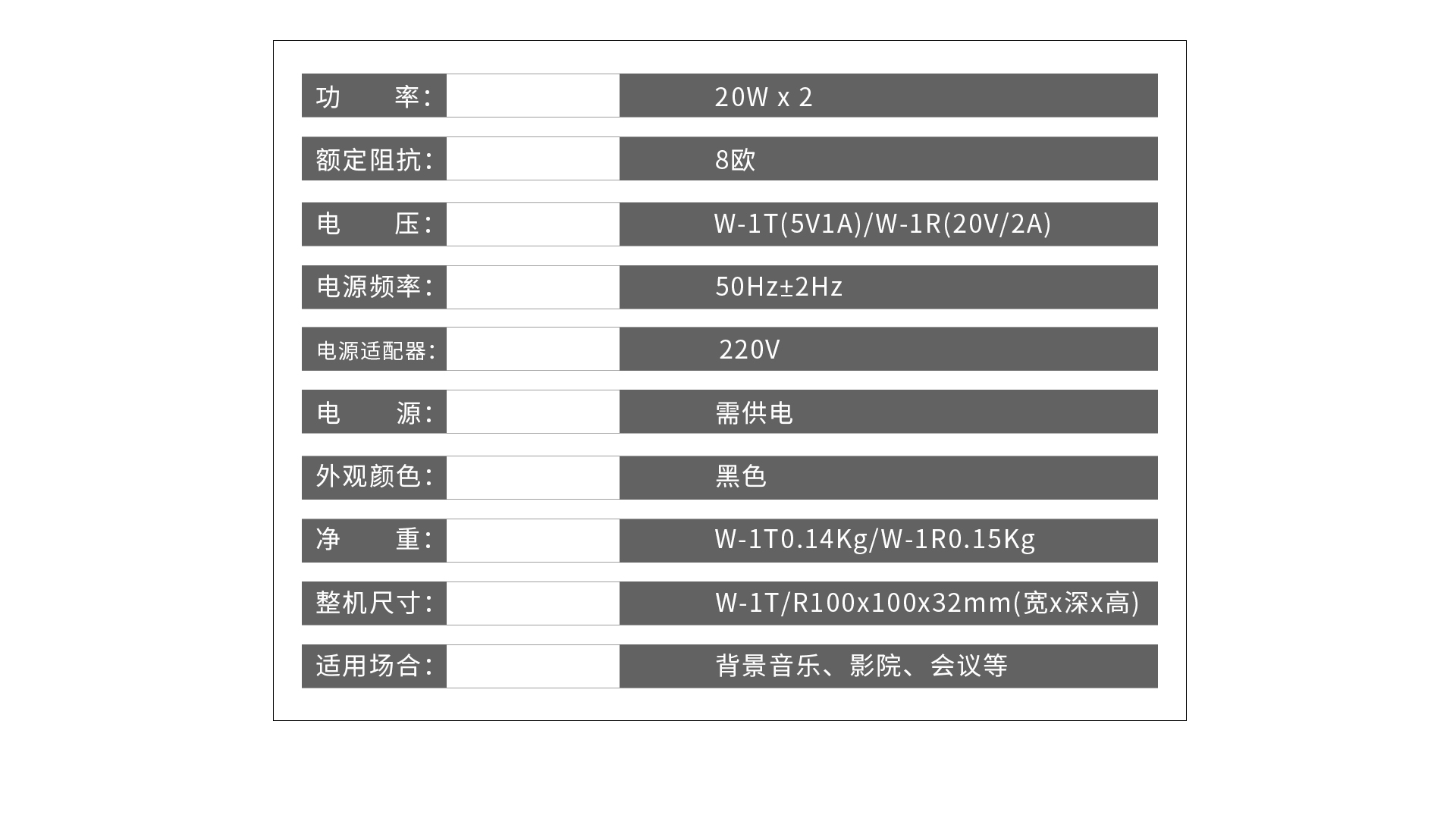 整機(jī)尺寸:W-1T/R 100×100×32mm(寬×深×高) | 使用場(chǎng)合:背景音樂、影院、會(huì)議等 |