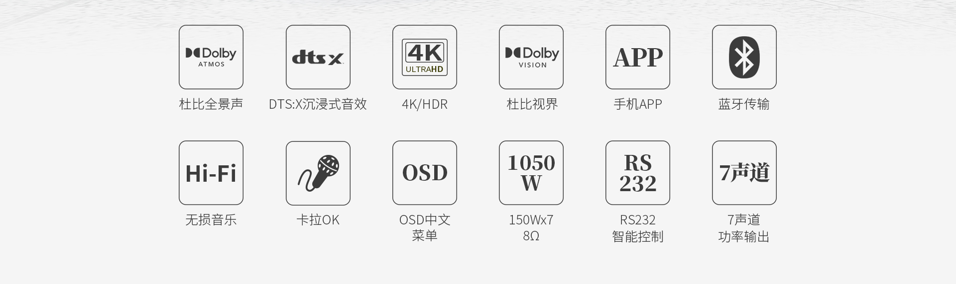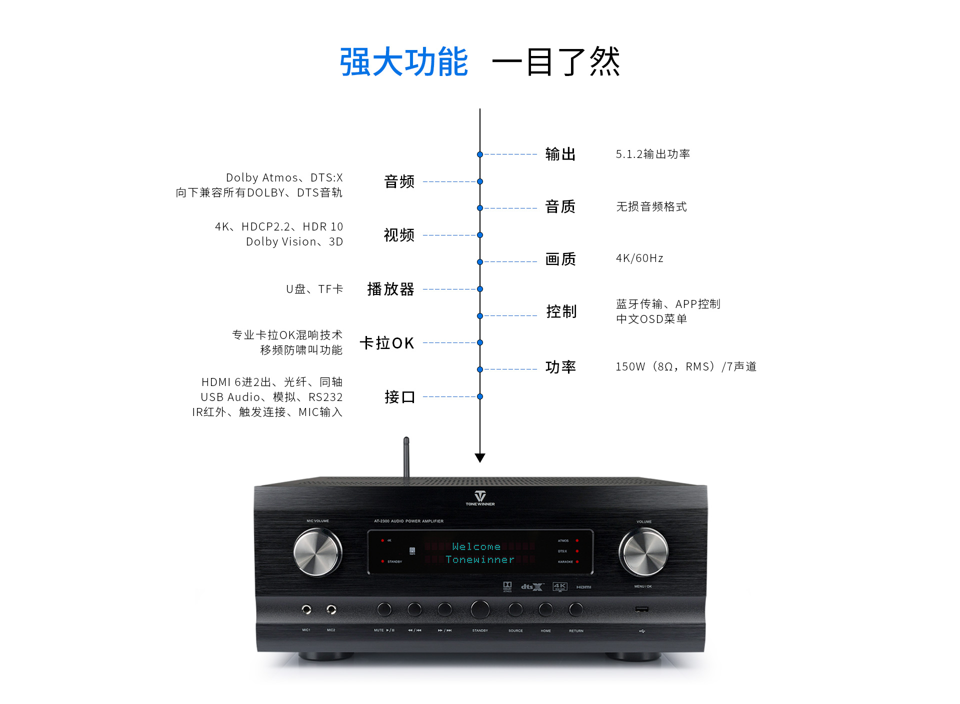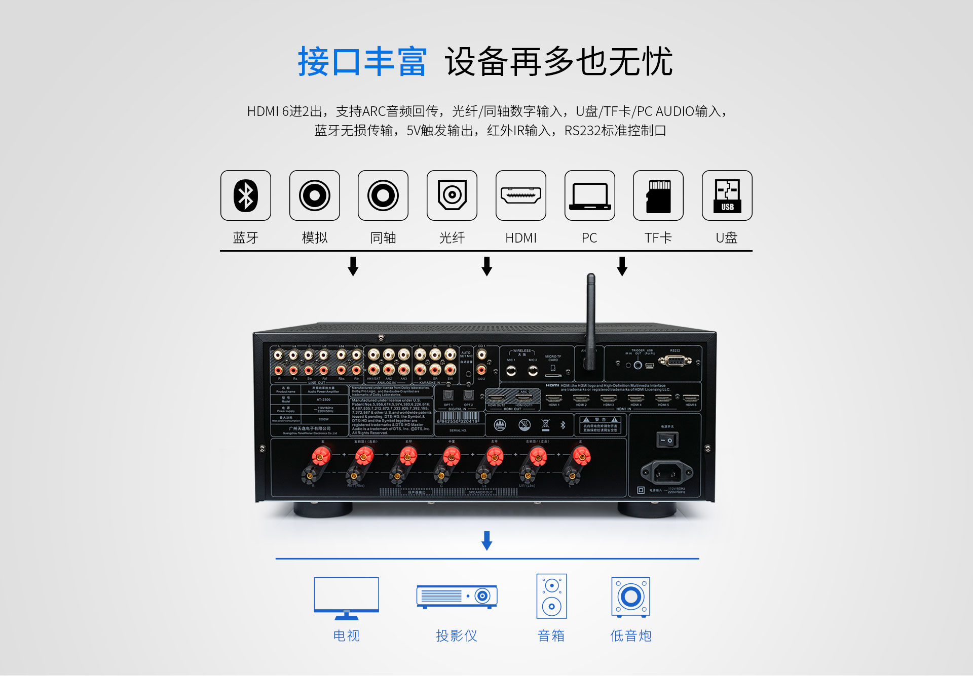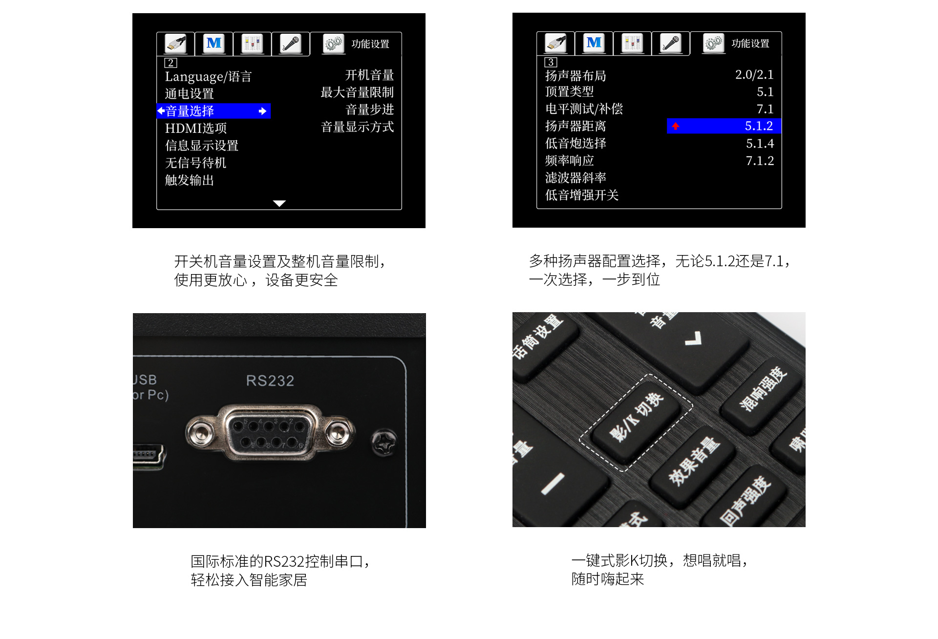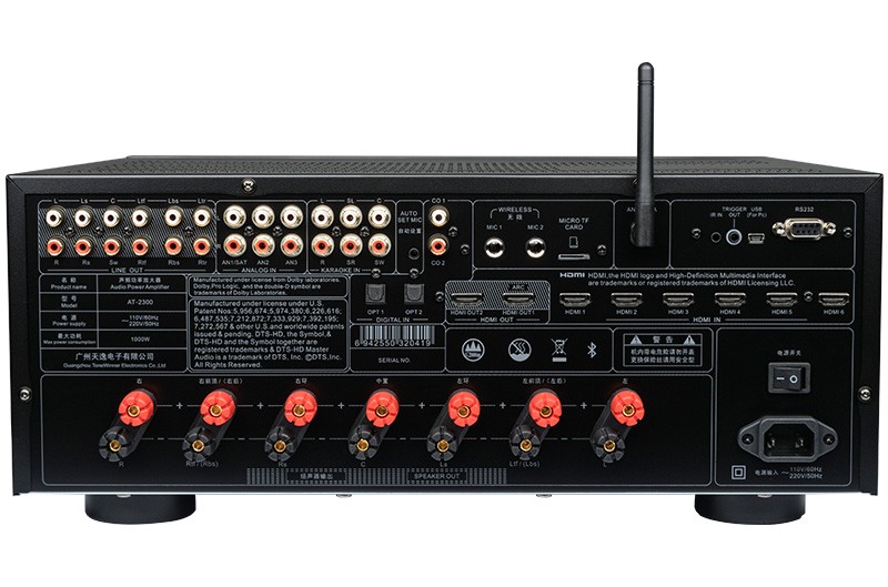 一、功能概述:1.支持Dolby Atmos、DolbyTrue-HD等所有杜比無損及有損壓縮音頻編碼文件; 2.支持DTS:X、DTS-Master等所有DTS無損及有損壓縮音頻編碼文件; 3.支持HDMI2.0,支持HDCP2.2; 4.支持4K/60Hz,RGB 4:4:4,18GHz全帶寬視頻信號,支持Dolby Vision及HDR 10視頻信號; 5.支持疊加式OSD屏幕菜單操作顯示; 6.內置卡拉OK功能,內置多抽頭式DSP混響處理器; 7.內置聽音房間自動測試及補償功能。頻譜特性的自動測試與補償,各聲道響度的自動測試與補償,各聲道距離的自動測試補償; 8.內置藍牙音頻接收器功能; 9.內置音頻播放器功能,支持TF卡及U盤音頻文件播放,支持FLAC、APE、WAV、MP3等多種無損及有損壓縮音頻格式,支持多層文件夾管理; 10.支持手機APP操作; 11.支持從2.0聲道到5.1.2聲道等多種揚聲器配置; 12.支持HDMI 6進2出,2組同軸2組光纖數碼音頻輸入,3組模擬音頻輸入; 13.支持5.1聲道外部混音輸入,可外掛混響器; 14.內置7x150W(8Ω,RMS)大功率H類HI-FI功放,可直接驅動5.1.2聲道配置的揚聲器; 15.支持RS232集中控制器; 16.支持HDMI ARC音頻回傳,支持CEC控制; 17.支持高達1秒的純音同步調節; 18.每聲道多達7~11段參數EQ; 19.支持音視頻混搭編組; 20.選用美國ADI最新一代雙核DSP處理器; 21.支持按輸入源獨立設置及保存參數的功能。