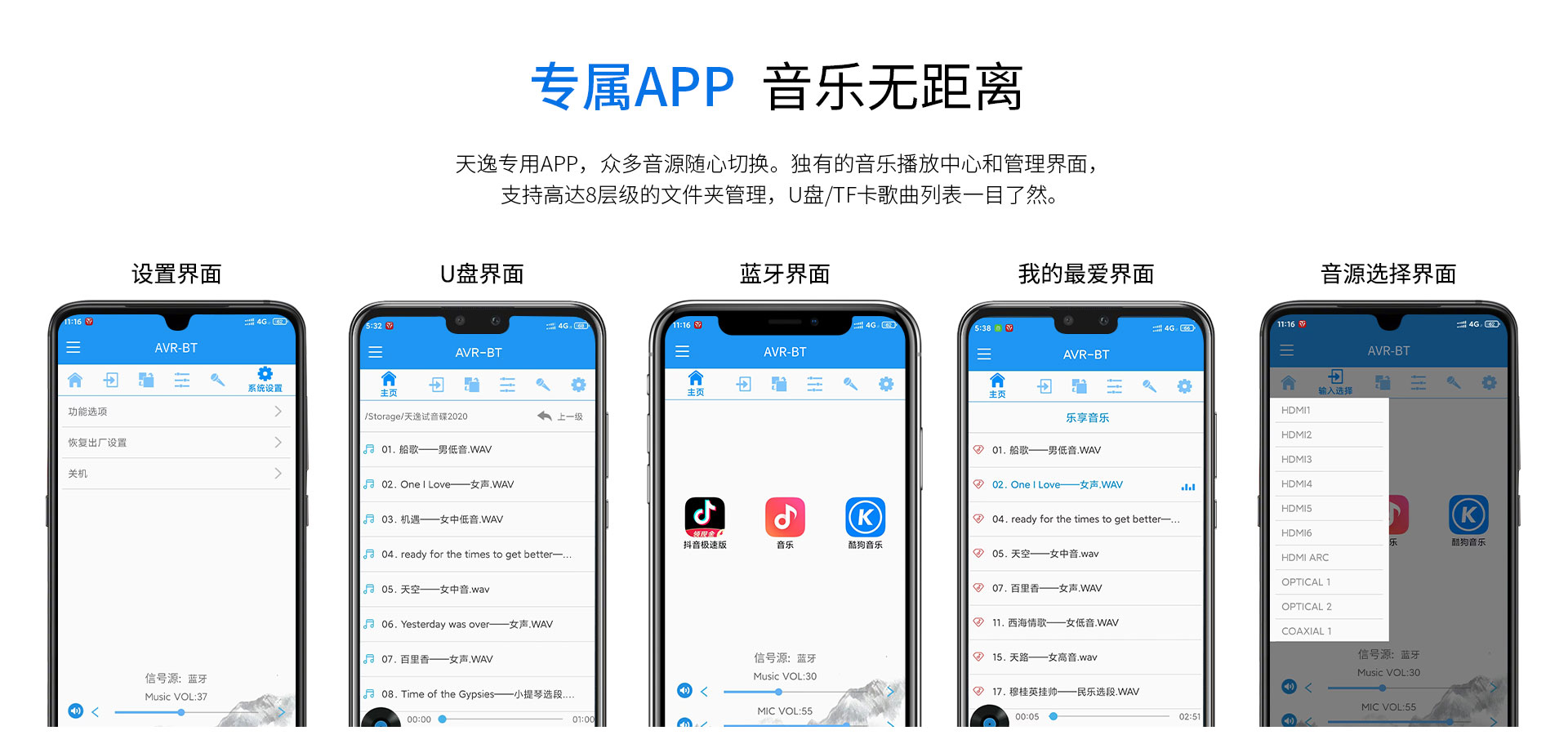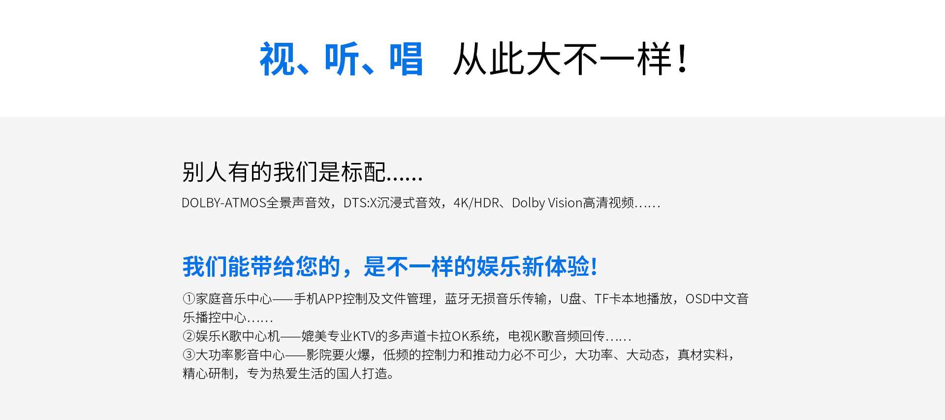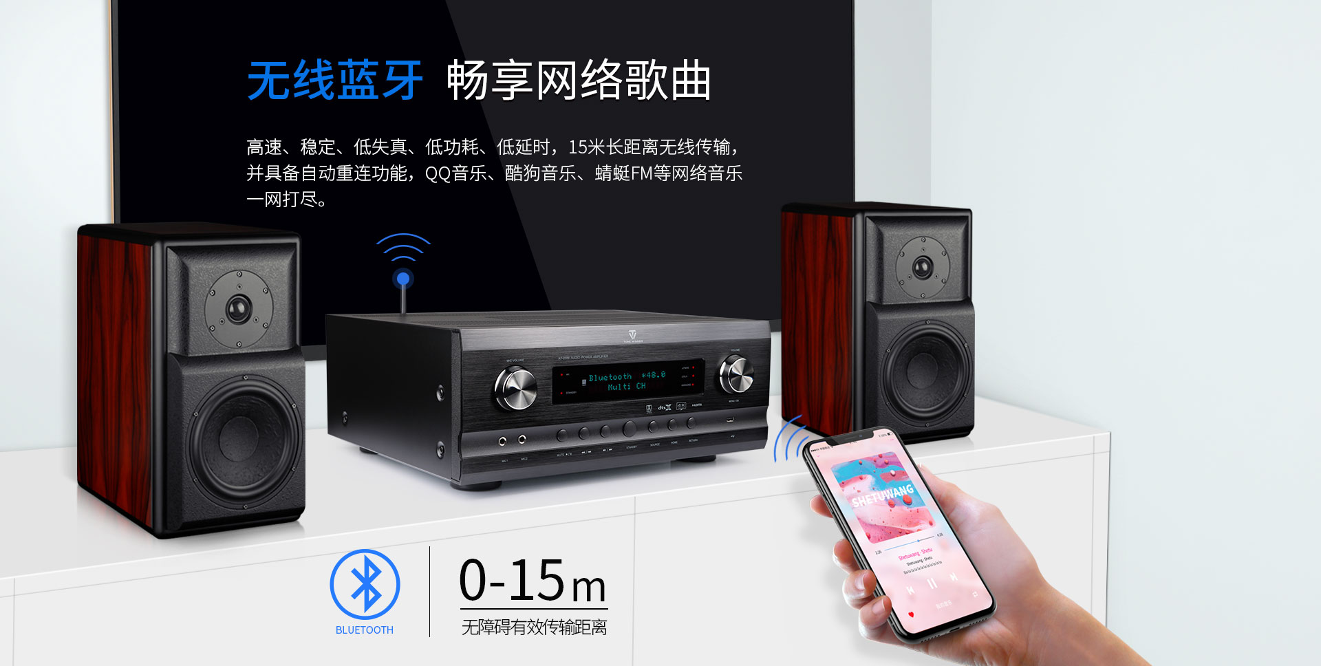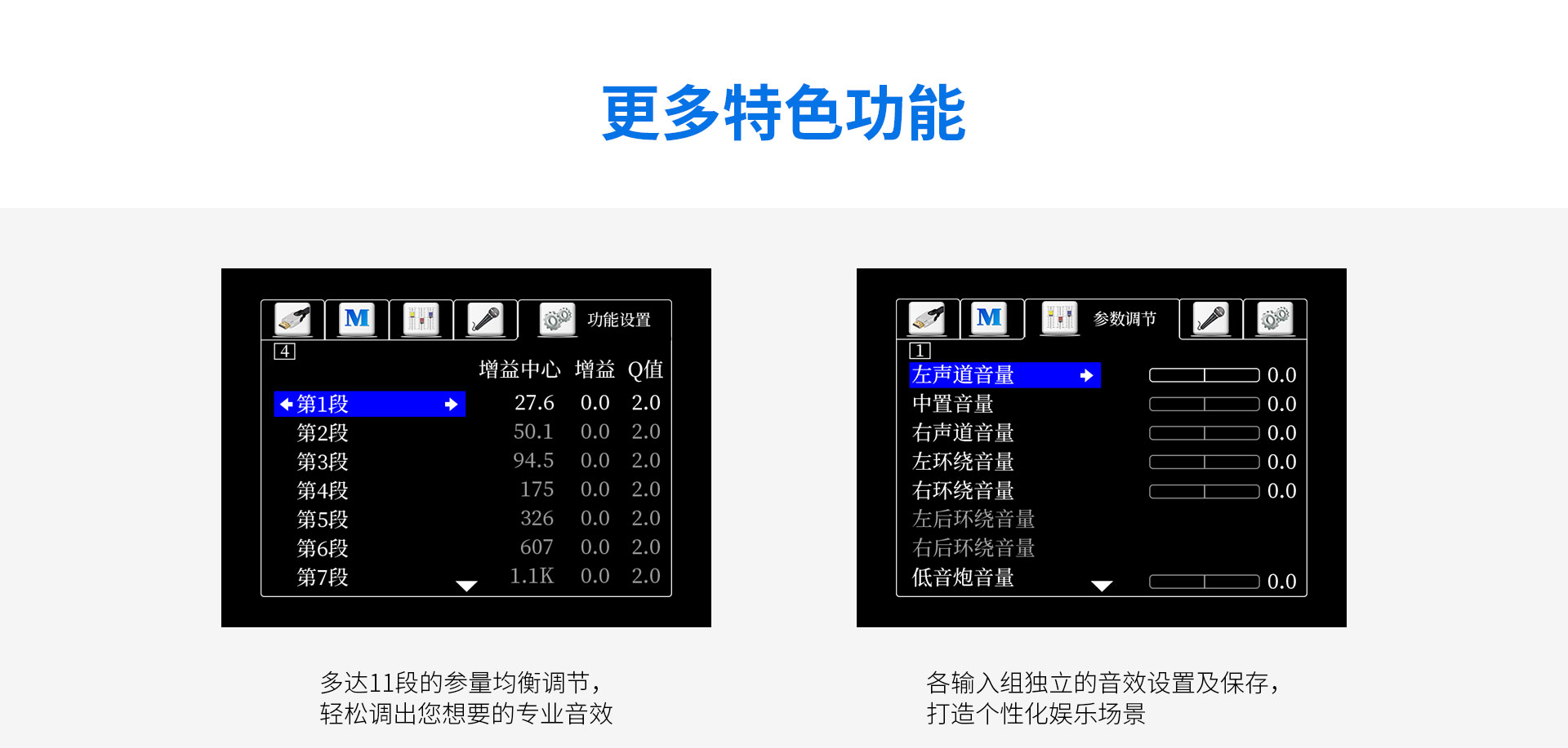 一、功能概述:1.支持Dolby Atmos、DolbyTrue-HD等所有杜比無損及有損壓縮音頻編碼文件; 2.支持DTS:X、DTS-Master等所有DTS無損及有損壓縮音頻編碼文件; 3.支持HDMI2.0,支持HDCP2.2; 4.支持4K/60Hz,RGB 4:4:4,18GHz全帶寬視頻信號,支持Dolby Vision及HDR 10視頻信號; 5.支持疊加式OSD屏幕菜單操作顯示; 6.內置卡拉OK功能,內置多抽頭式DSP混響處理器; 7.內置聽音房間自動測試及補償功能。頻譜特性的自動測試與補償,各聲道響度的自動測試與補償,各聲道距離的自動測試補償; 8.內置藍牙音頻接收器功能; 9.內置音頻播放器功能,支持TF卡及U盤音頻文件播放,支持FLAC、APE、WAV、MP3等多種無損及有損壓縮音頻格式,支持多層文件夾管理; 10.支持手機APP操作; 11.支持從2.0聲道到5.1.2聲道等多種揚聲器配置; 12.支持HDMI 6進2出,2組同軸2組光纖數碼音頻輸入,3組模擬音頻輸入; 13.支持5.1聲道外部混音輸入,可外掛混響器; 14.內置7x150W(8Ω,RMS)大功率H類HI-FI功放,可直接驅動5.1.2聲道配置的揚聲器; 15.支持RS232集中控制器; 16.支持HDMI ARC音頻回傳,支持CEC控制; 17.支持高達1秒的純音同步調節; 18.每聲道多達7~11段參數EQ; 19.支持音視頻混搭編組; 20.選用美國ADI最新一代雙核DSP處理器; 21.支持按輸入源獨立設置及保存參數的功能。