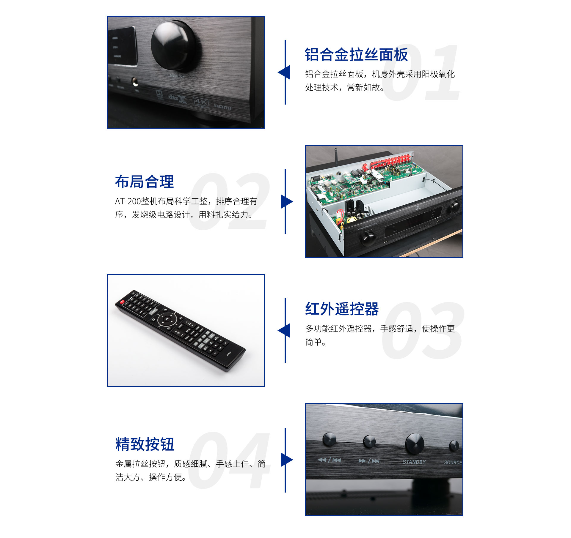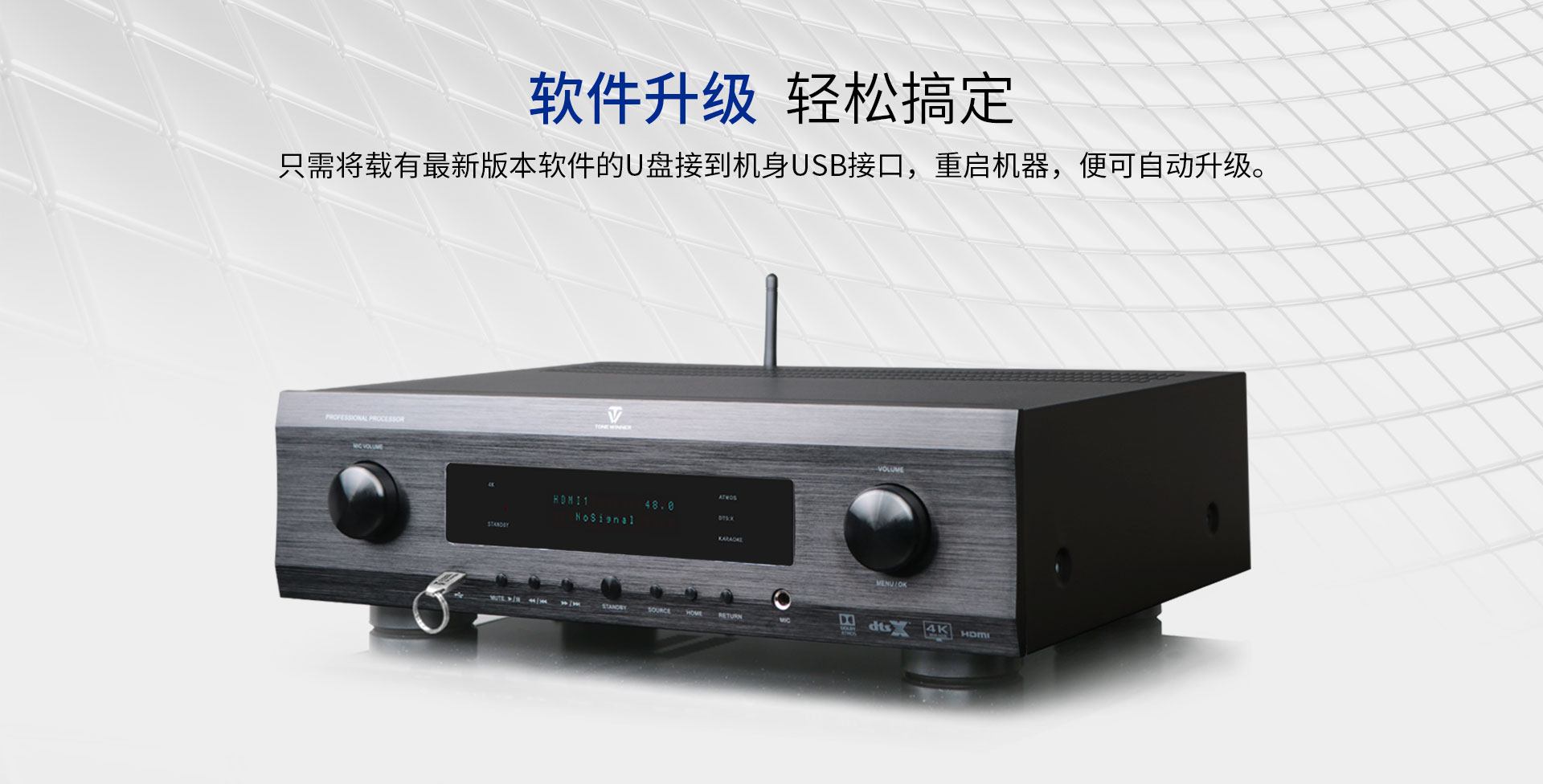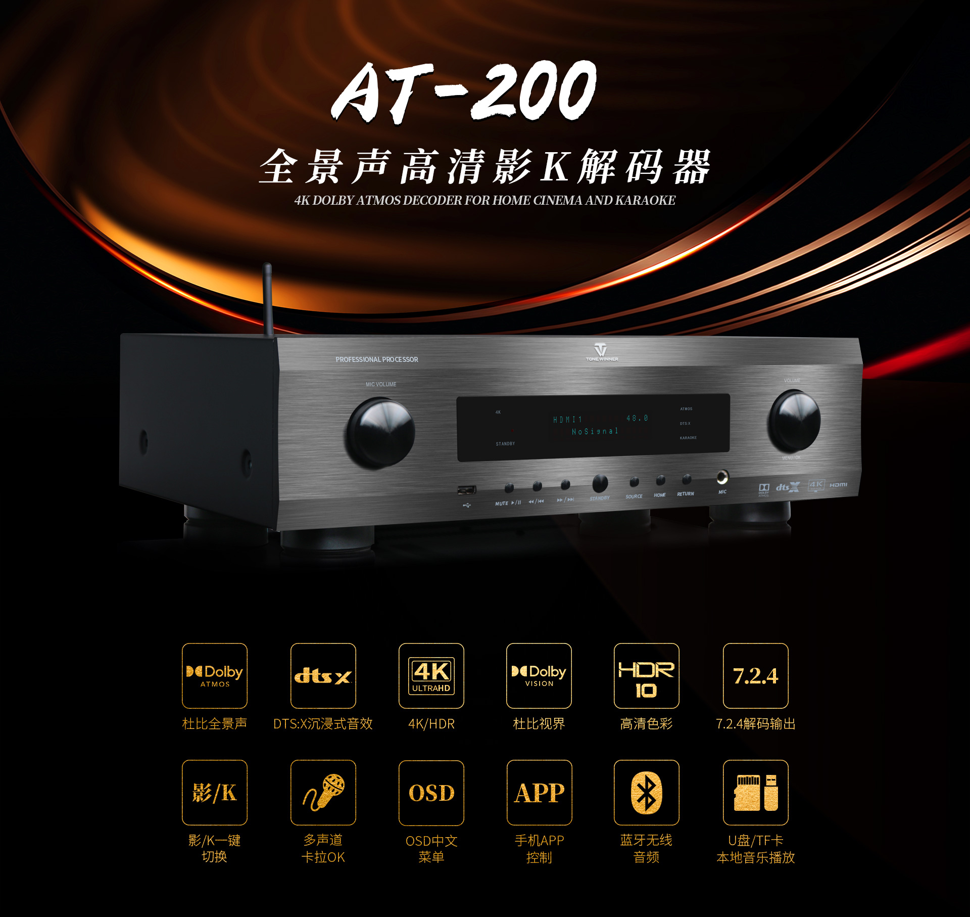 AT-200全景聲高清影K解碼器 一、整機特點 AT-200是一款7.2.4專業級全景聲3D超高清影K一體音視頻解碼器,是由美國THX認證工程師親自帶隊研發設計,且獲得并通過美國Dolby Atmos、DTS:X、HDMI2.0高清音視頻認證,是專為組建專業商用級分體式功放的頂級電影院、別墅定制高清影院、追求極致三維音效和高保真、臨場感更為突出的影院市場研發的一款多功能、高性價比、能和當前世界上最先進的杜比全景聲、DTS沉浸式音效音頻解碼技術同步的影K一體音視頻解碼器。 集影院系統、音樂中心、專業卡拉OK于一體的超高清影音中心機;支持Dolby Atmos(杜比全景聲音效)及DTS:X(沉浸式音效),支持4K視頻技術,兼容3D、HDR10、Dolby Vision等視頻格式;擁有完善的音視頻矩陣編組功能;HDMI2.0六進兩出,各輸入組獨立編組,模式、音量、卡拉OK獨立編組記憶,獨立調節;智能房間聲學特性掃描;同時具有U盤、TF卡本地播放,ARC音頻回傳、藍牙無損傳輸、支持多種無損及高壓縮音頻格式;手機APP控制、RS232智能中控;專業級7.1.4聲道沉浸式卡拉OK效果行業首創,同時支持外接效果器;