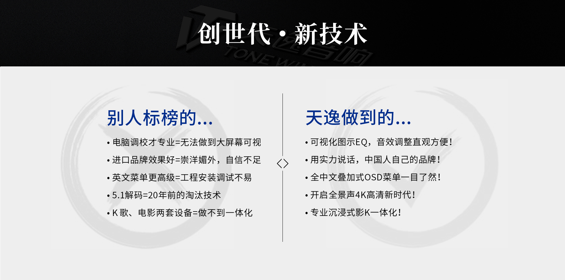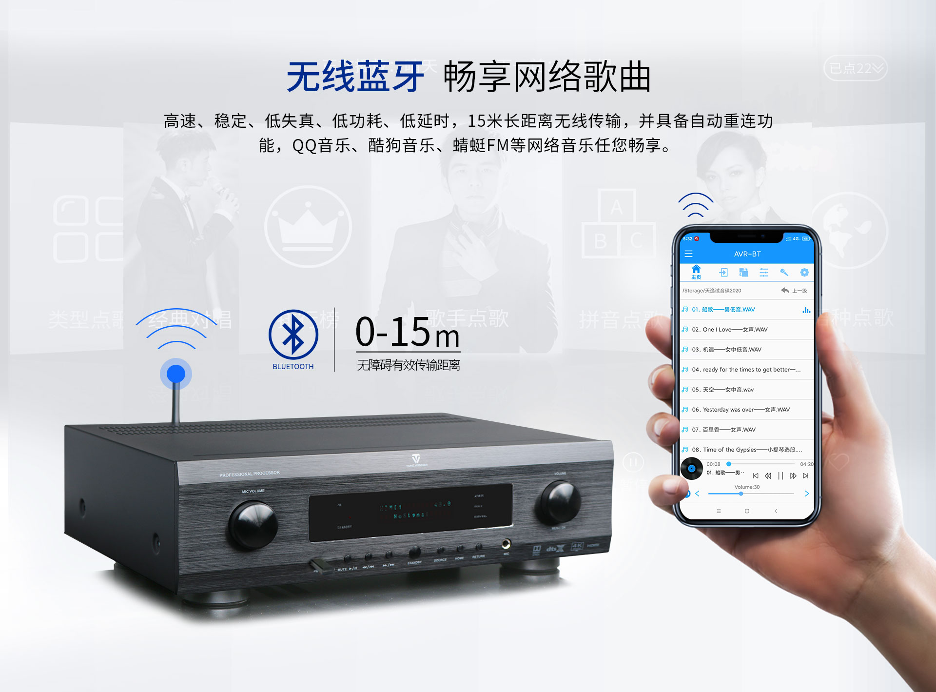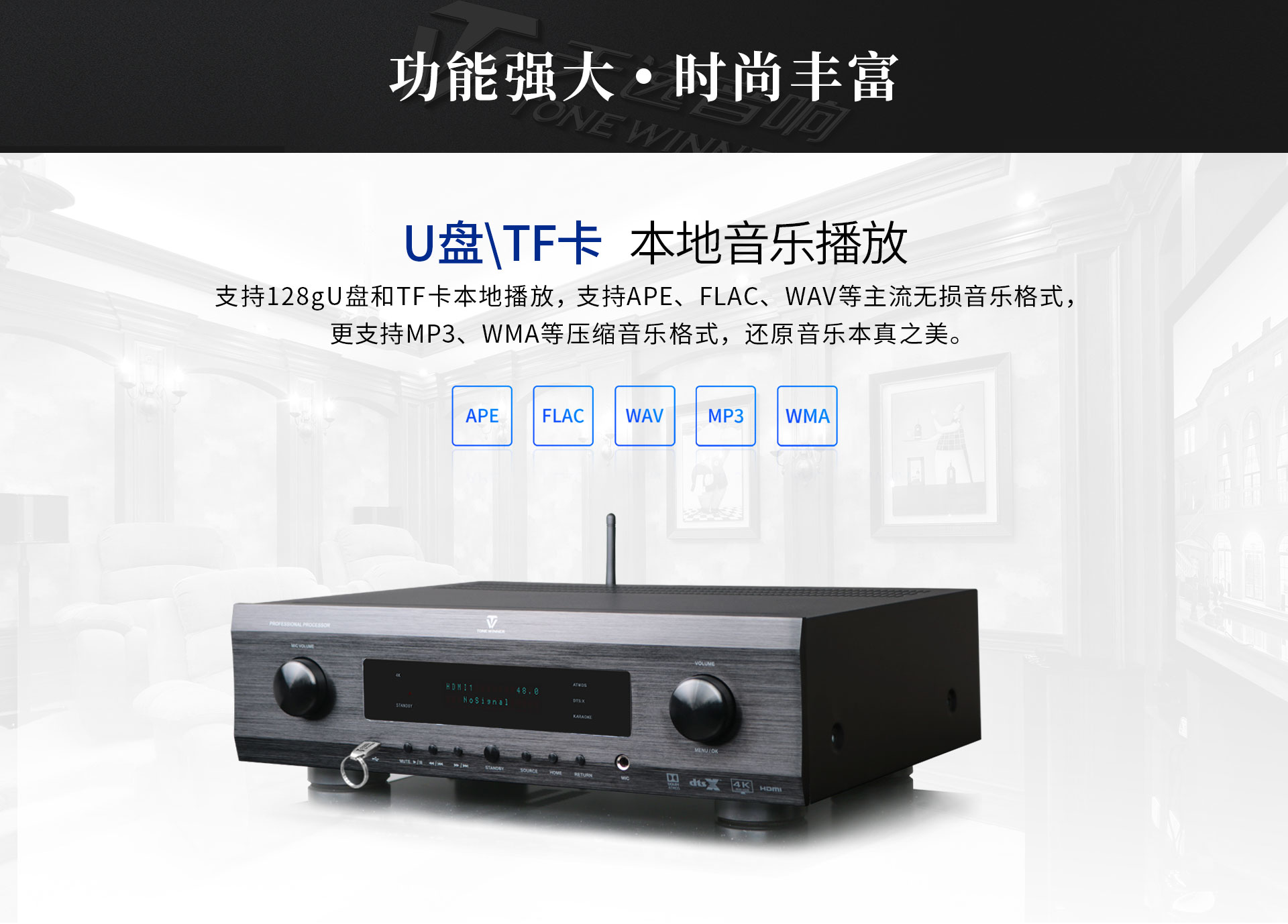 AT-200全景聲高清影K解碼器 一、整機特點 AT-200是一款7.2.4專業級全景聲3D超高清影K一體音視頻解碼器,是由美國THX認證工程師親自帶隊研發設計,且獲得并通過美國Dolby Atmos、DTS:X、HDMI2.0高清音視頻認證,是專為組建專業商用級分體式功放的頂級電影院、別墅定制高清影院、追求極致三維音效和高保真、臨場感更為突出的影院市場研發的一款多功能、高性價比、能和當前世界上最先進的杜比全景聲、DTS沉浸式音效音頻解碼技術同步的影K一體音視頻解碼器。 集影院系統、音樂中心、專業卡拉OK于一體的超高清影音中心機;支持Dolby Atmos(杜比全景聲音效)及DTS:X(沉浸式音效),支持4K視頻技術,兼容3D、HDR10、Dolby Vision等視頻格式;擁有完善的音視頻矩陣編組功能;HDMI2.0六進兩出,各輸入組獨立編組,模式、音量、卡拉OK獨立編組記憶,獨立調節;智能房間聲學特性掃描;同時具有U盤、TF卡本地播放,ARC音頻回傳、藍牙無損傳輸、支持多種無損及高壓縮音頻格式;手機APP控制、RS232智能中控;專業級7.1.4聲道沉浸式卡拉OK效果行業首創,同時支持外接效果器;