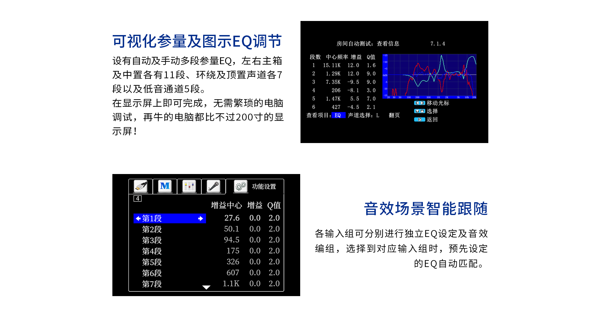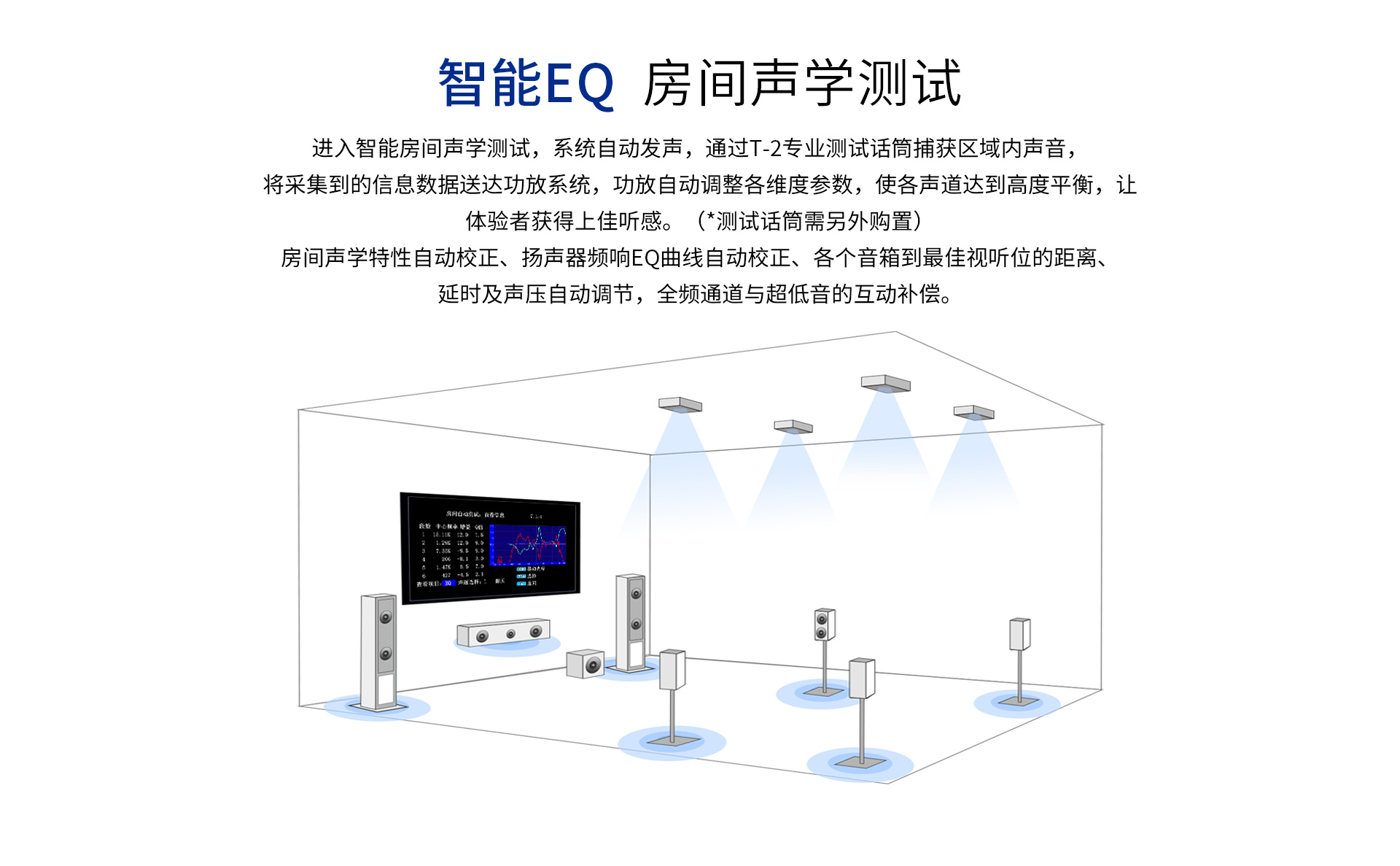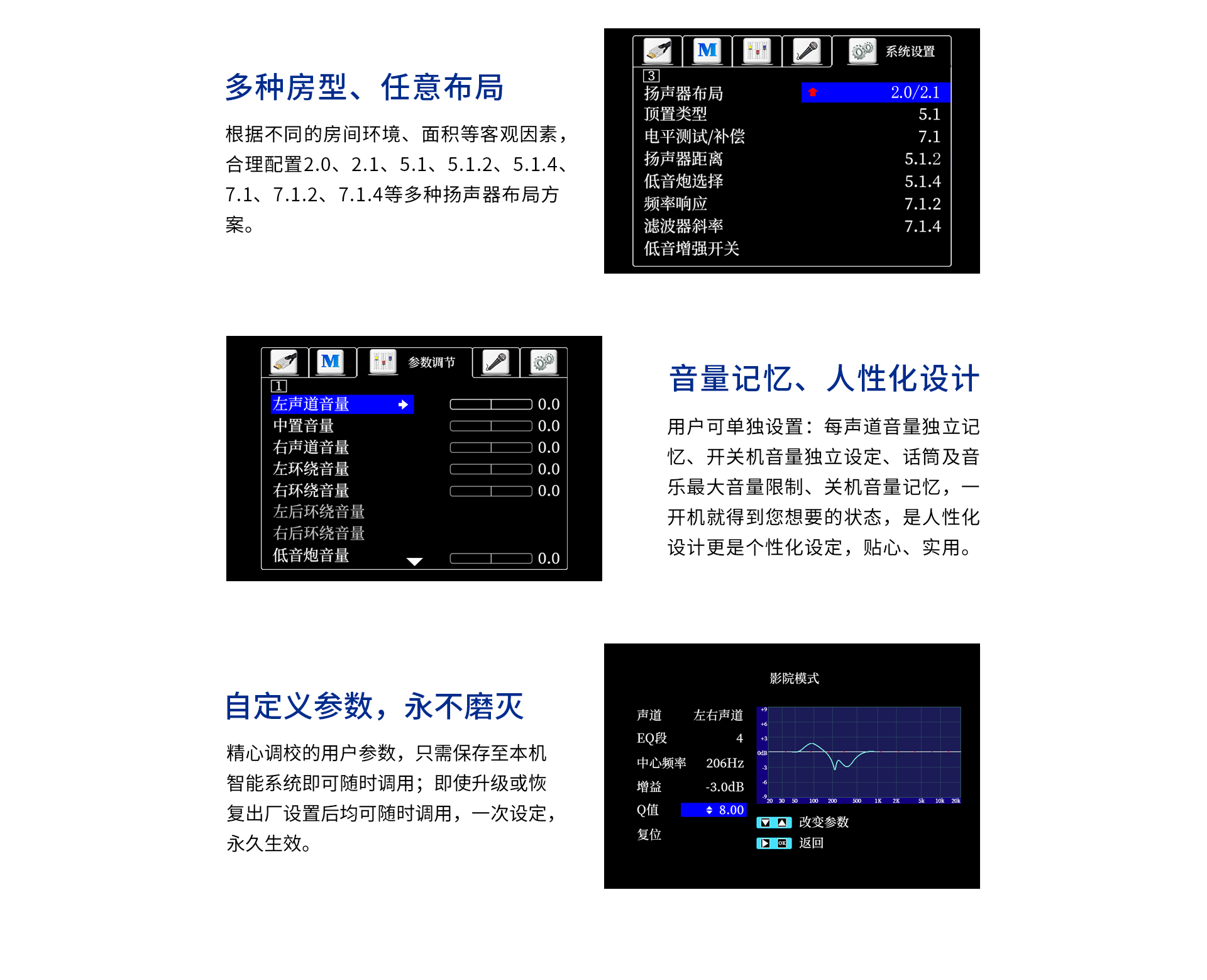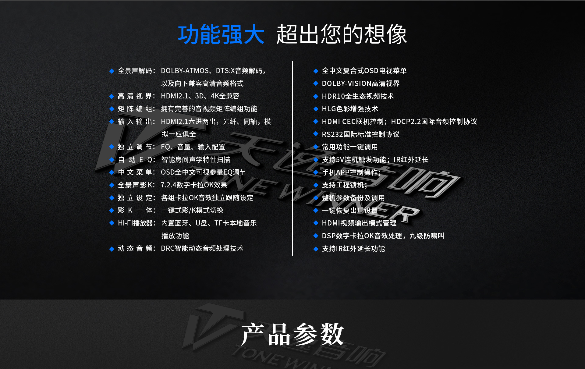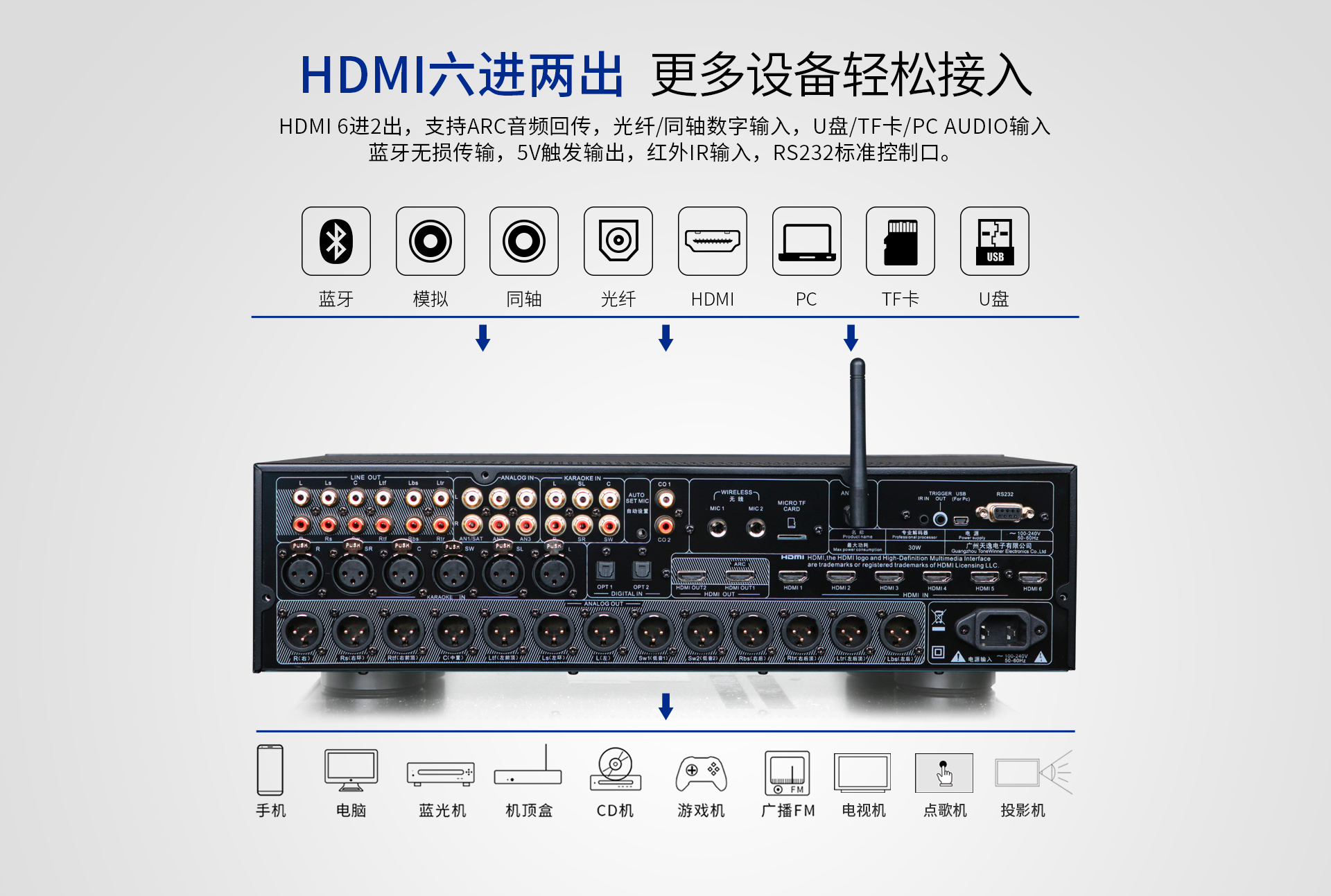 二、功能概述 音頻處理部分:1、 支持先進的DOLBY-ATMOS、DTS:X音頻解碼,以及向下兼容所有高清音頻格式解碼;包括 Dolby True-HD、Dolby Digital Plus、DTS Master、DTS HI RES等等。 2、 擁有完善的音視頻矩陣編組功能。 3、 HDMI2.0六進兩出,各輸入組獨立編組,模式、音量、卡拉OK獨立編組記憶,獨立調節; 4、 智能房間聲學特性掃描; 5、 OSD全中文5段(低音) + 11段(全頻通道)EQ調節,參量與圖示同步顯示。 6、 各輸入組EQ獨立選定及調節; 7、 卡拉OK開關獨立跟隨設定。 8、 具備最長1000毫秒唇音同步技術; 9、 強大的低頻管理:前置、中置、環繞、后置、天空聲道分組獨立調節慮波器拐點、斜率;低音增強等功能; 10、 根據需求可實現多種聲場布局: 5.1、5.1.2、5.1.4、7.1、7.1.2、7.1.4 11、 專業級7.2.4全平衡以及RCA端子輸出; 12、 一鍵式影/K模式切換(內置效果器、外置純人聲、外置效果器三種選擇); 13、 卡拉OK音量及音樂音量開關機設定; 14、 7.2.4沉浸式數字卡拉OK效果;DSP數字卡拉OK音效處理,九級防嘯叫; 15、 支持外置效果器接入,并可實現獨立編組, 16、 全平衡以及RCA端口外置效果器輸入; 17、 內置藍牙音樂無線傳輸功能; 18、 內置U盤、TF卡本地音樂播放功能; 19、 USB外置聲卡功能,直接電腦數字音頻輸入; 20、 支持HDMI ARC音頻回傳; 21、 支持2組光纖,2組同軸,3組立體聲多功能音頻輸入; 22、 DRC智能動態音頻處理技術; 視頻處理部分: 1、HDMI2.0六進兩出;支持音視頻矩陣編組管理; 2、支持3D、4K超高清視頻傳輸及處理,同時向下兼容所有視頻格式; 3、DOLBY-VISION高清視界; 4、HDR10、HDR10全生態視頻技術 5、HLG色彩增強技術 6、復合式中文OSD大屏顯示菜單管理及設置; 7、HDMI CEC聯機控制; 8、HDMI視頻輸出模式管理; 其他功能: 1、 支持RS232國際標準控制協議; 2、 多種常用功能一鍵調用; 3、支持IR紅外延長功能(需額外購買紅外延長器(延長器無需獨立供電); 4、支持5V連機觸發功能; 5、支持待機直通功能; 6、支持HDCP2.2國際音頻控制協議; 7、手機APP控制操作; 8、開關機狀態記憶功能; 9、支持工程鎖機; 10、支持整機參數備份及調用; 11、支持一鍵恢復出廠設置; 12、支持用戶參數保存及調用設置; 三:性能參數 型號:AT-200