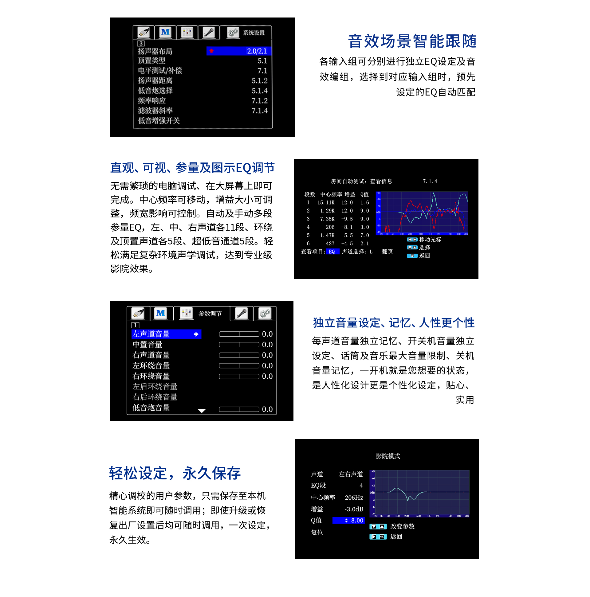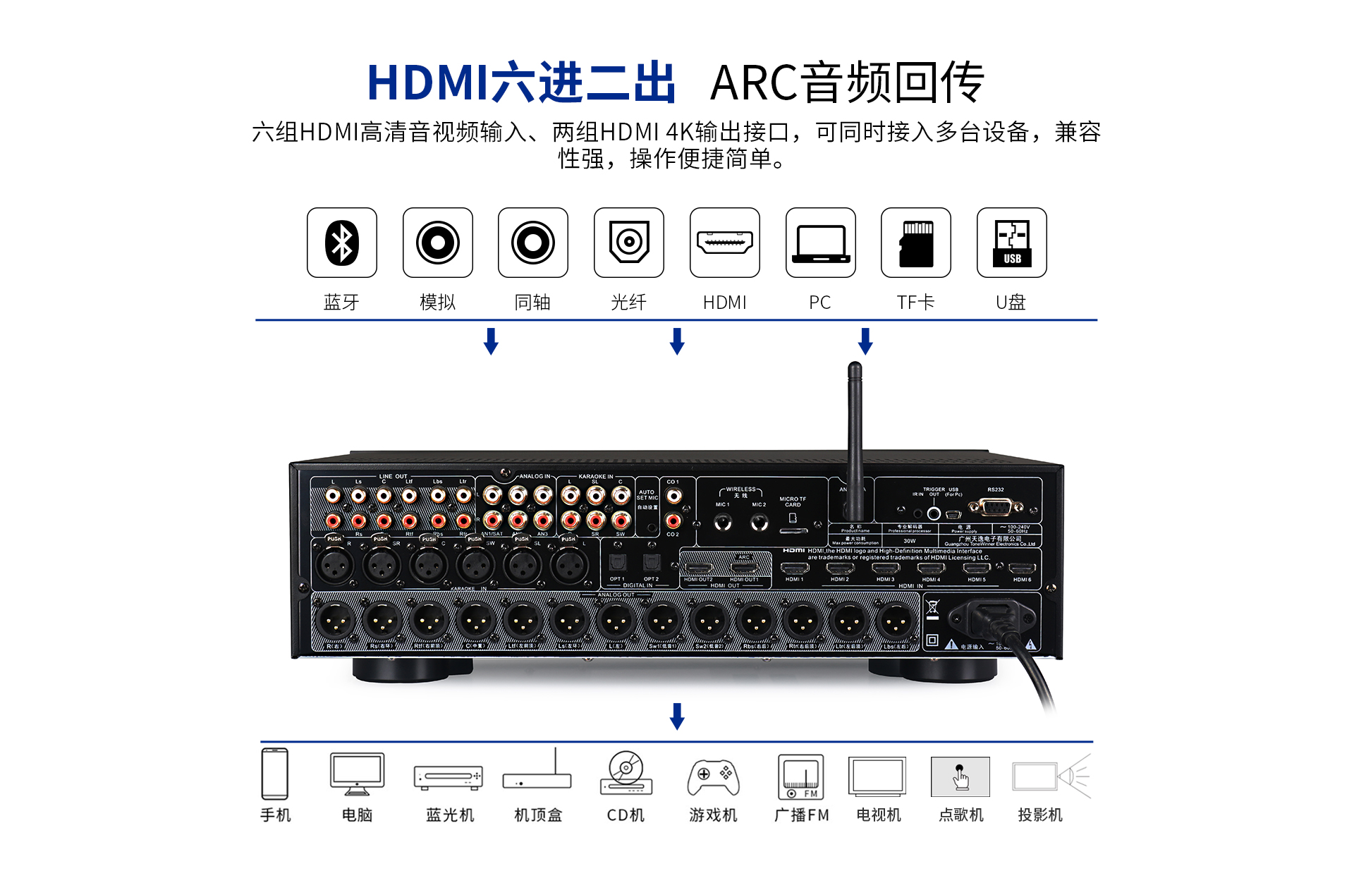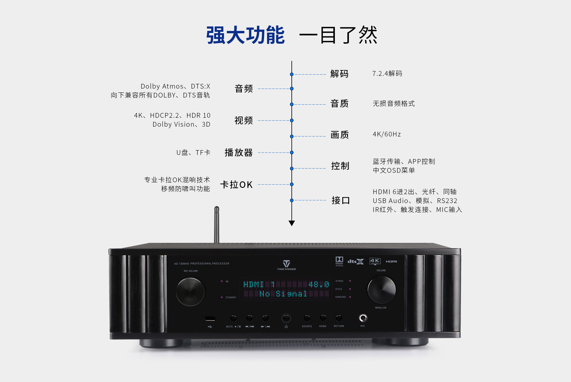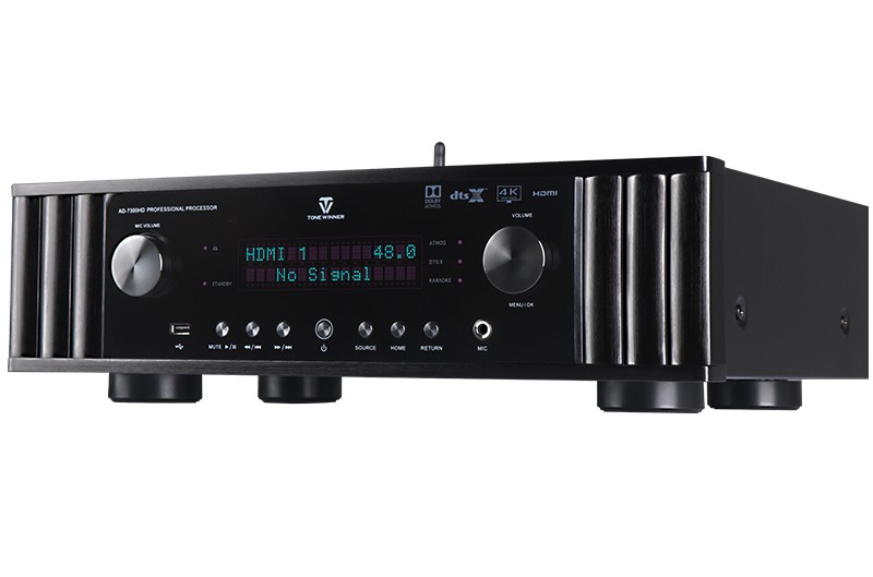 二、 功能特點 1. 支持Dolby Atmos、DolbyTrue-HD及向下兼容所有杜比音頻編碼文件; 2. 支持DTS:X、DTS-Master及向下兼容所有DTS音頻編碼文件; 3. 支持HDCP2.2; 4. 支持4K/60Hz,RGB 4:4:4,18GHz全帶寬高清視頻信號; 5. 支持Dolby Vision及HDR 10高清視頻信號; 6. 支持從2.0聲道到7.1.4聲道等10多種揚聲器配置;輕松體驗環境三維音效; 7. 支持7.2.4解碼輸出,全平衡輸出; 8. 內置藍牙數字音頻接收器,支持藍牙傳輸; 9. 支持HDMI 6進2出,光纖、同軸、USB、模擬輸入,一應俱全; 10. 內置音視頻獨立矩陣編組,做到內部互編和外部接入; 11. 一鍵切換影/K模式; 12. 房間EQ、揚聲器距離、延時、聲壓的自動測試及補償,一鍵式操作,全自動校正,同時支持用戶手動個性化調節; 13. 專業卡拉OK混響技術移頻防嘯叫功能; 14. 內置高品質音樂播放器;支持TF卡及U盤音頻文件播放,支持FLAC、APE、WAV、MP3等多種無損及有損壓縮音頻格式; 15. 支持手機APP操作; 16. 全中文疊加式OSD屏幕顯示菜單; 17. 支持RS232智能控制連接;