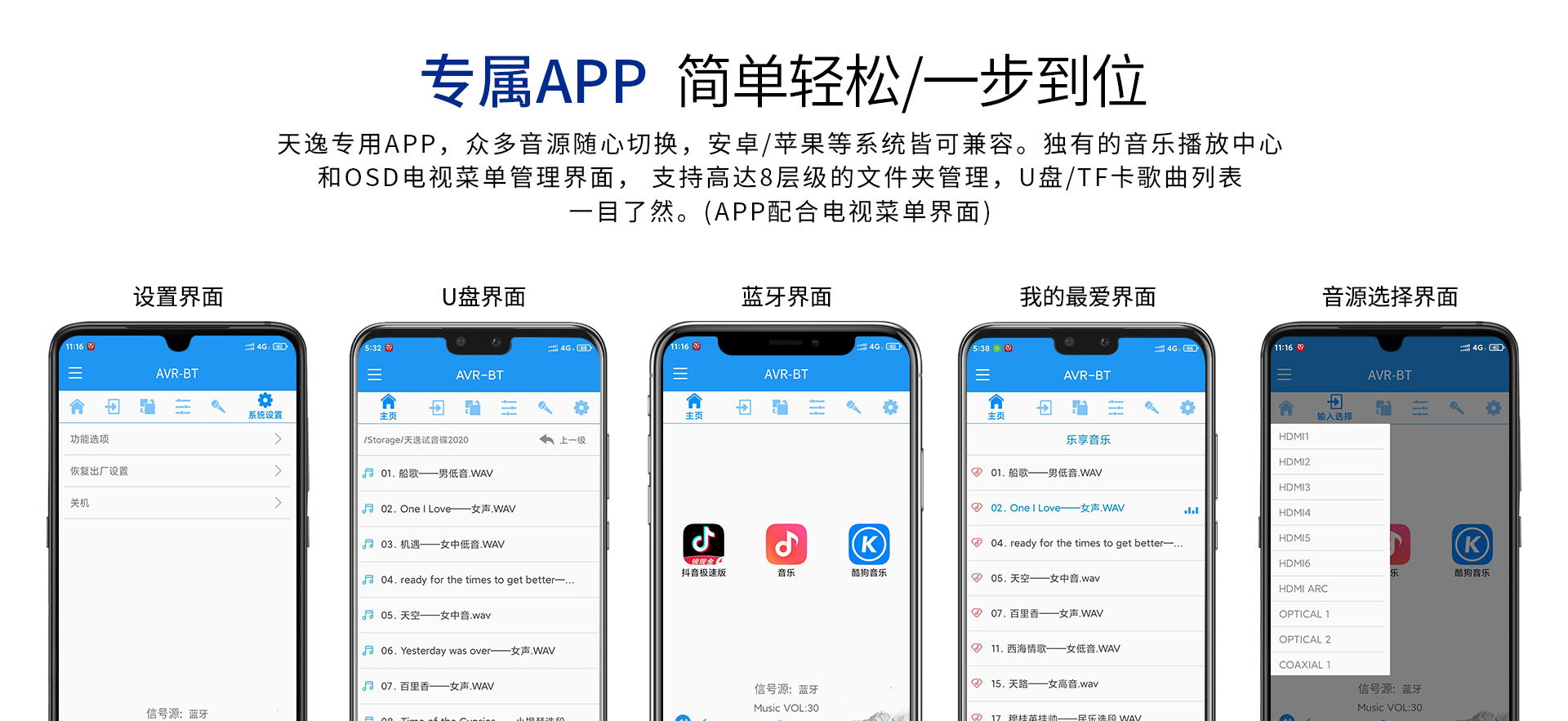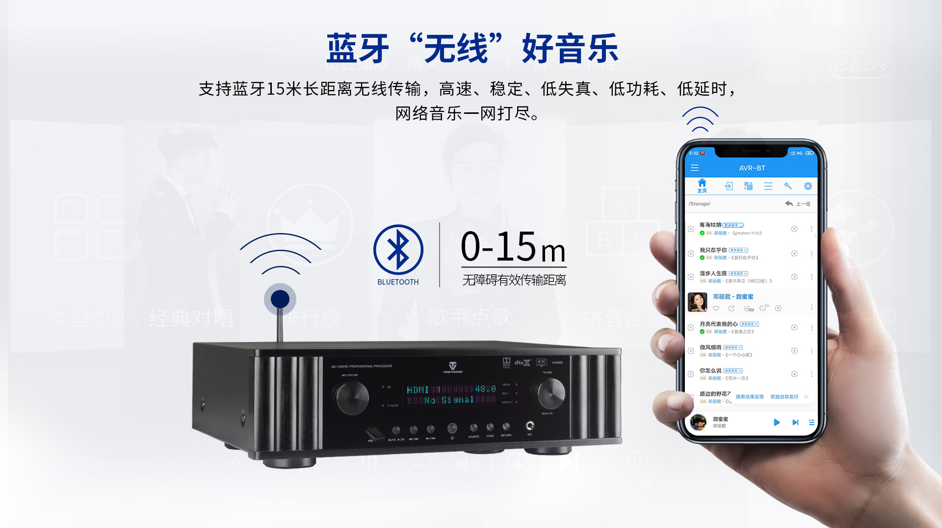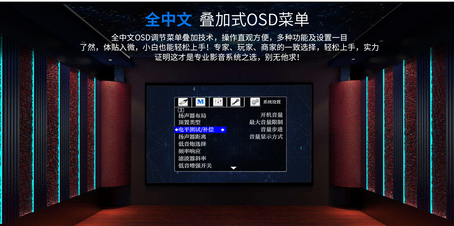 二、 功能特點 1. 支持Dolby Atmos、DolbyTrue-HD及向下兼容所有杜比音頻編碼文件; 2. 支持DTS:X、DTS-Master及向下兼容所有DTS音頻編碼文件; 3. 支持HDCP2.2; 4. 支持4K/60Hz,RGB 4:4:4,18GHz全帶寬高清視頻信號; 5. 支持Dolby Vision及HDR 10高清視頻信號; 6. 支持從2.0聲道到7.1.4聲道等10多種揚聲器配置;輕松體驗環境三維音效; 7. 支持7.2.4解碼輸出,全平衡輸出; 8. 內置藍牙數字音頻接收器,支持藍牙傳輸; 9. 支持HDMI 6進2出,光纖、同軸、USB、模擬輸入,一應俱全; 10. 內置音視頻獨立矩陣編組,做到內部互編和外部接入; 11. 一鍵切換影/K模式; 12. 房間EQ、揚聲器距離、延時、聲壓的自動測試及補償,一鍵式操作,全自動校正,同時支持用戶手動個性化調節; 13. 專業卡拉OK混響技術移頻防嘯叫功能; 14. 內置高品質音樂播放器;支持TF卡及U盤音頻文件播放,支持FLAC、APE、WAV、MP3等多種無損及有損壓縮音頻格式; 15. 支持手機APP操作; 16. 全中文疊加式OSD屏幕顯示菜單; 17. 支持RS232智能控制連接;
