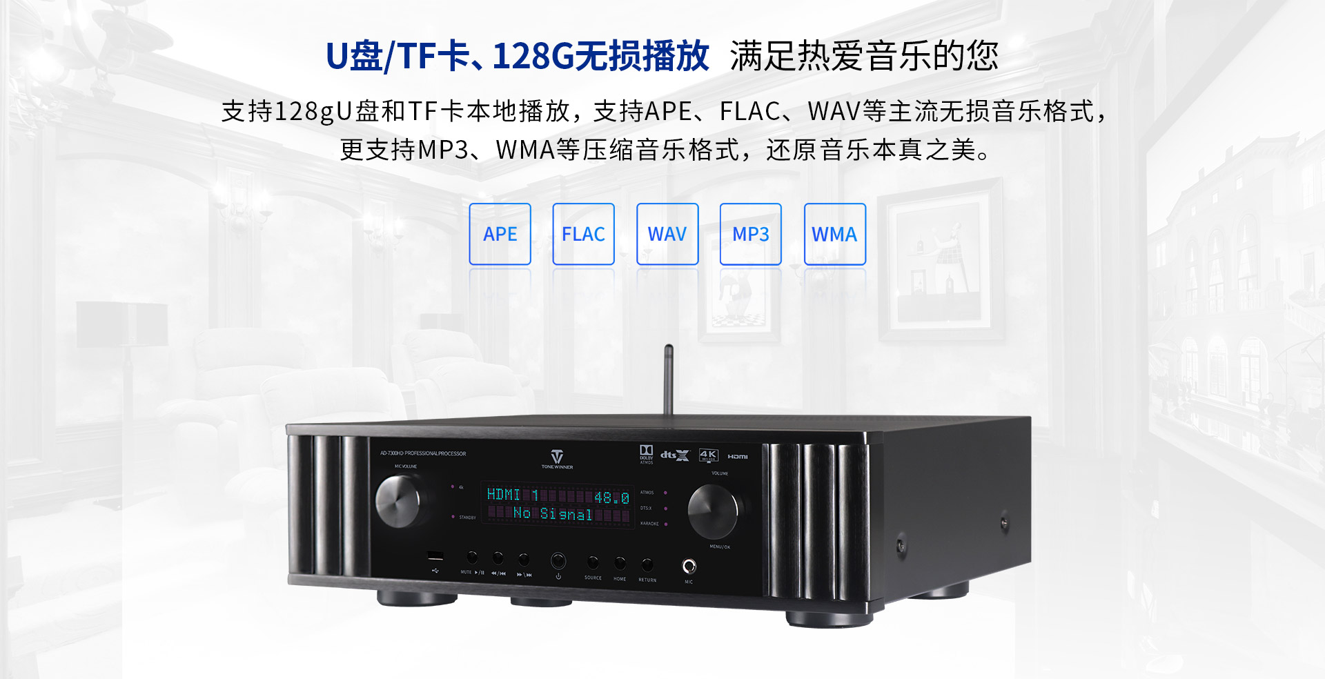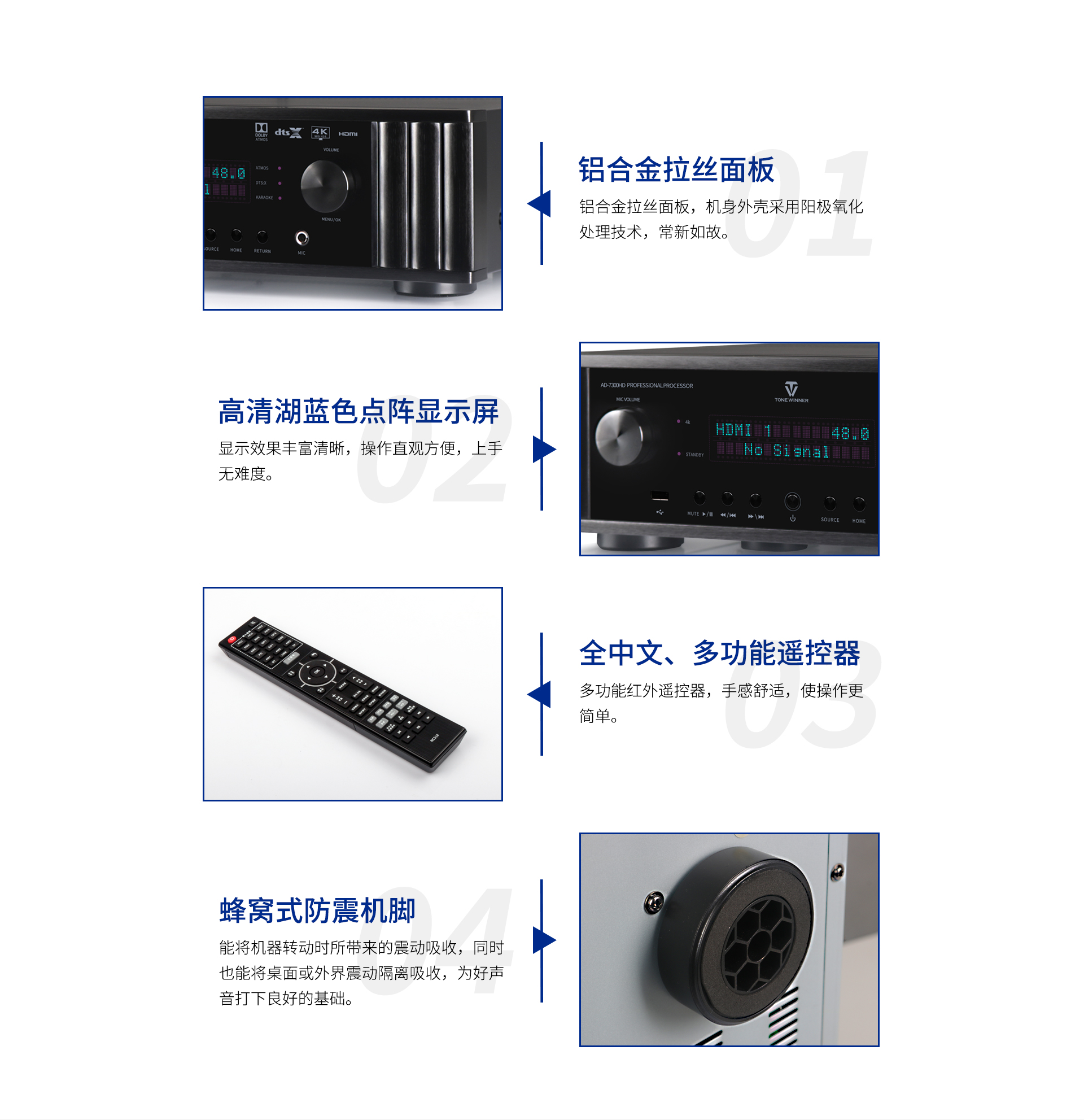 一、外觀特點 AD-7300HD采用內斂奢華的雅致黑為主色調,前面板在燈光的映射下熠熠閃光,既時尚又典雅,透露著端莊穩重的大家風范!